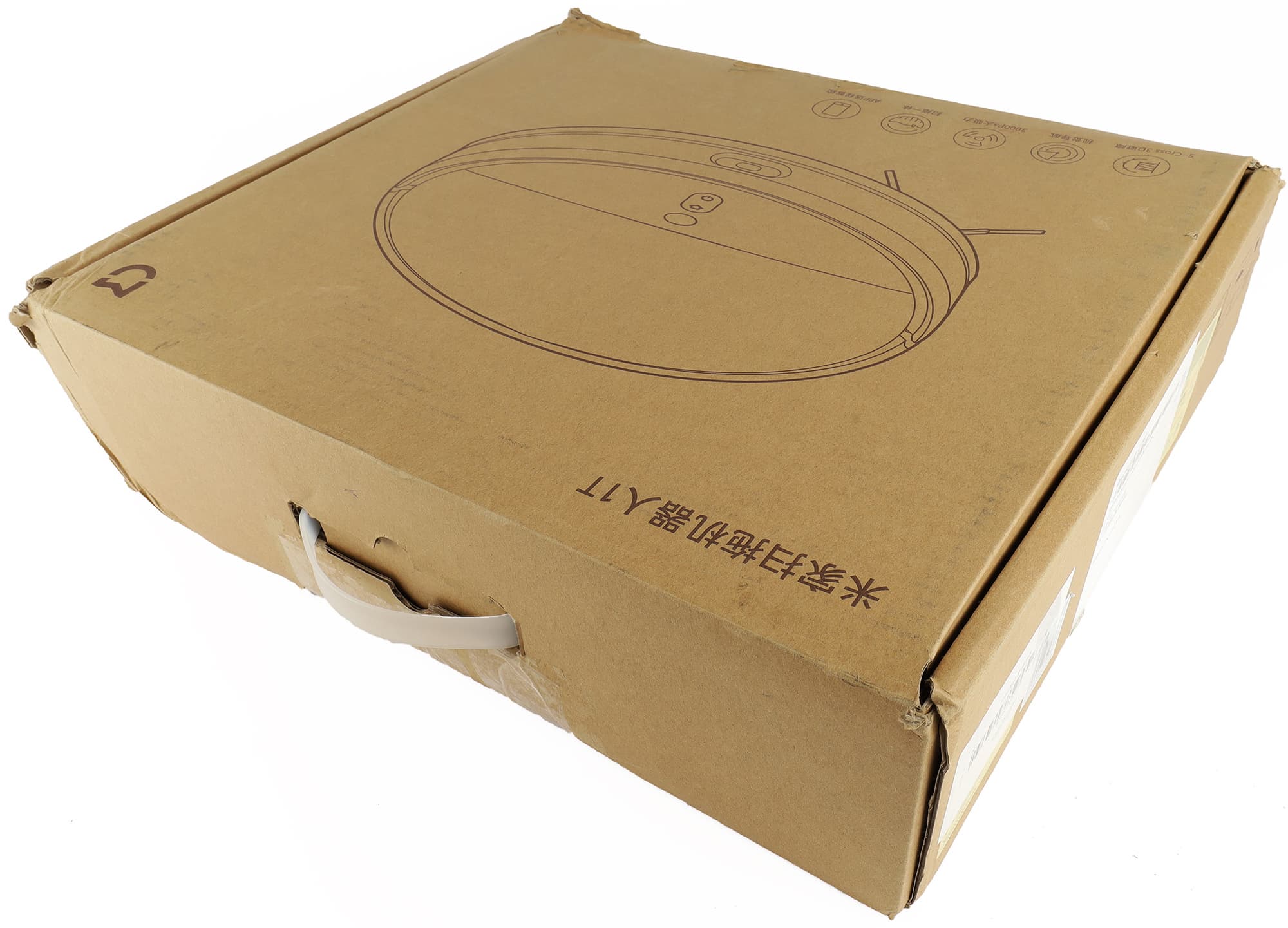 Пылесос упакован в коричневую картонную коробку со схематическим изображением устройства на лицевой стороне. Помимо индекса модели «1T» на ней нет ни единого латинского символа — только иероглифы.