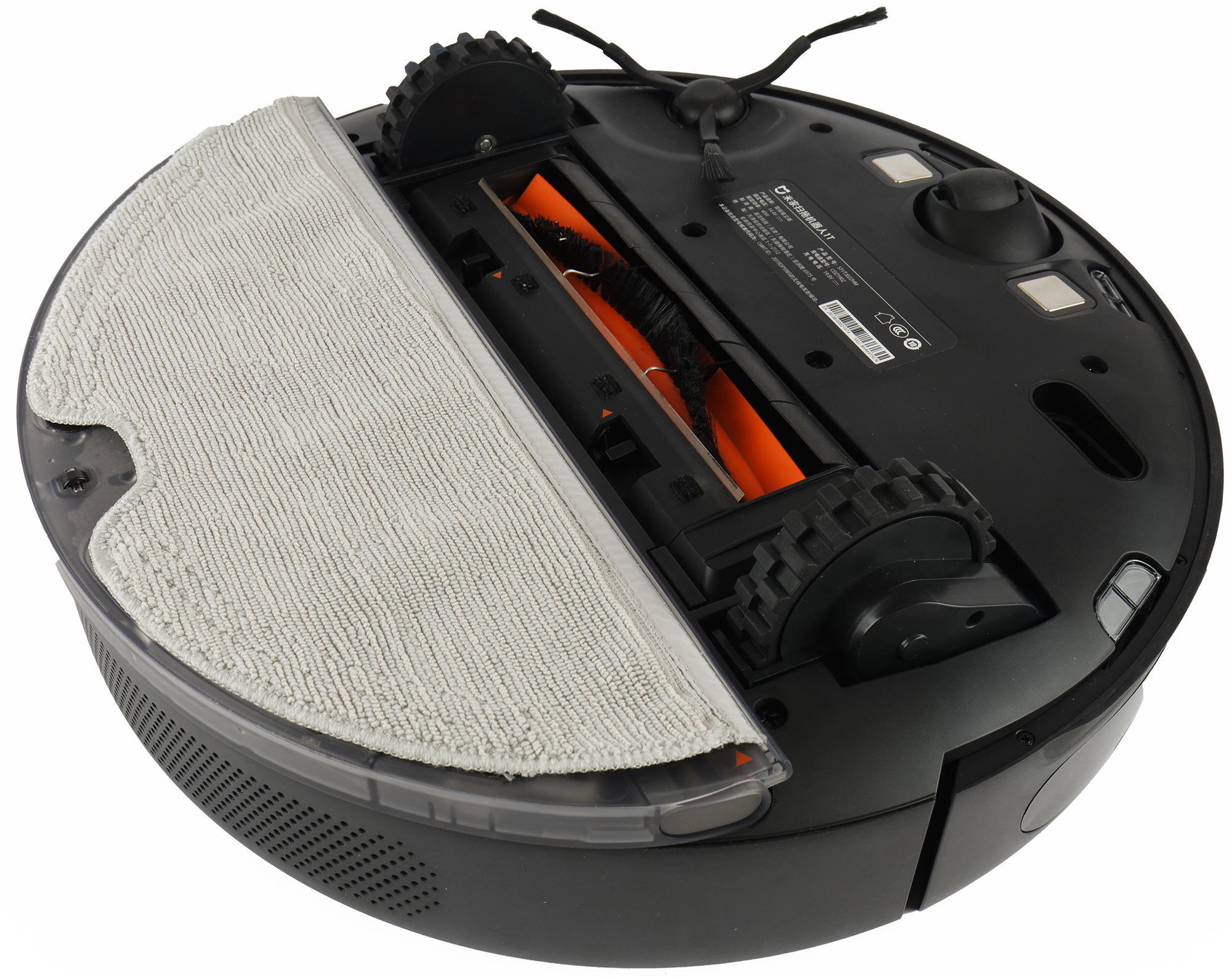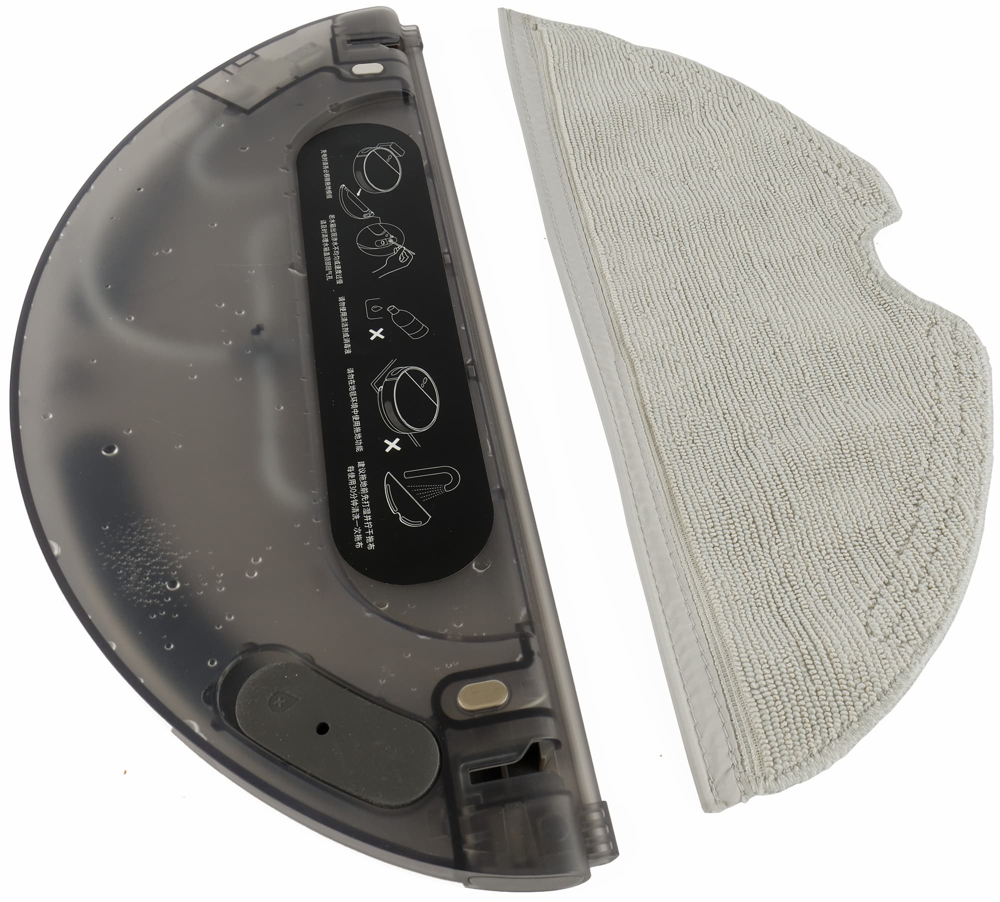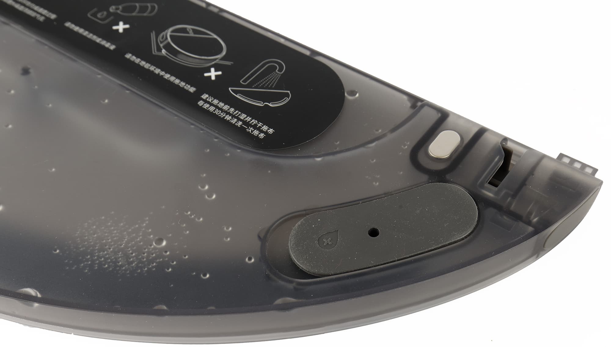 Блок для влажной уборки представляет собой неглубокий D-образный контейнер, пристегивающийся к дну корпуса на защелках. На его верхней стороне есть контакты для питания внутреннего моторчика, нагнетающего воду при мытье пола, и заливная горловина, закрытая силиконовой пробкой.