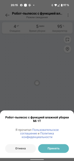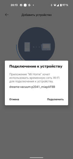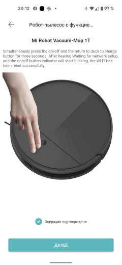 В остальном подключение прошло гладко: по команде приложения мы зажали обе кнопки на верхней панели и дождались, пока пылесос войдет в режим сопряжения. На этом этапе устройство создает временную Wi-Fi-сеть и предлагает к ней подключиться. Установив соединение, приложение передало в прибор настройки офисной сети, и через полминуты процесс синхронизации успешно завершился.