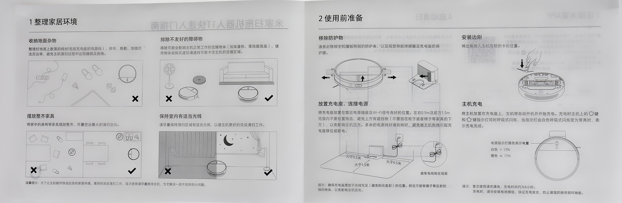 Ценной, с нашей точки зрения, информацией, почерпнутой из иллюстрированного руководства, является необходимость запускать уборку при дневном или искусственном освещении: действительно, Mijia 1T оснащен оптическими датчиками, работающими в видимом диапазоне, и малоэффективен в темноте.