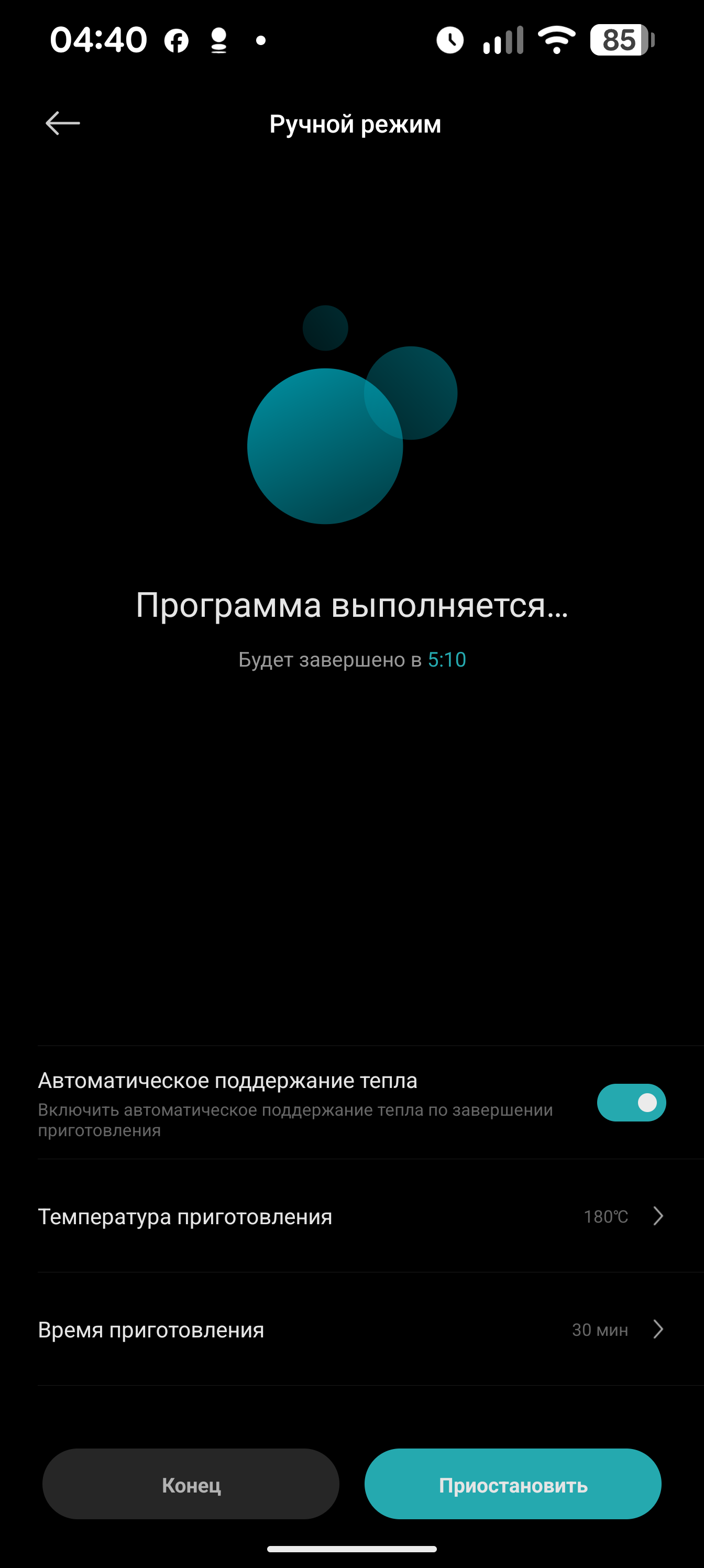 При создании сценария в ручном режиме аэрогриль позволяет установить температуру приготовления (в диапазоне от 40 до 200 °C с шагом в 5 °C) и время работы программы (от 1 минуты до 24 часов 59 минут). Здесь же можно включить или выключить автоматическое поддержание тепла: после завершение основного сценария устройство будет поддерживать температуру 60 °C в течение 30 минут. В процессе выполнения программы время и температуру при необходимости можно отрегулировать.