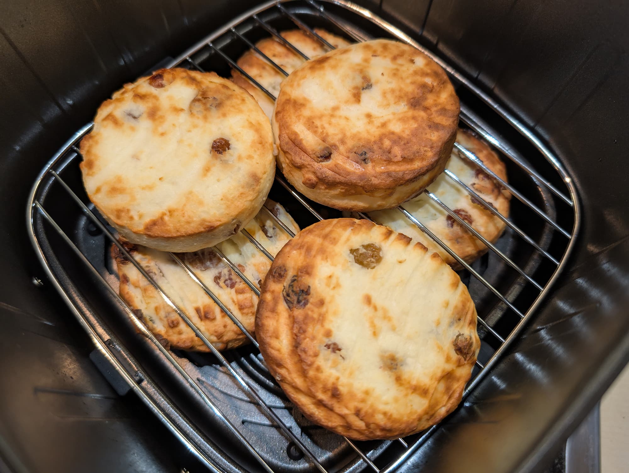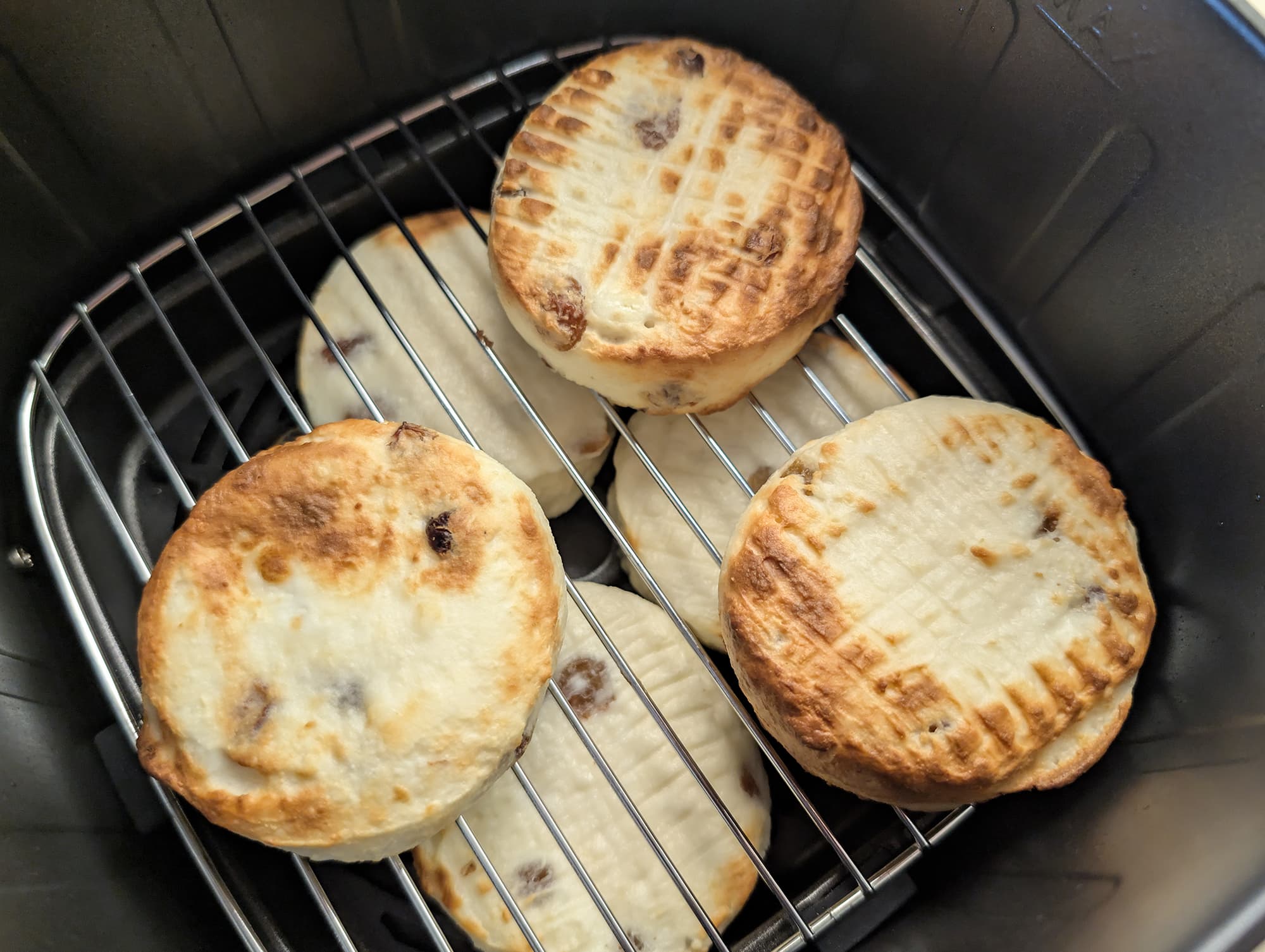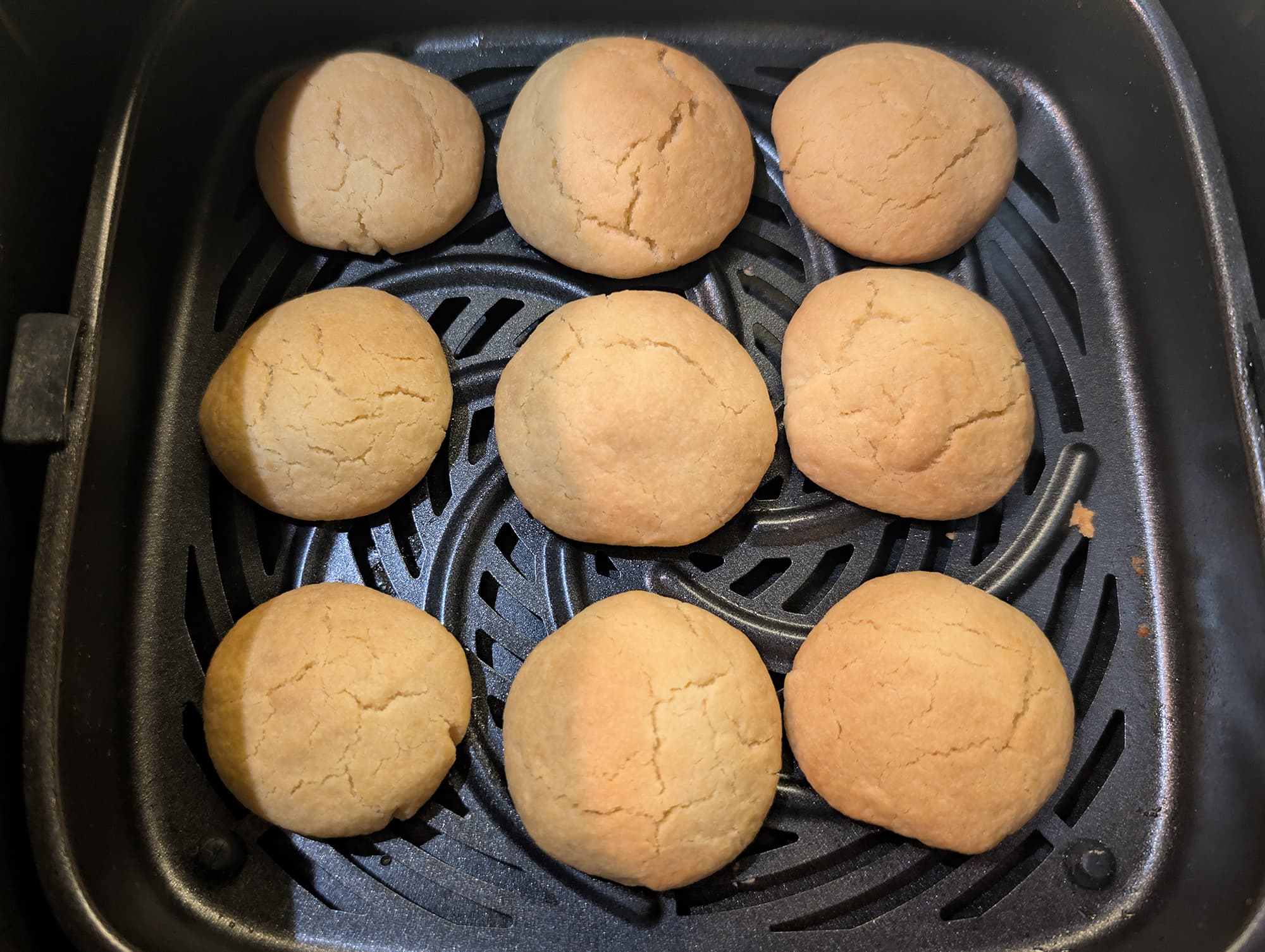 Чтобы поджарить в аэрогриле замороженные сырники, мы разложили их в два слоя — по три штуки на сетке и на решетке.