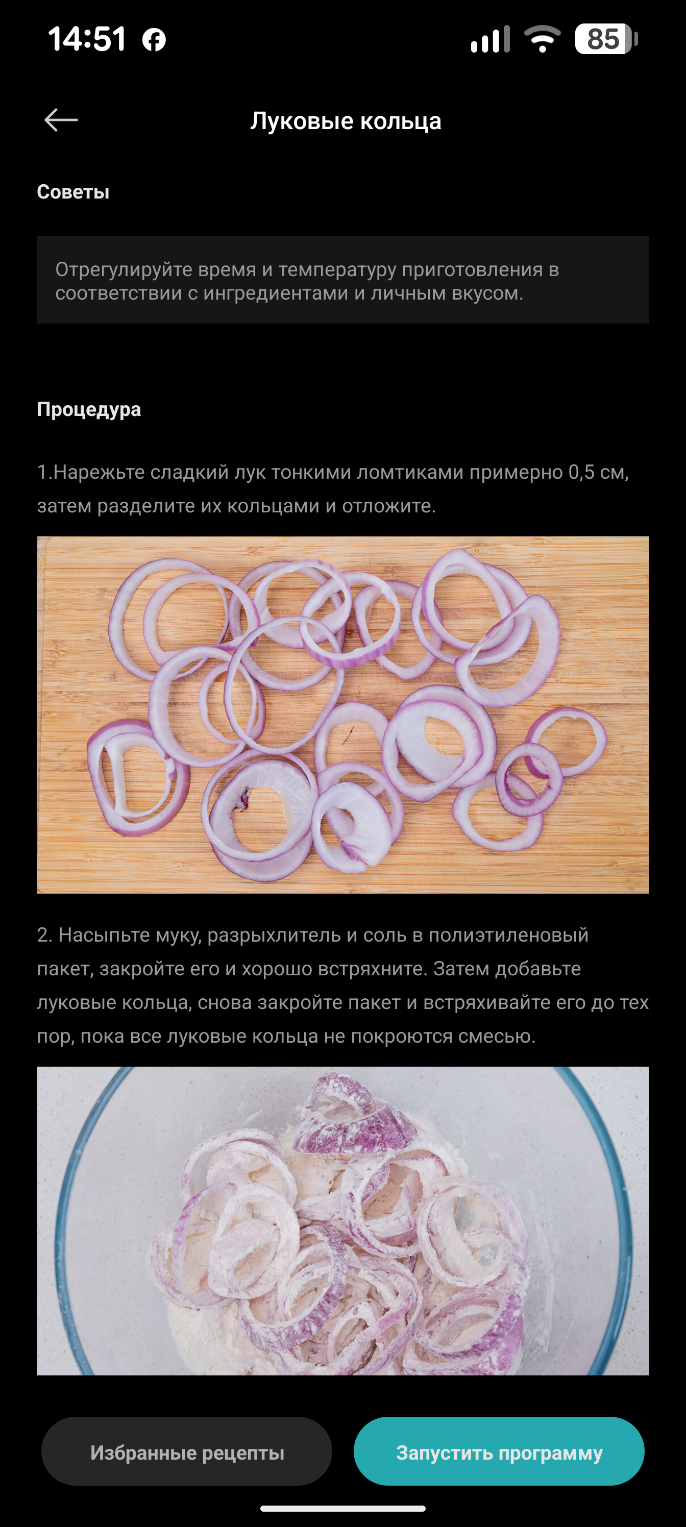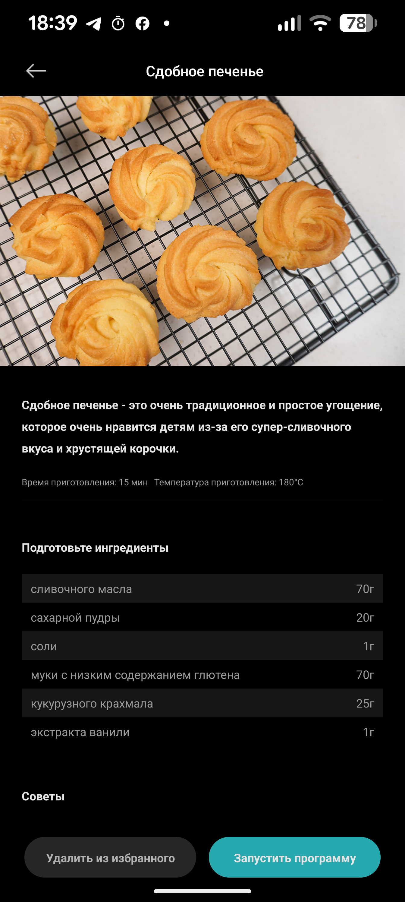 Каждый рецепт содержит список ингредиентов с подробным иллюстрированным описанием стадий приготовления и завершается фотографией с вариантом сервировки. Кнопки в нижней части экрана позволяют внести блюдо в избранное и запустить программу в нужном режиме на требуемое время.