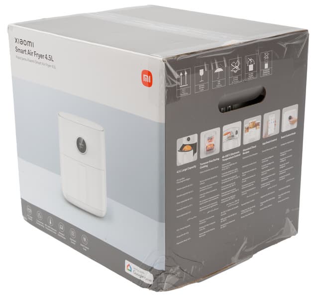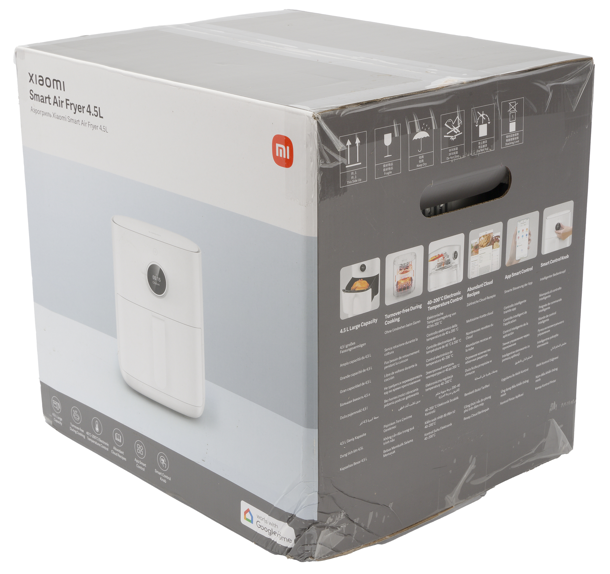 Аэрогриль упакован в картонную коробку с полноцветной печатью. На передней стороне производитель разместил фотографию включенного устройства и перечислил основные характеристики и достоинства модели. Среди них — емкость чаши (4,5 литра), отсутствие необходимости переворачивать еду в процессе приготовления, электронный контроль температуры в диапазоне от 40 до 200 °C, большое количество рецептов, доступных из приложения и управление с помощью многофункционального колеса.
