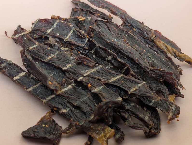 Автор рецепта, как видите, предлагает использовать вяленое мясо в качестве лакомства для поощрения домашних любимцев, но джерки из говядины любим погрызть и мы сами. Только нужно чуть скорректировать инструкцию.