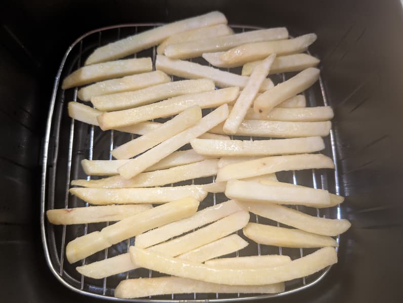 200 г замороженного картофеля мы, не размораживая, разложили на металлической сетке, смазали небольшим количеством растительного масла, добавили соль и запустили программу.