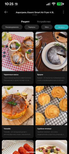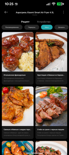 Коллекция рецептов, адаптированных для аэрогриля, поделена на разделы: «Перекусы», «Мясо» «Десерты», «Фрукты и овощи», «Морепродукты» и «Основные продукты питания» — по 15-20 блюд в каждом. Самые популярные из них отображаются на вкладке «Рекомендованное».