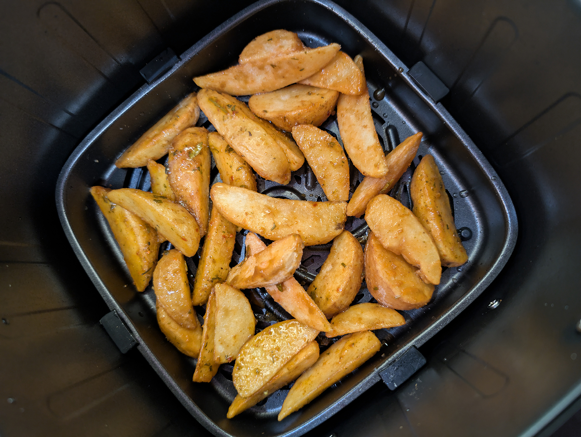Результат нас полностью удовлетворил: картофель приобрел хрусткую корочку, получился в меру поджаристым и нежирным.