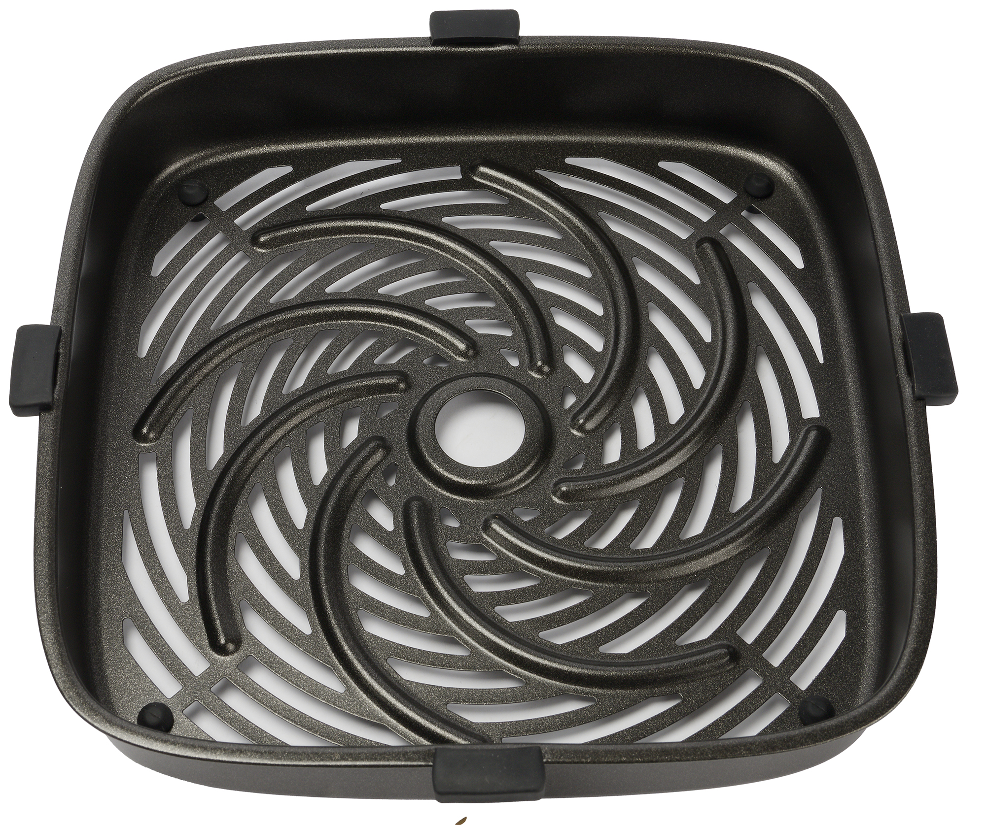 На боковых стенках решетки установлены силиконовые прокладки-уплотнители, защищающие покрытие от царапин. Форма трехмерной конструкция, как сообщает производитель, призвана создавать эффект циклона, что улучшает теплообмен и способствует более равномерному нагреву продуктов.