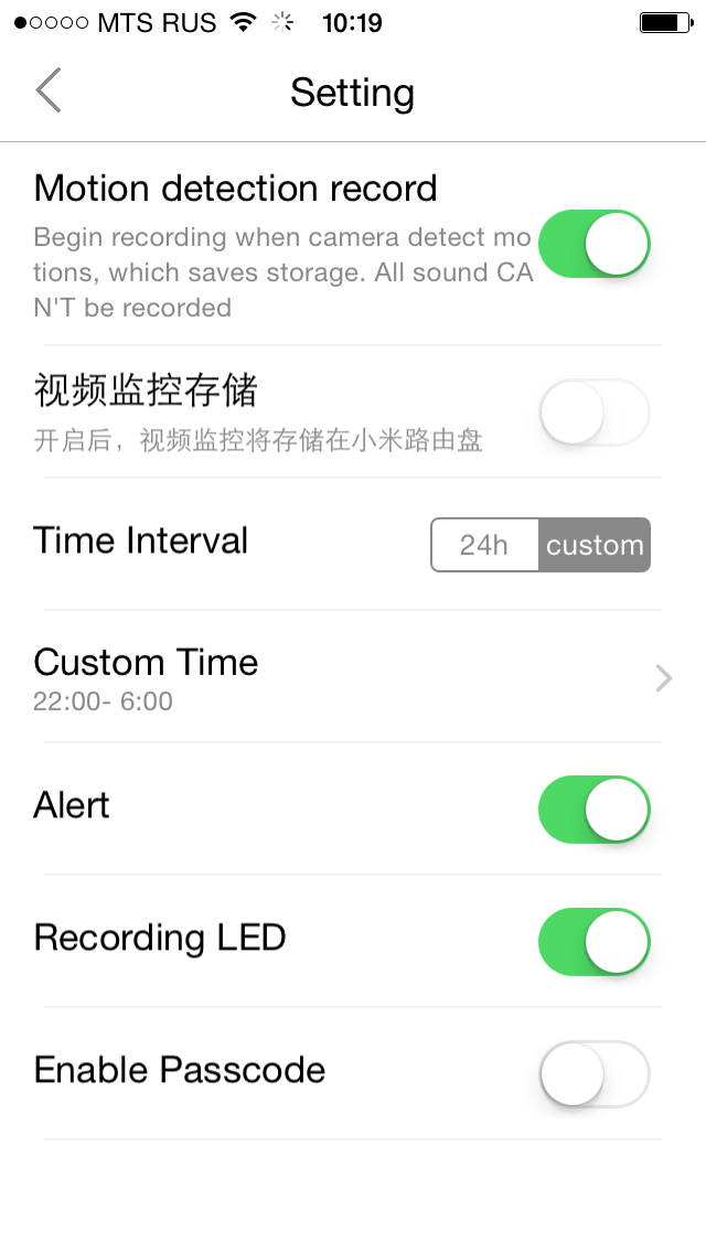 После подключения камеры к Xiaomi Smart Home, как и с розеткой, можно изменить некоторые параметры. Основной из них — название камеры. Следующий позволяет выбрать режим записи на установленную карту памяти. Эта операция может осуществляться непрерывно или же при обнаружении в кадре движения. Второй режим экономит место на карте памяти, однако не имеет никаких детальных настроек. Третья опция отвечает за возможность записи видеороликов на накопитель роутера Xiaomi. Предусмотрена отправка уведомлений в случае потери связи с камерой, отключение светодиодного индикатора и включение дополнительного пин-кода из четырех цифр для получения доступа к трансляции с камеры.