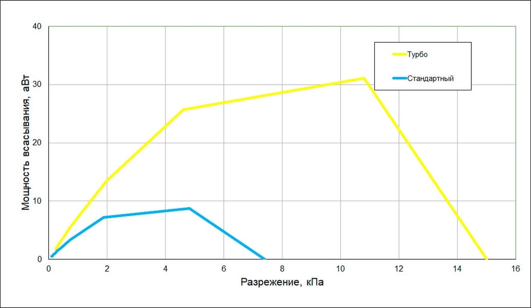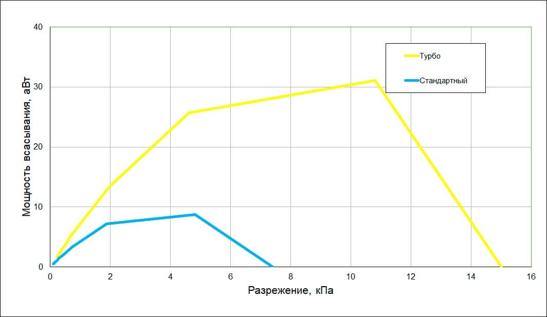Зависимость мощности всасывания от создаваемого разрежения приведена на графике ниже: