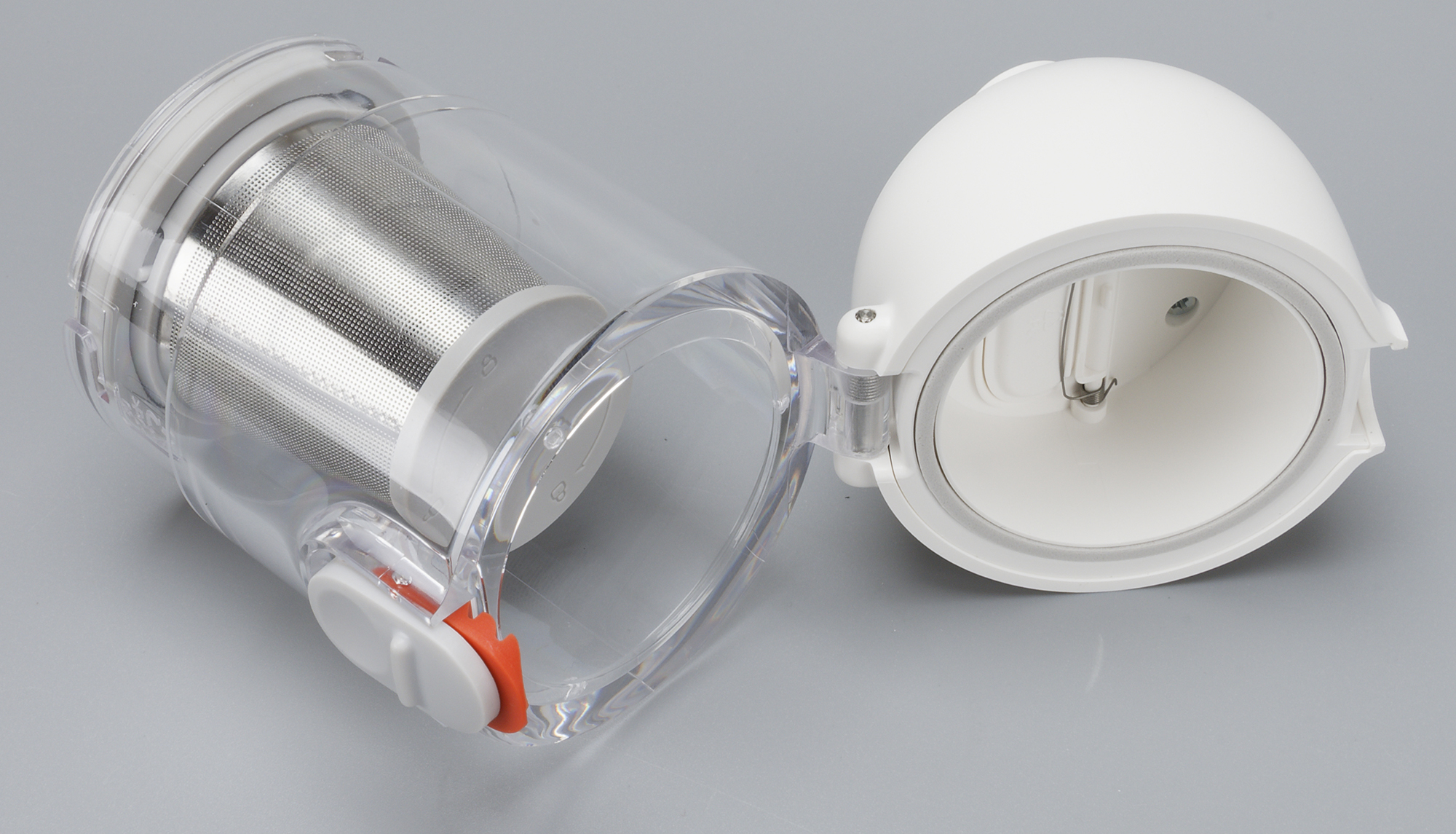 Для того, чтобы открыть пылесборник, пылесос снабжен кнопкой под большой палец, нажатием которой откидывается его крышка. Кнопка также оборудована защелкой, с помощью которой контейнер блокируется от случайного открытия. Будучи разблокированным, контейнер открывается одним нажатием кнопки, после чего можно легко высыпать весь собранный в пылесборник мусор. Затем также легко защелкнуть его обратно и далее заблокировать при необходимости.