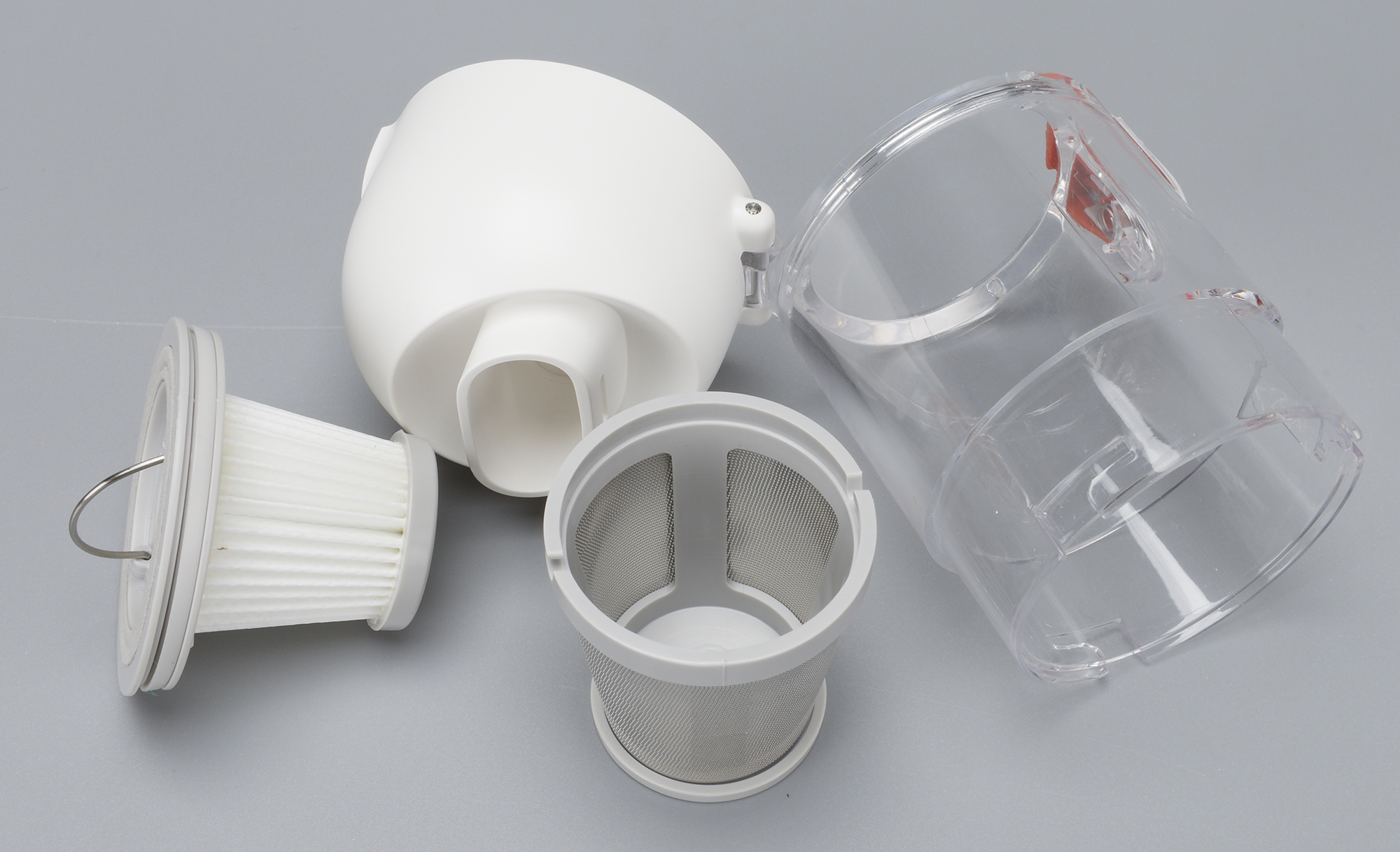 Детали гармонично дополняют друг друга — белоснежный матовый пластик корпуса, прозрачное из довольно толстого abs-пластика окошко пылесборника, видимый в нем сетчатый стальной фильтр, кнопка открывания контейнера серого цвета, красиво оттененная виднеющимся за ней красным фоном, плавные линии корпуса. Пылесос приятный на ощупь, он легкий и компактный, держать в руке его удобно и приятно.