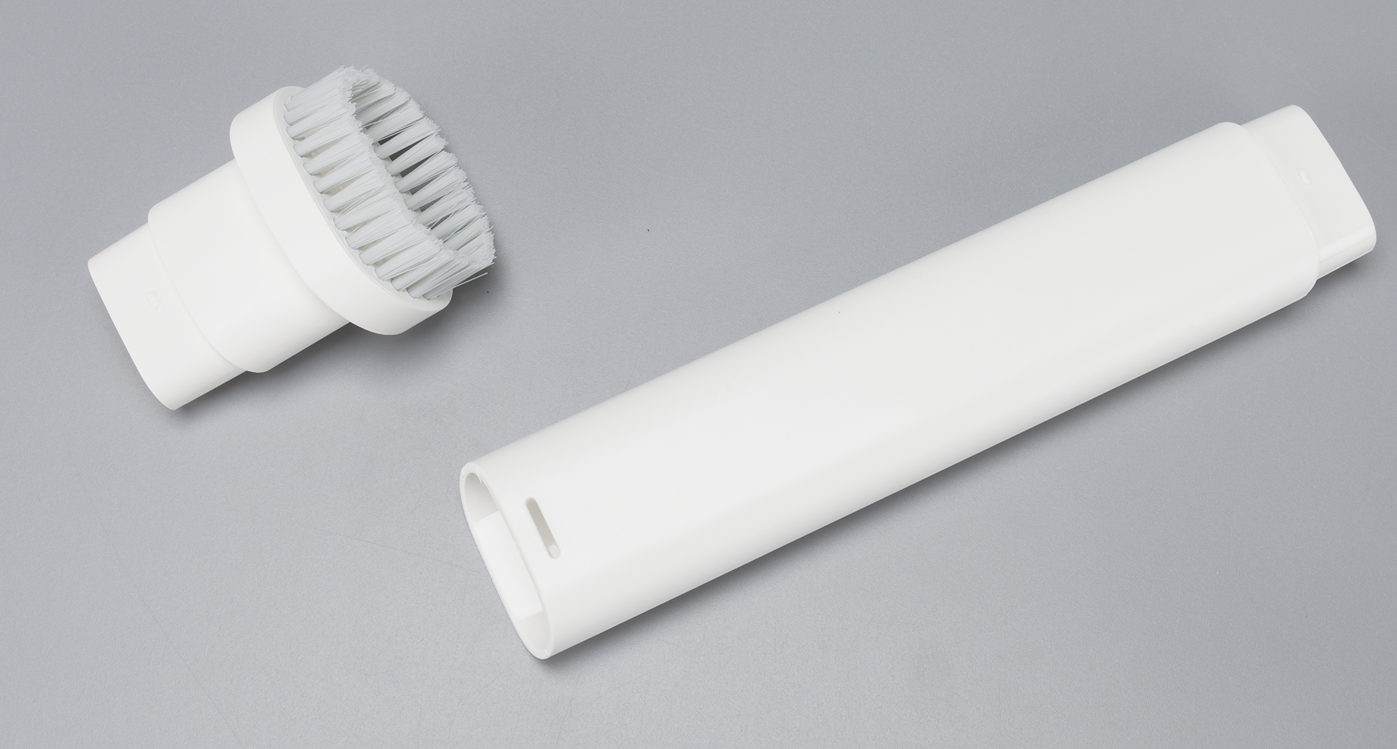 В комплекте к пылесосу идут две насадки. Это щетка с достаточно мягким ворсом и щелевая насадка-удлинитель длиной около 14 см. Насадки крепятся к соплу пылесоса, вставляясь до щелчка. Они могут быть использованы как по отдельности, так и быть совмещены между собой, и тогда насадка-щетка надевается на удлинитель. Соединение как насадок с соплом, так и насадок между собой, надежное.