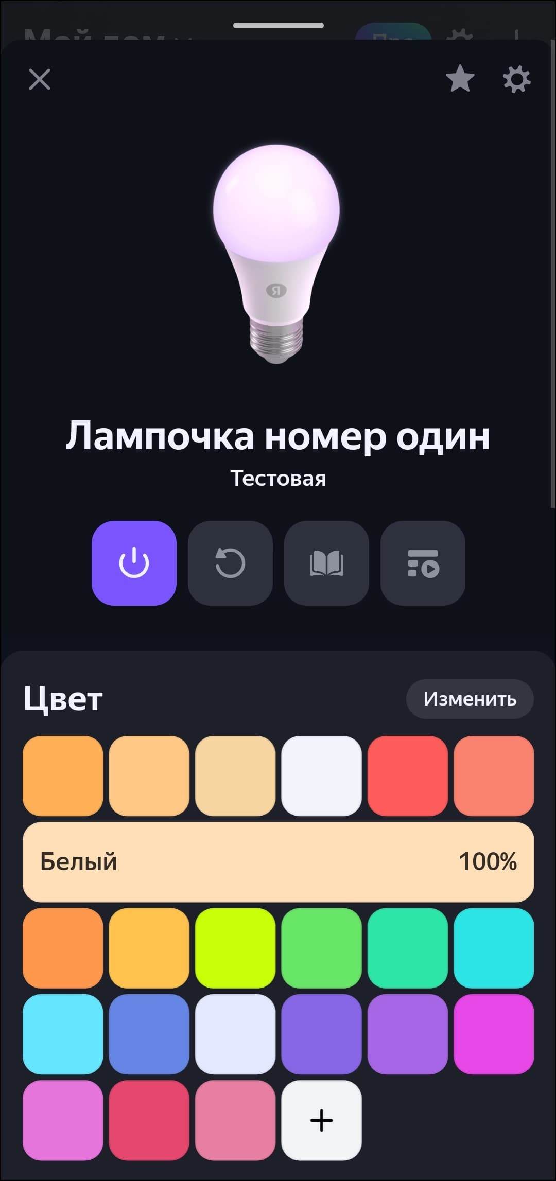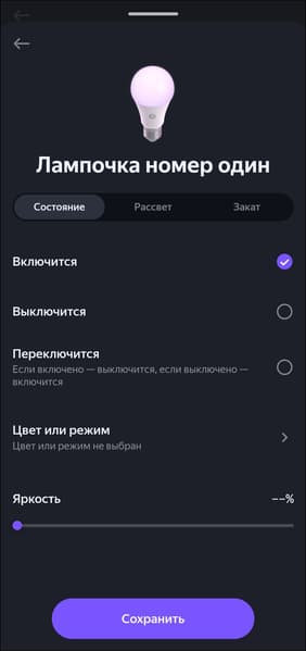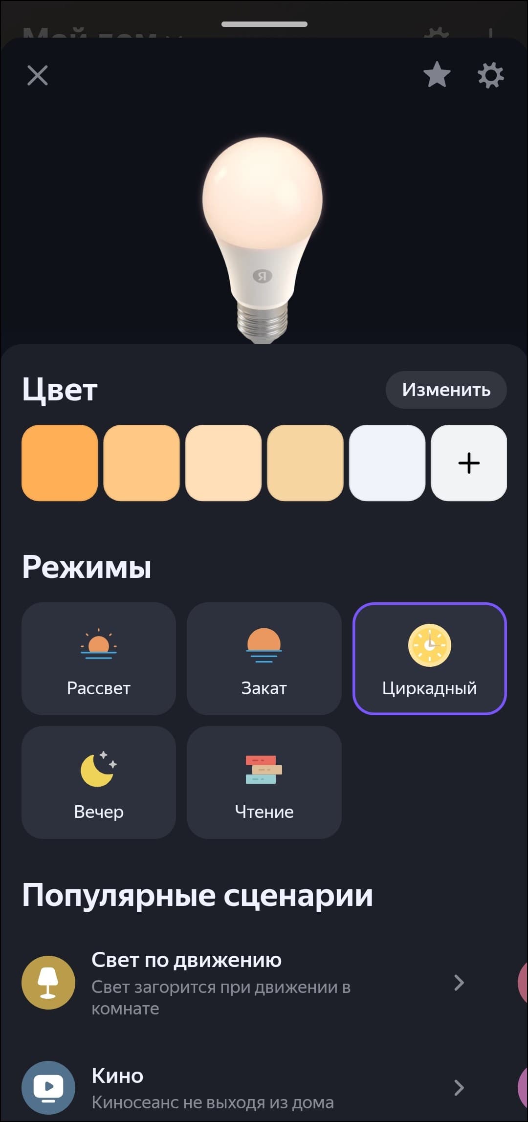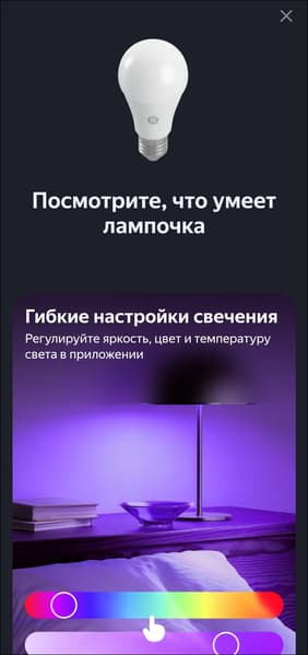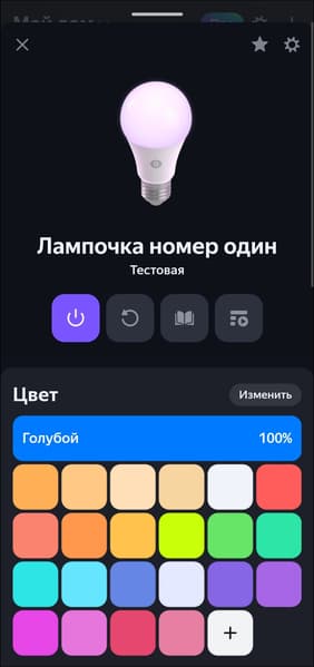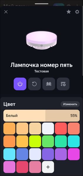 Список доступных опций стандартный для RGB-лампочек «Яндекса», всё на месте — от «режима чтения» до гибкой настройки цвета свечения.