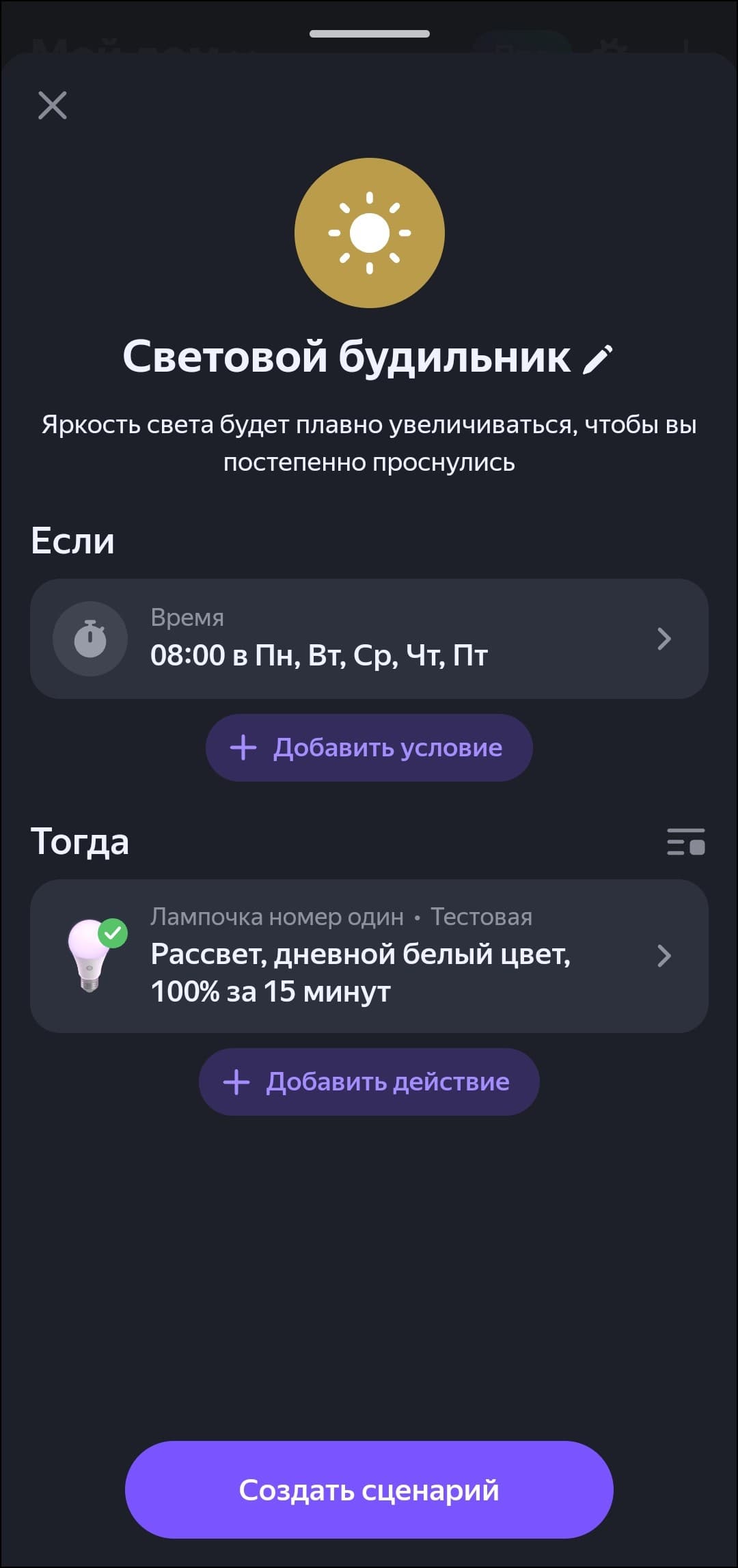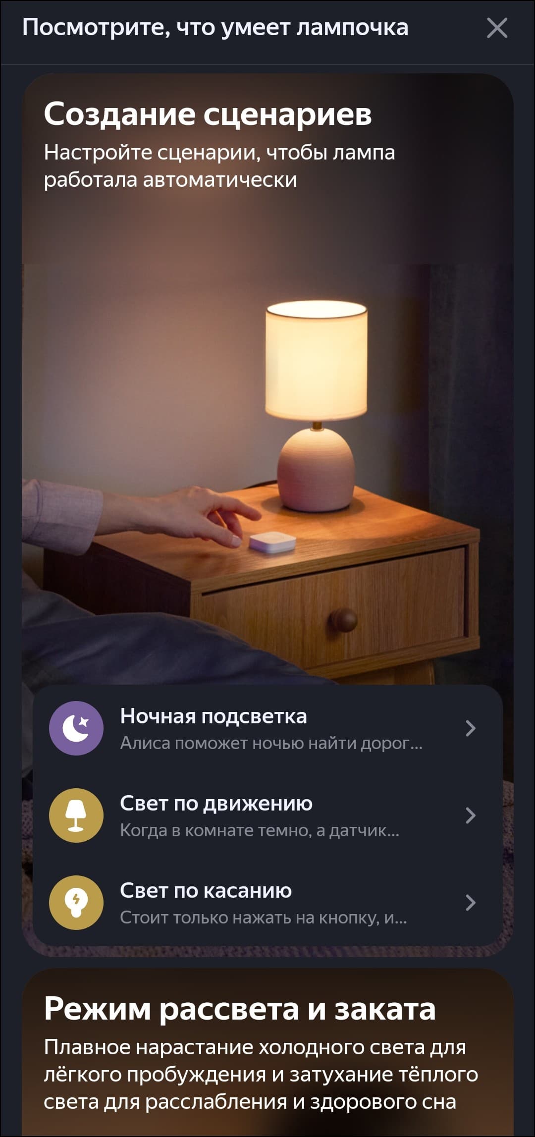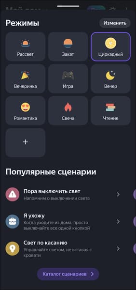 Также в приложение добавлен каталог сценариев, что очень пригодится на этапе освоения управлением умным домом. Есть все базовые действия — от включения света по движению с помощью соответствующего датчика до будильника, ночника и даже управления фитосветом.