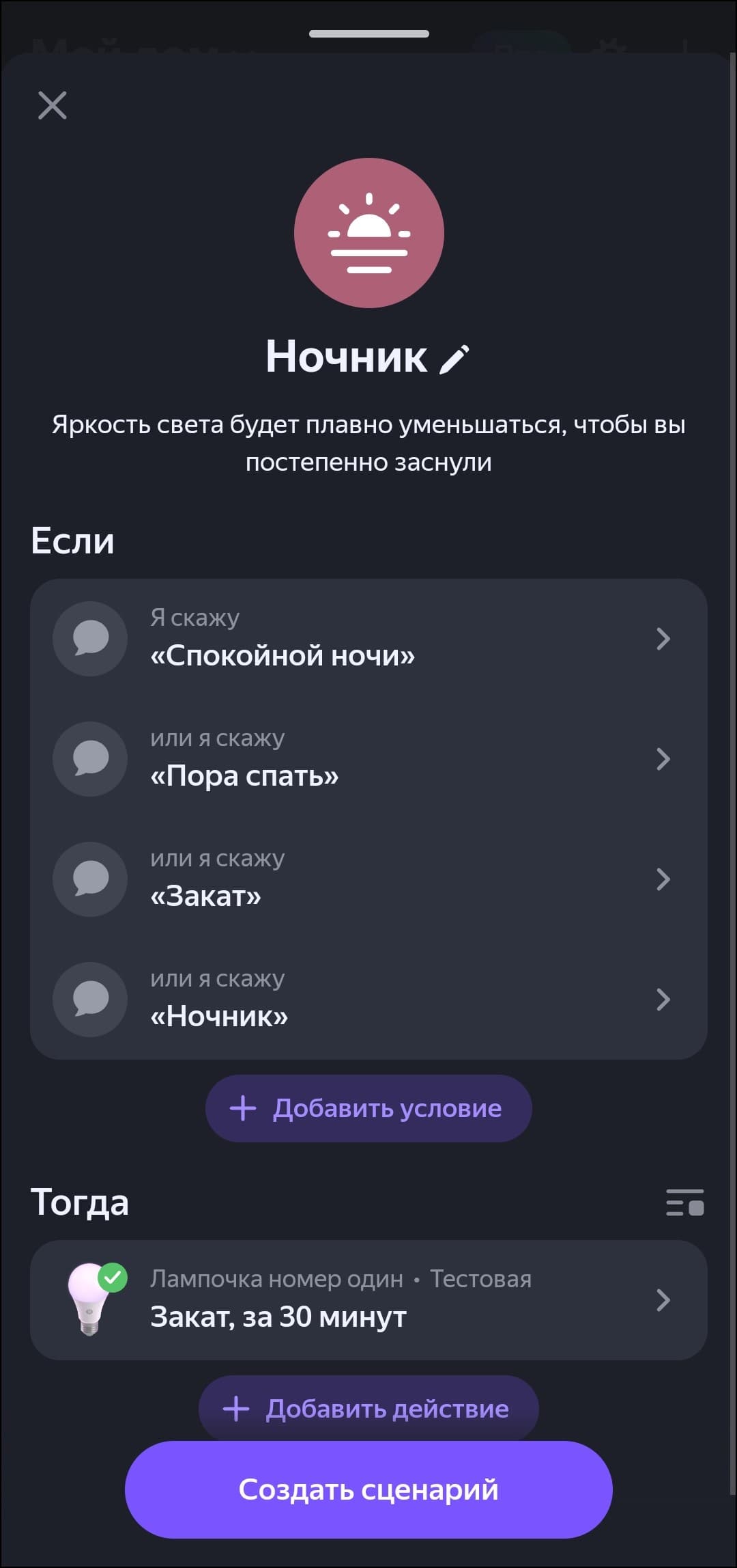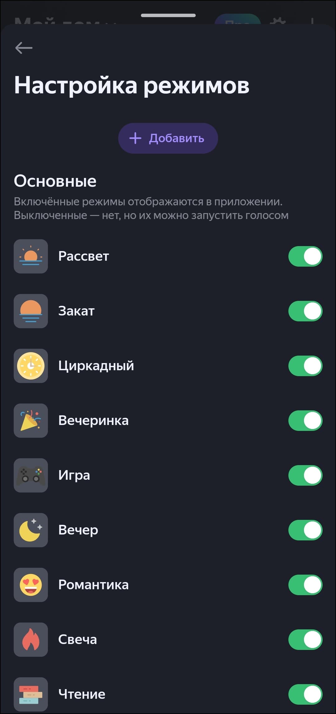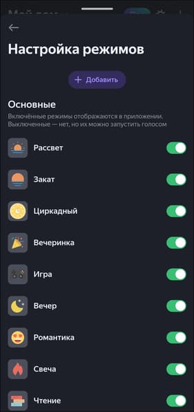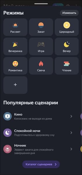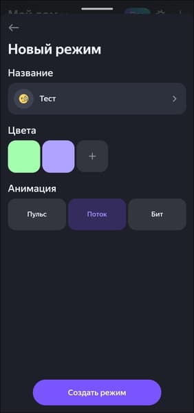 Предустановленных режимов много, отображение некоторых на главной можно отключить. Реализована и возможность создавать собственные: выбираем имя, иконку, добавляем цвета и способ их смены — готово. Новый режим появляется в общем списке и доступен для выбора как через интерфейс ПО, так и с помощью голосового ассистента.