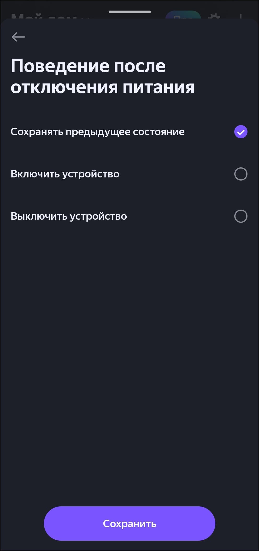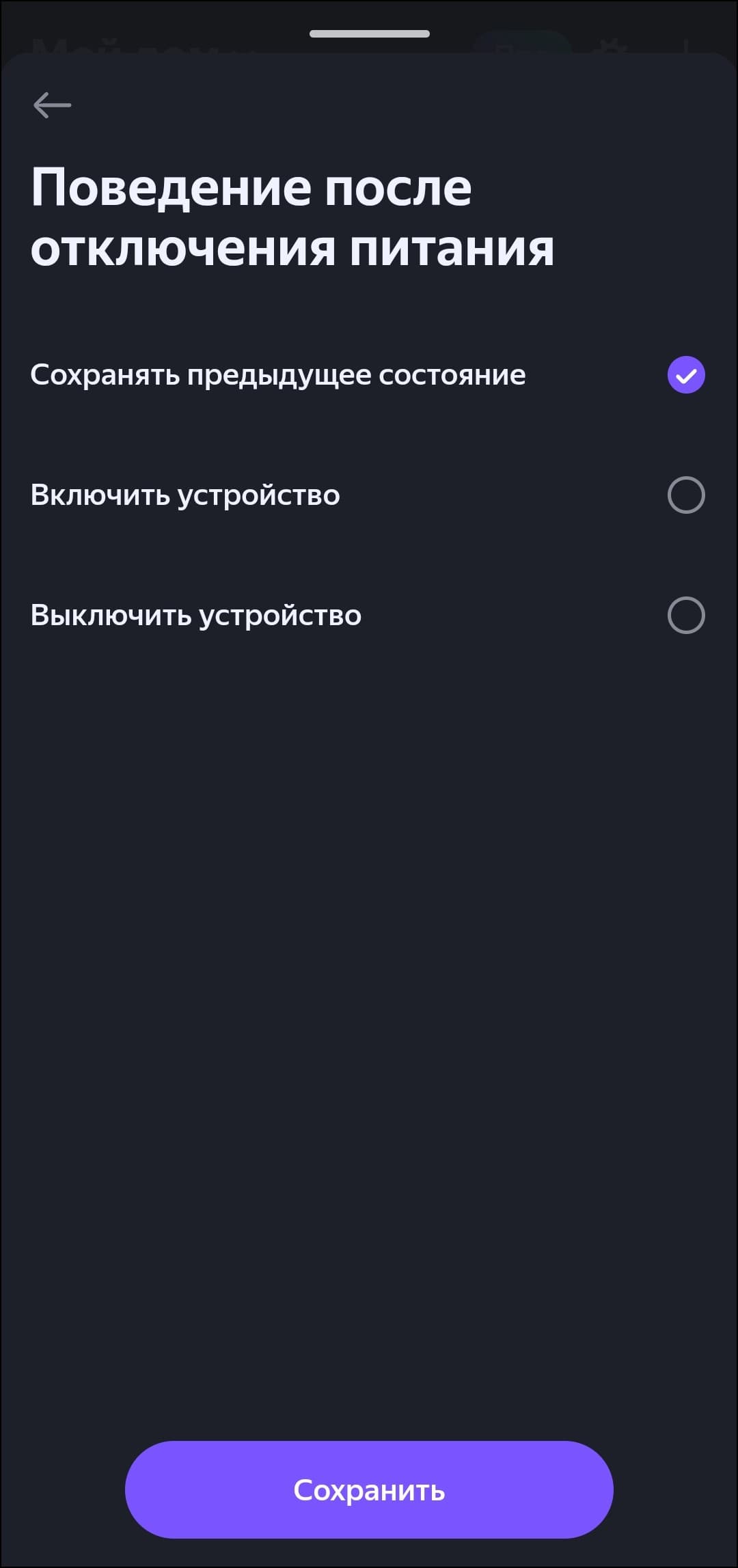 На странице ламп в приложении можно включить и выключить их, быстро выбрать «режим чтения», настроить цвет и яркость свечения. В отдельное меню вынесены настройки типа устройства, имени и так далее. Особого внимания заслуживает появление настройки поведения лампочки после отключения питания — теперь она может выключаться, включаться или сохранять свое предыдущее состояние. Первые умные лампочки «Яндекса» исключительно включались после отключения и повторного подключения питания, что вызывало целый ряд неудобств. Палитру быстрого выбора цветов можно настроить, добавив в нее свой.