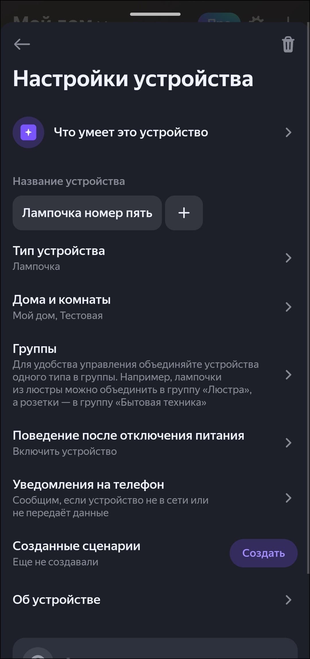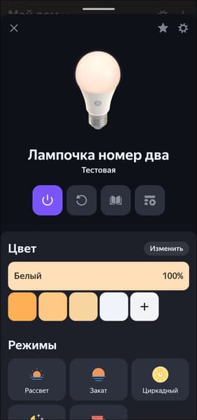 Доступные в приложении и через голосового ассистента функции те же, что и у «обычной» лампочки без возможности смены цвета: от настройки температуры и яркости до добавления в группы и сценарии.