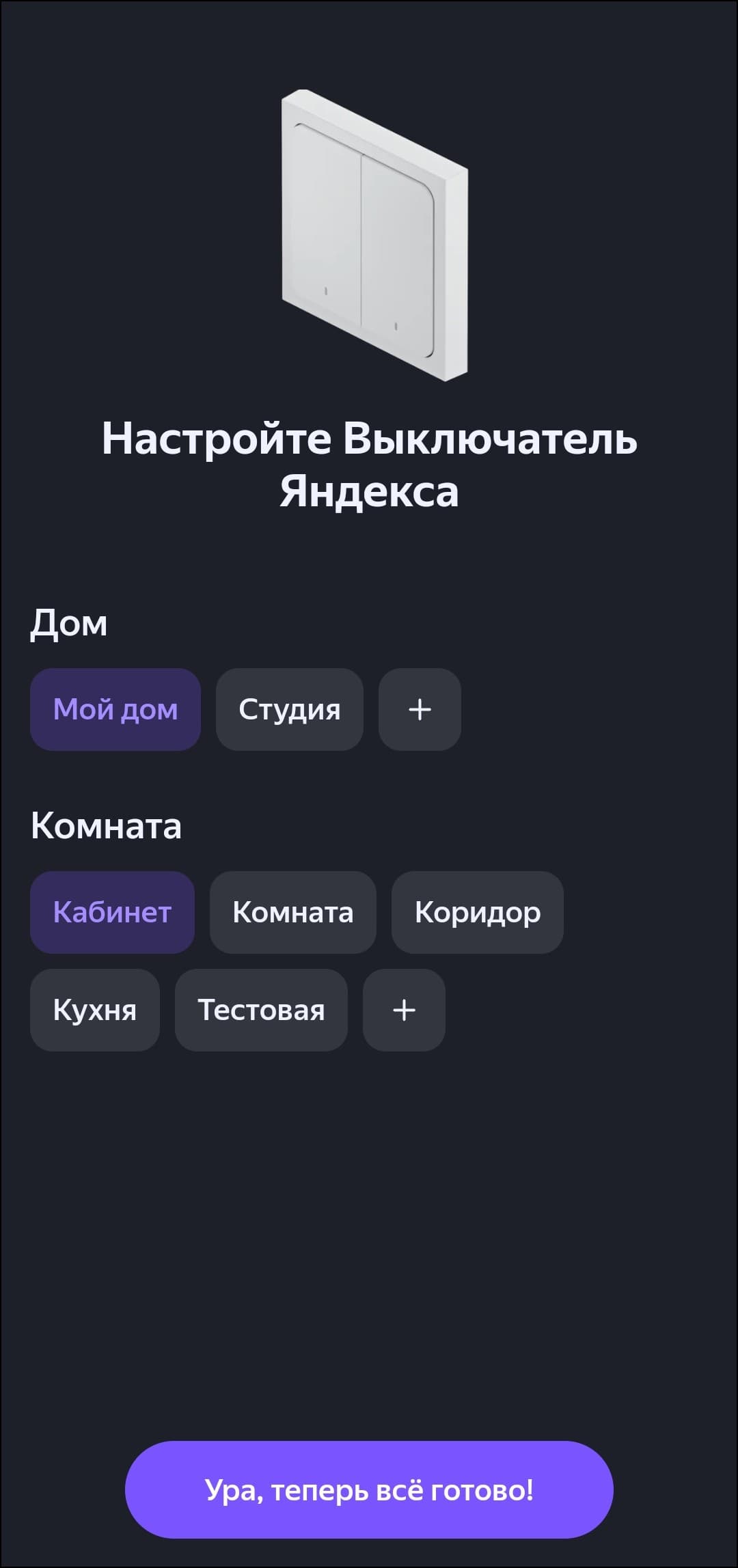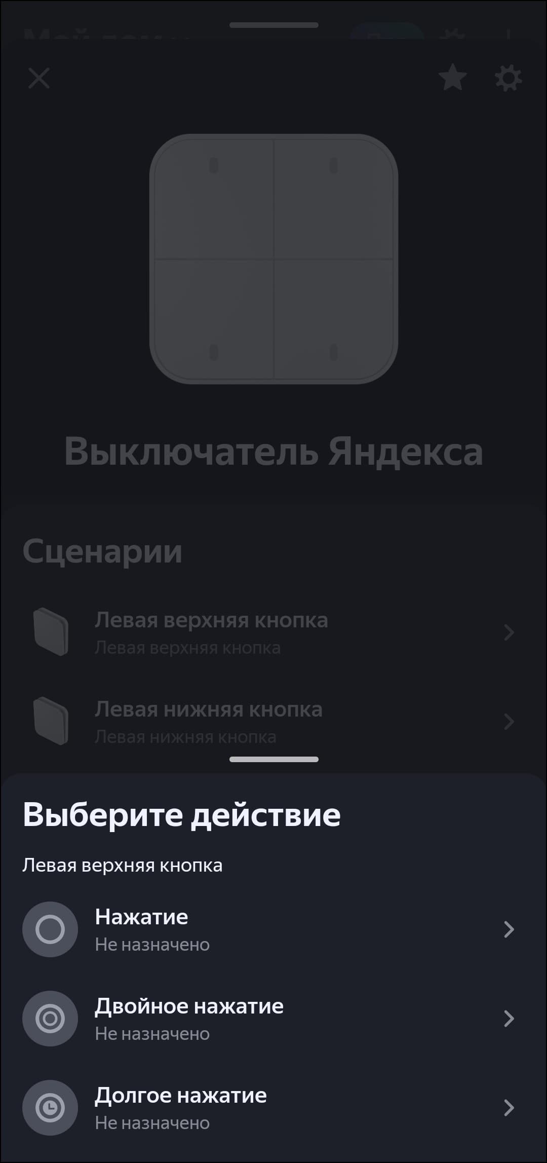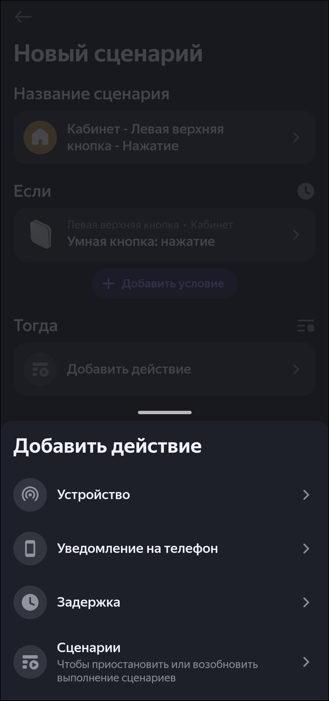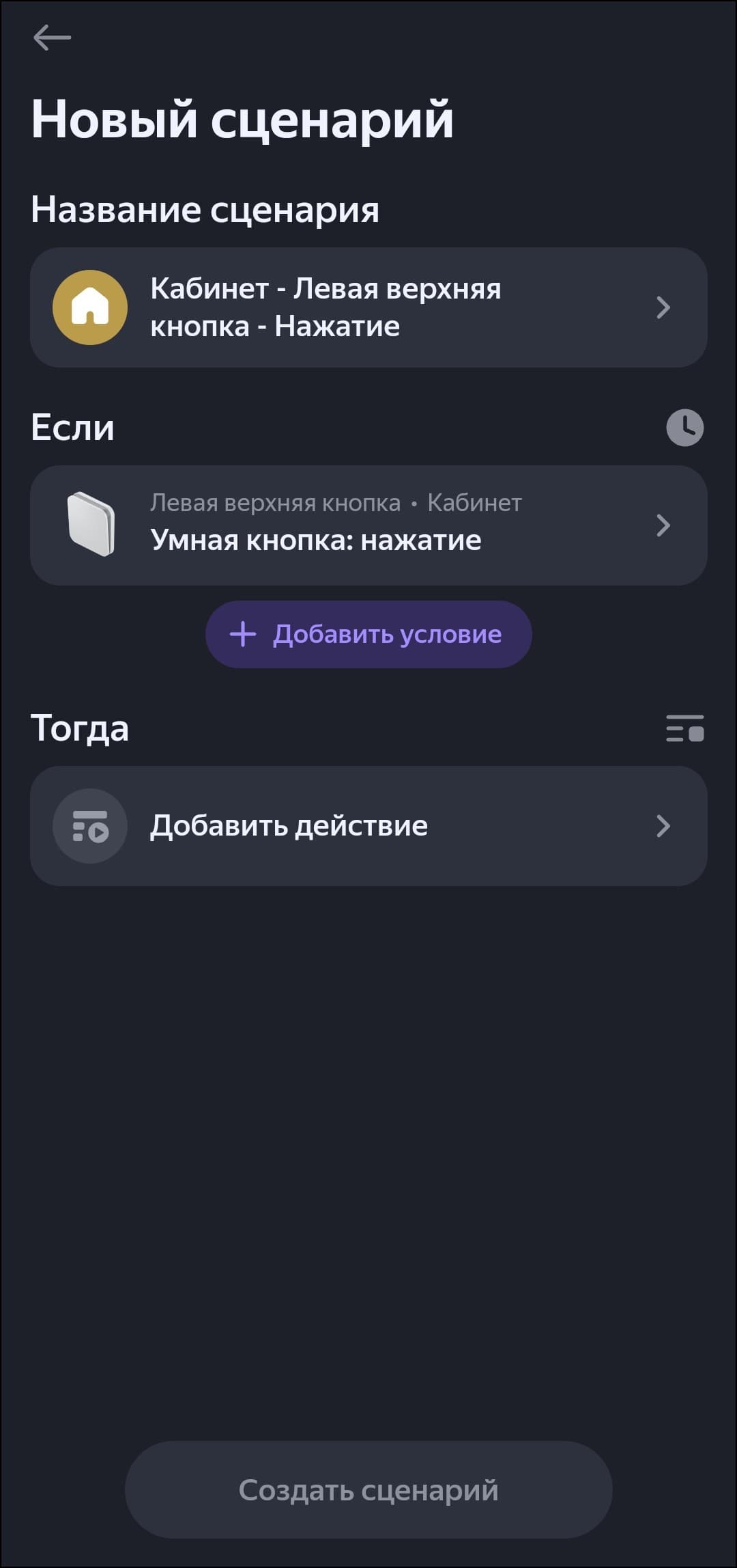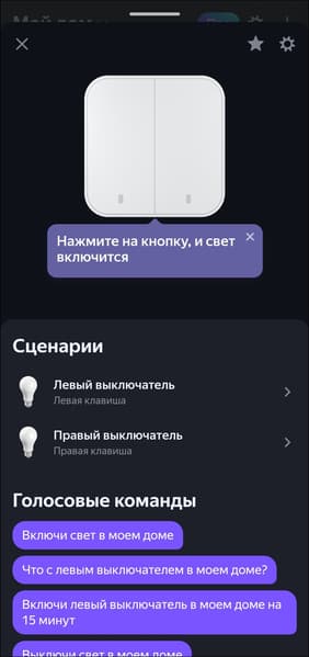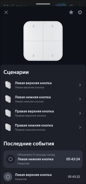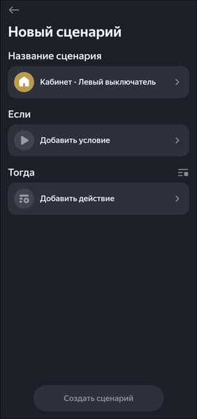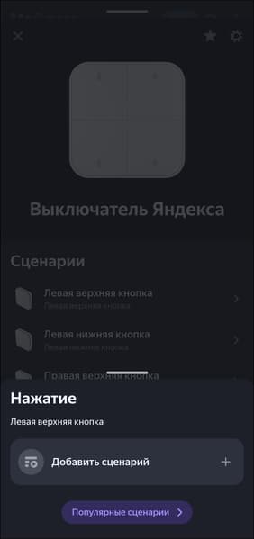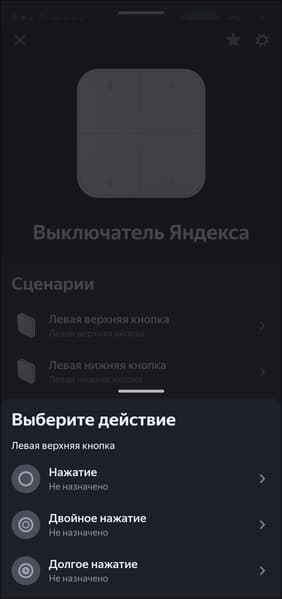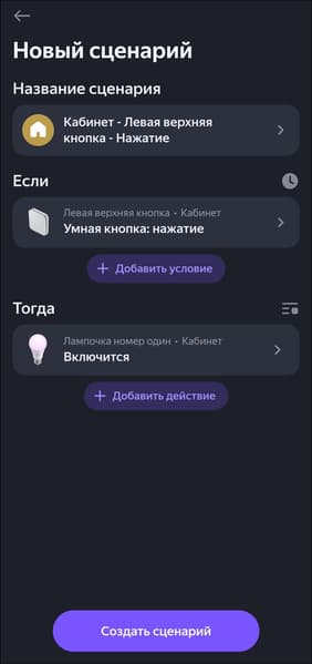 Двухклавишный выключатель добавляется в систему как четыре смарт-кнопки, одноклавишный — соответственно, как две. Каждая поддерживает три типа нажатия, на которые помимо включения и выключения света можно «повесить» переход в «режим чтения», например. Или вообще включение других устройств. Делается это через стандартную процедуру добавления сценария.