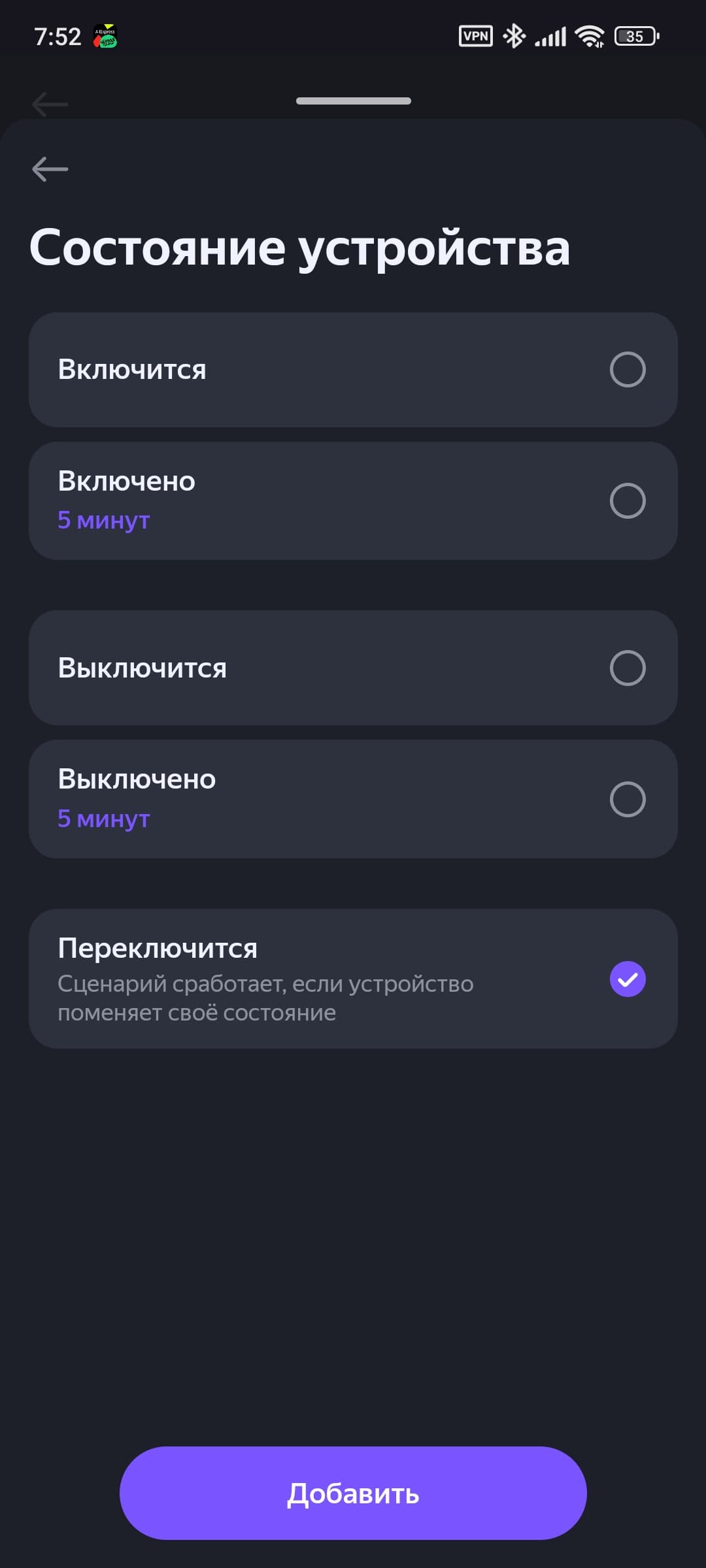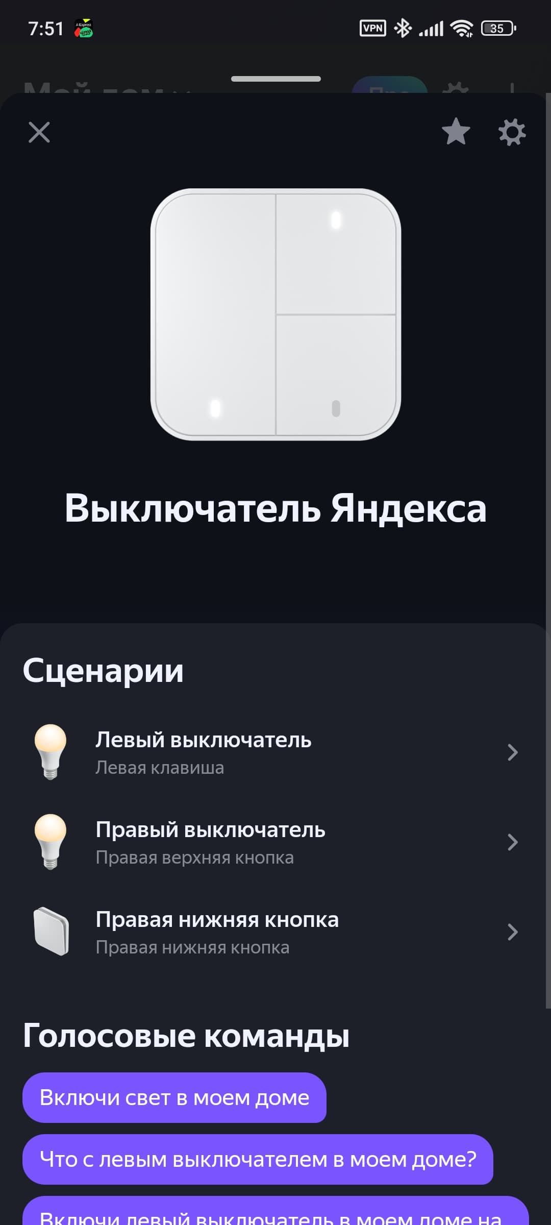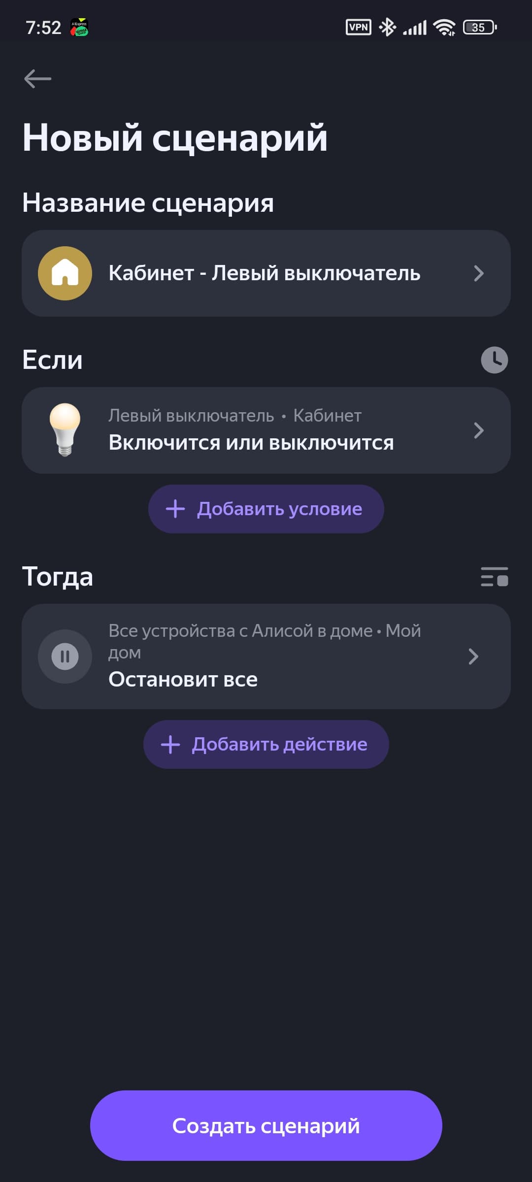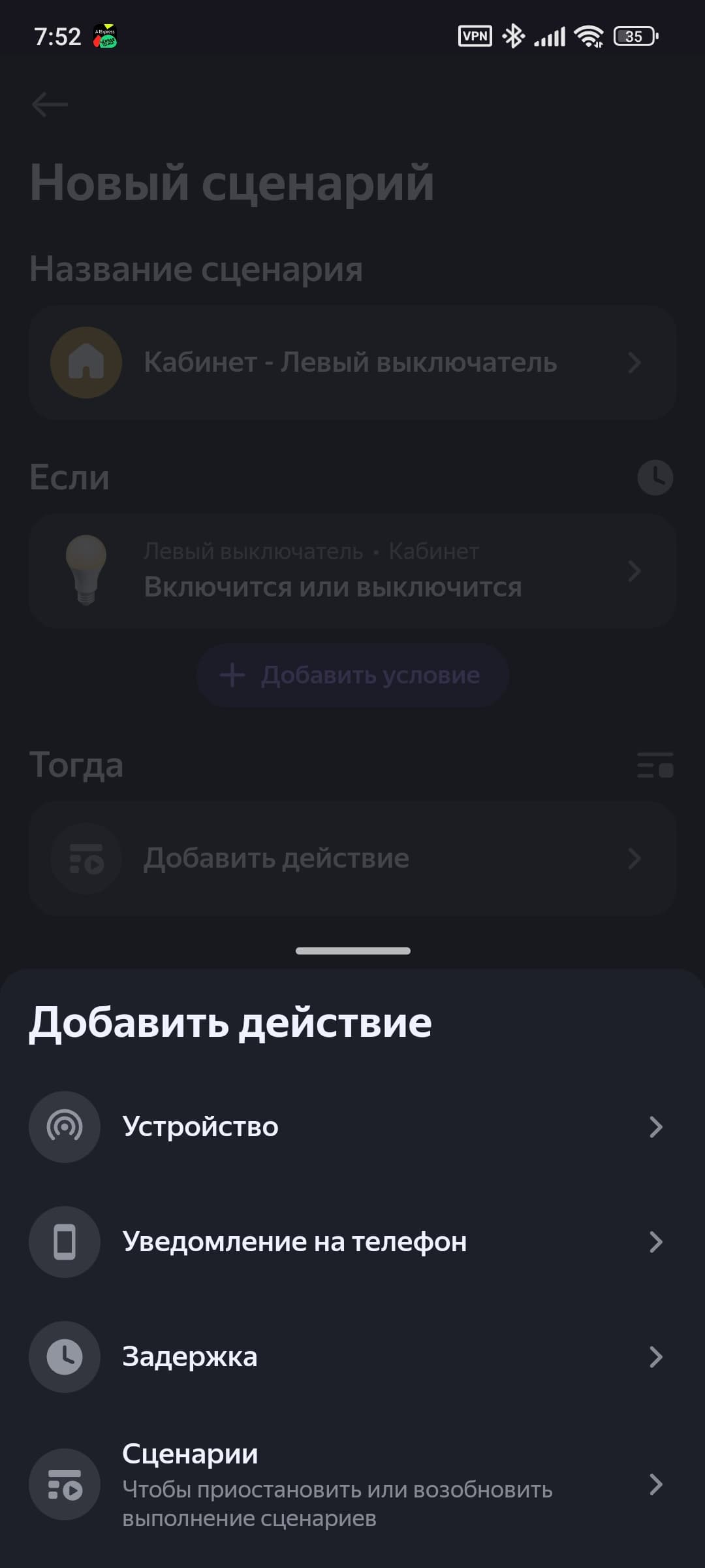 Двухклавишный выключатель добавляется в систему как четыре смарт-кнопки, одноклавишный — соответственно, как две. Каждая поддерживает три типа нажатия, на которые помимо включения и выключения света можно «повесить» переход в «режим чтения», например. Или вообще включение других устройств. Делается это через стандартную процедуру добавления сценария.