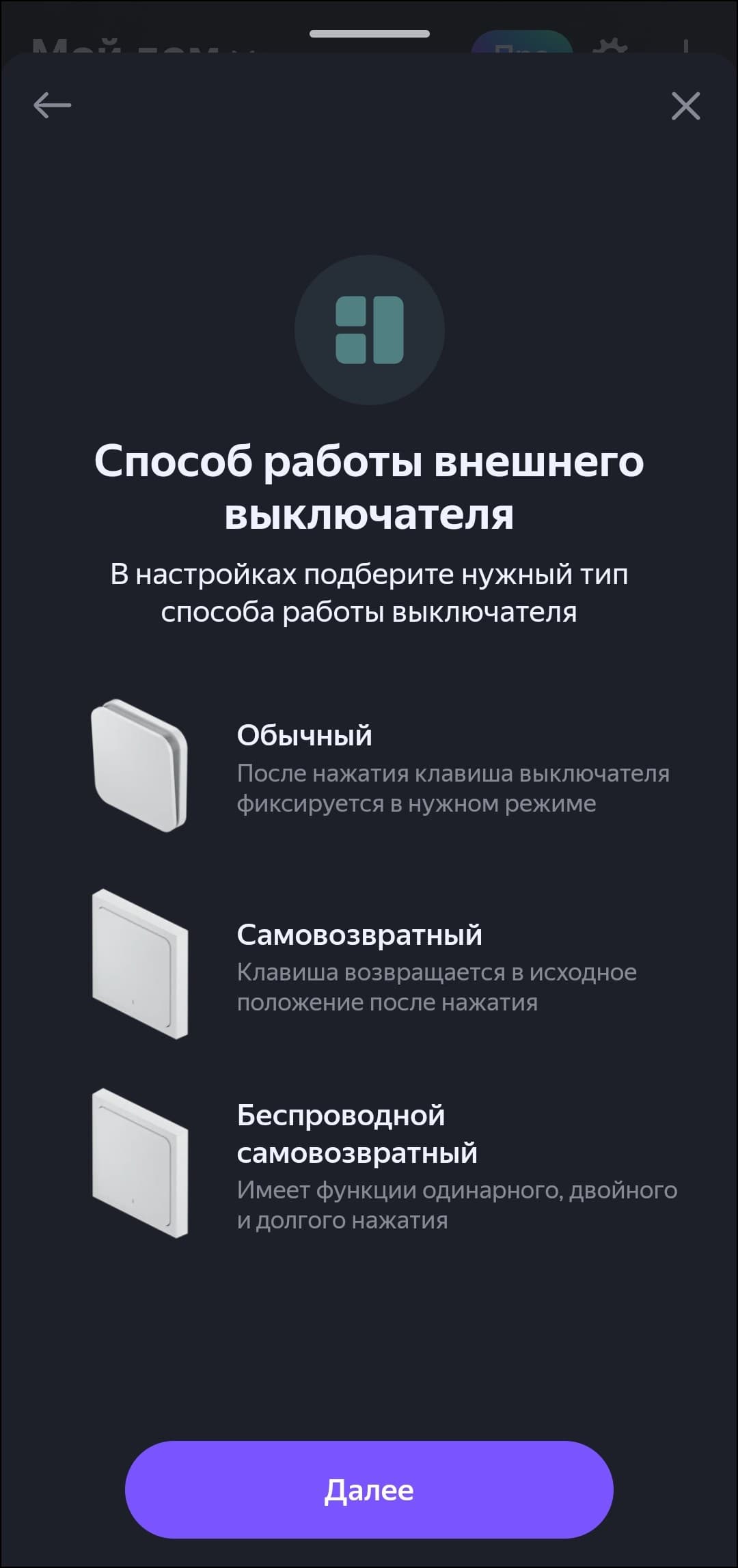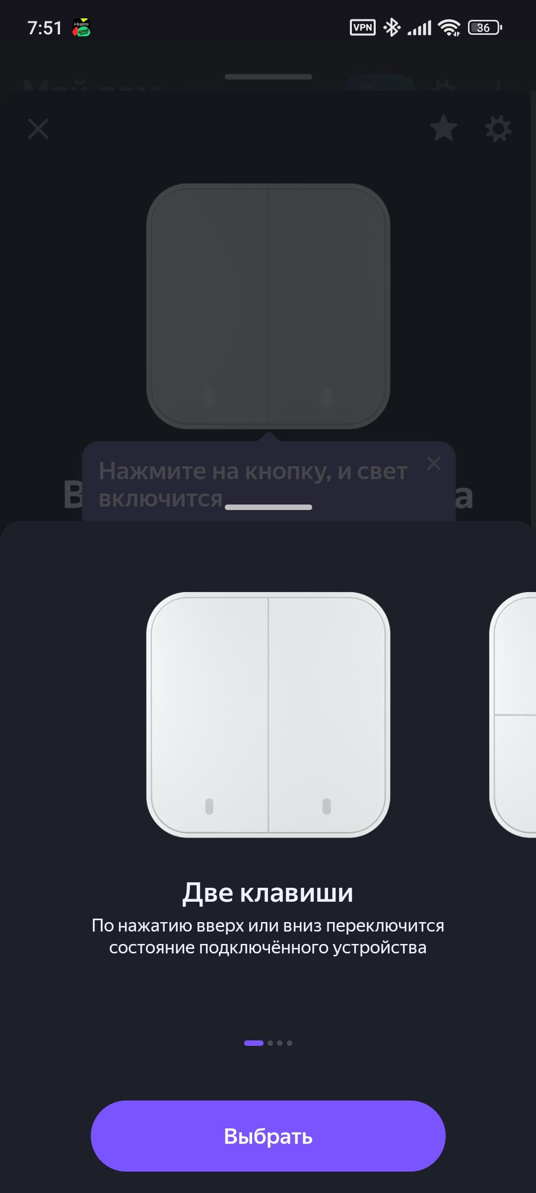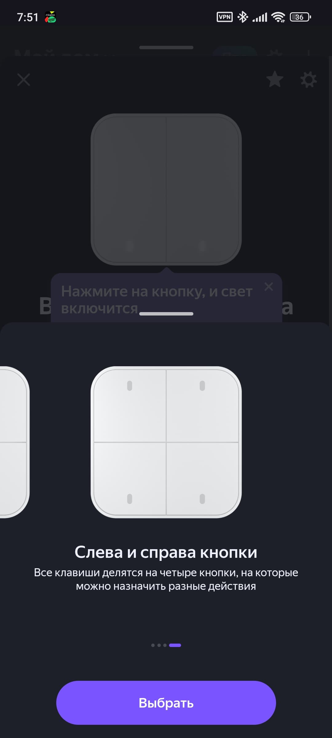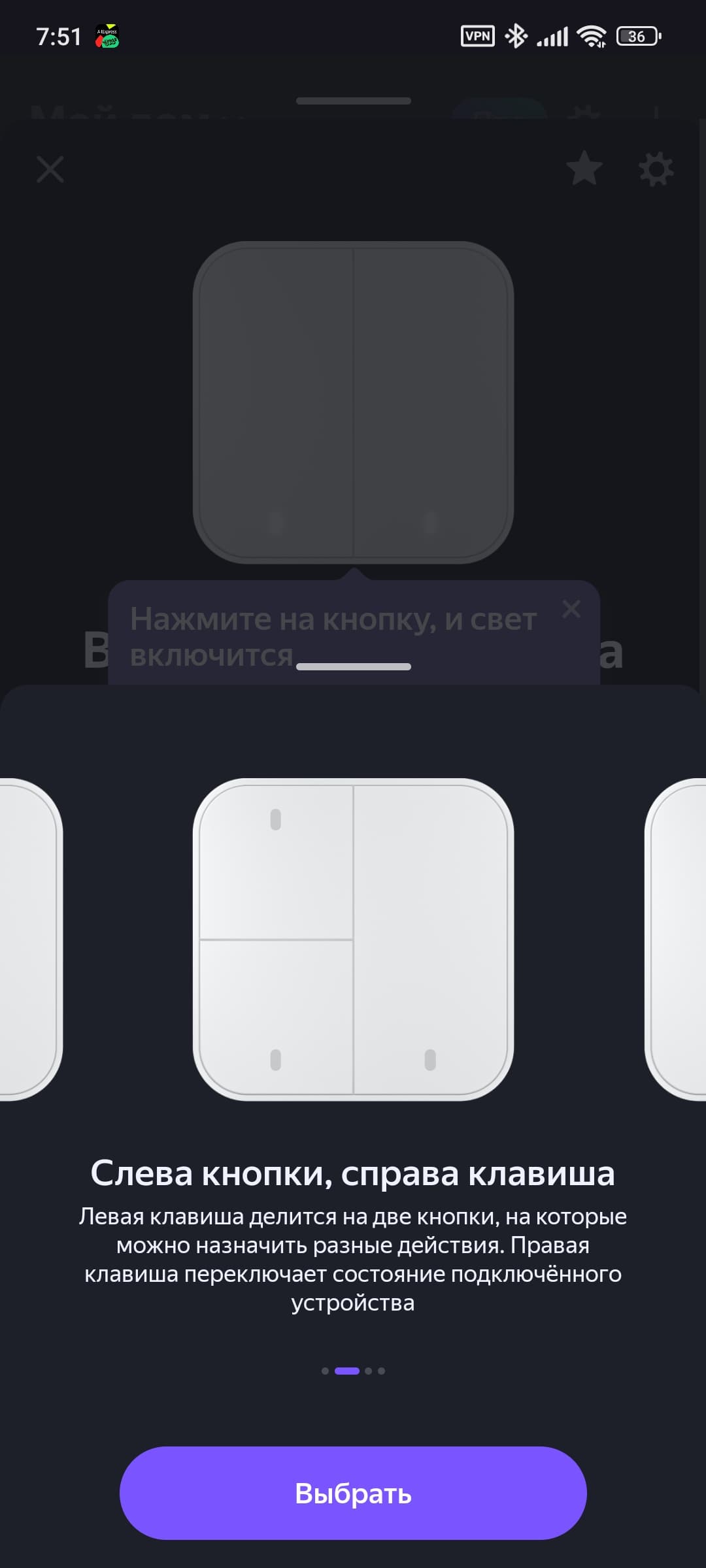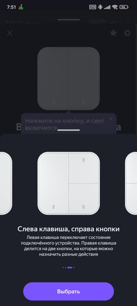 Сразу после подключения система предлагает варианты работы выключателя, каждая из клавиш может работать как две умные кнопки, либо как управляющий нагрузкой выключатель.
