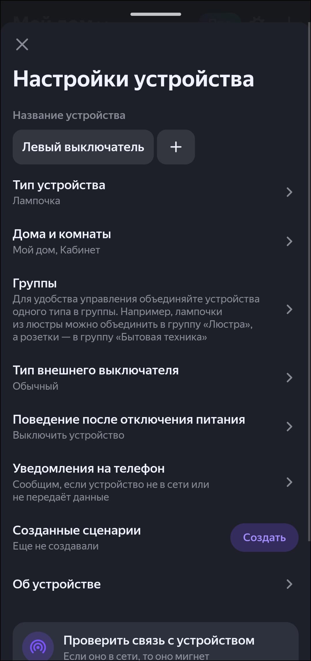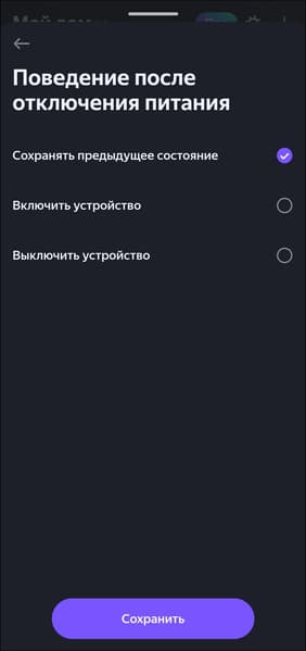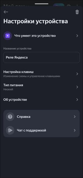 «Виртуальным кнопкам» можно менять имя для корректной работы с голосовым ассистентом, настраивать поведение в случае отключения питания. Тип выключателя можно в любом момент поменять, также устройство может отправлять уведомления на телефон, если оно не в сети.