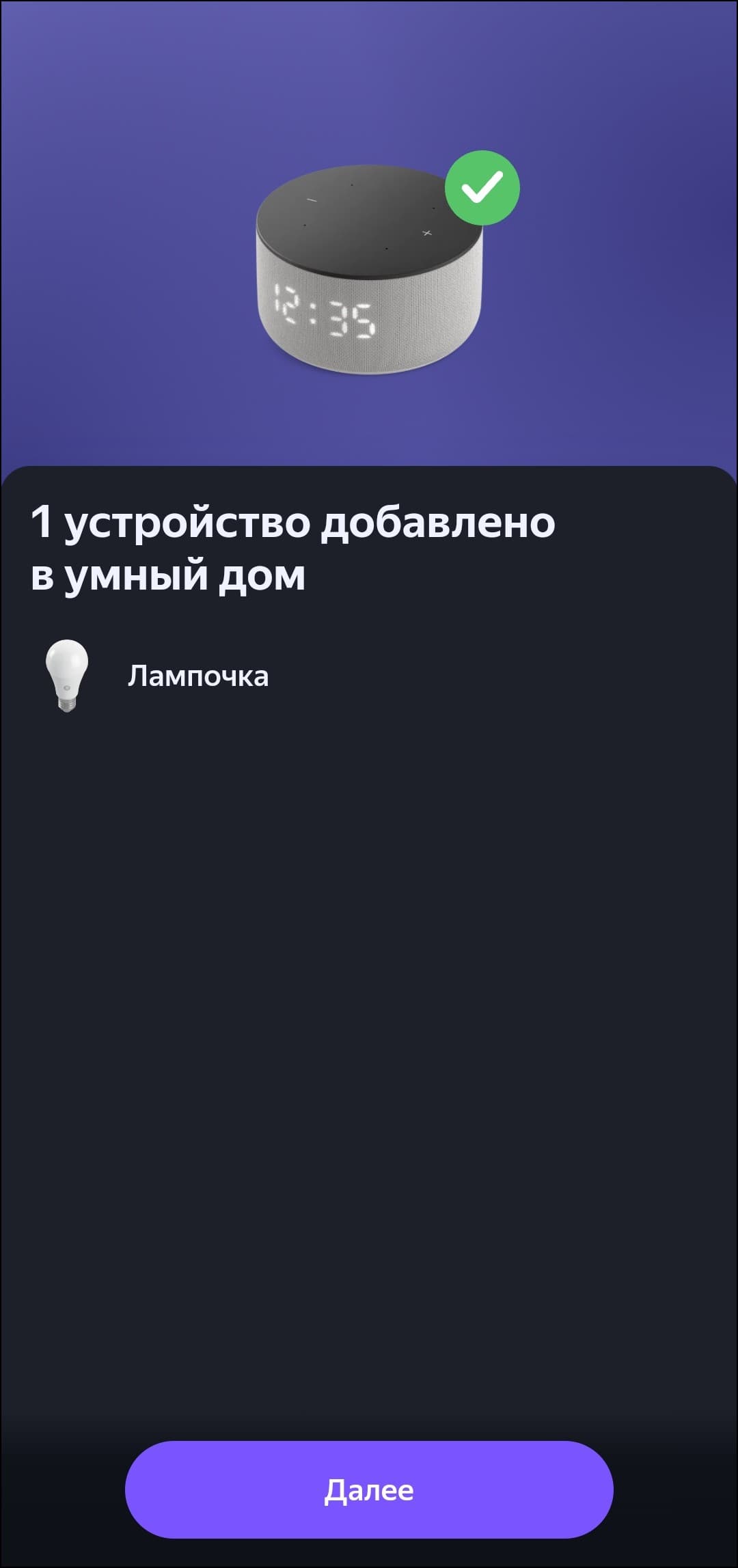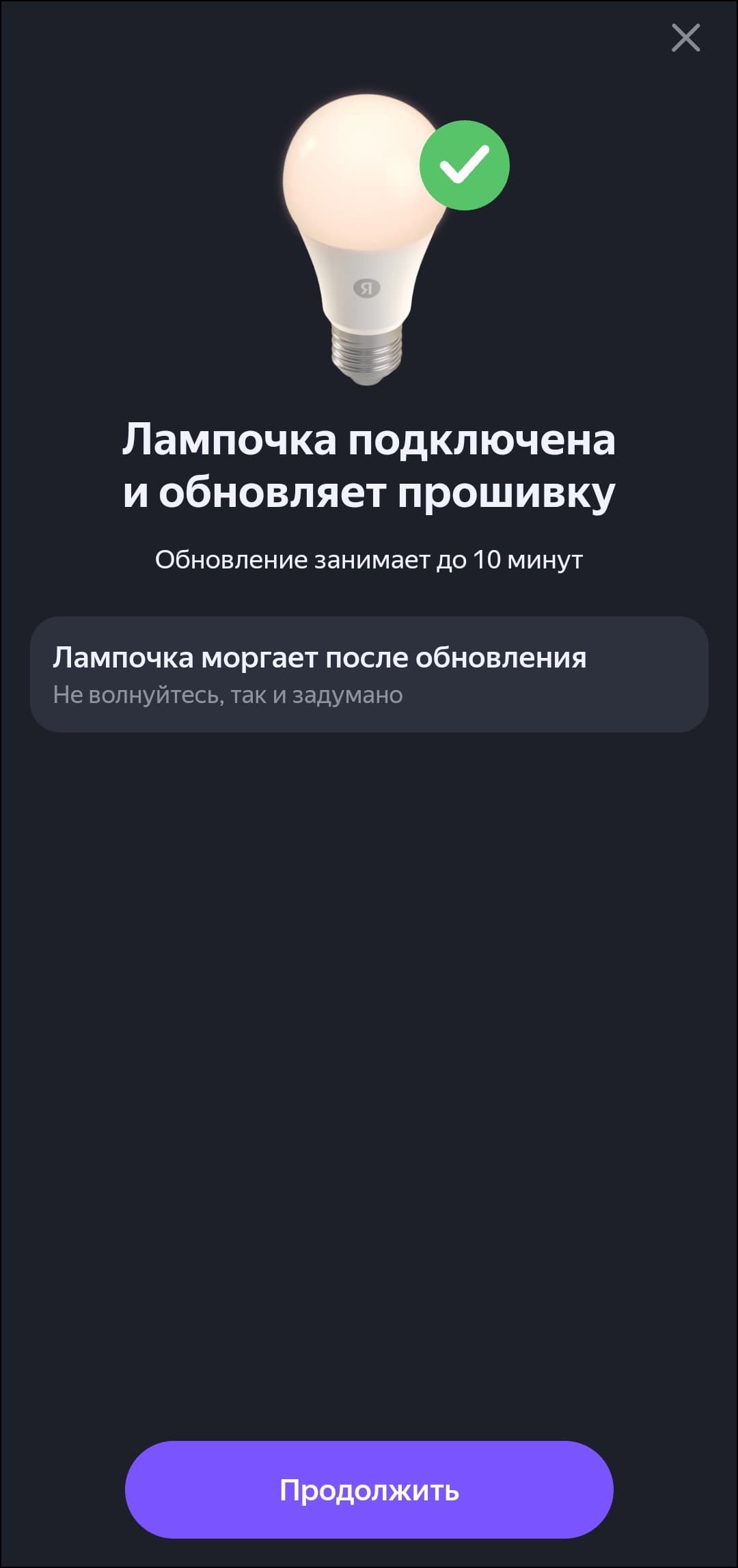Сразу отметим, что поддерживаются только сети Wi-Fi с частотой 2,4 ГГц — смартфон или другое используемое для настройки устройство нужно предварительно подключить именно к такой. Далее пять раз включаем и выключаем лампочку с паузой в 2 секунды — она переходит в режим сопряжения, о чем сообщает миганием. Если приложение «Умный дом» установлено и открыто, лампочка «найдется» автоматически — появится приглашение ее подключить.