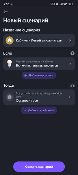 В качестве первого эксперимента мы попробовали выключать всю музыку после изменения состояния выключателя — работает. Если же говорить про какой-то более применимый в реальной жизни сценарий, то можно реализовать включение ночника после того, как будет выключен основной свет, например.