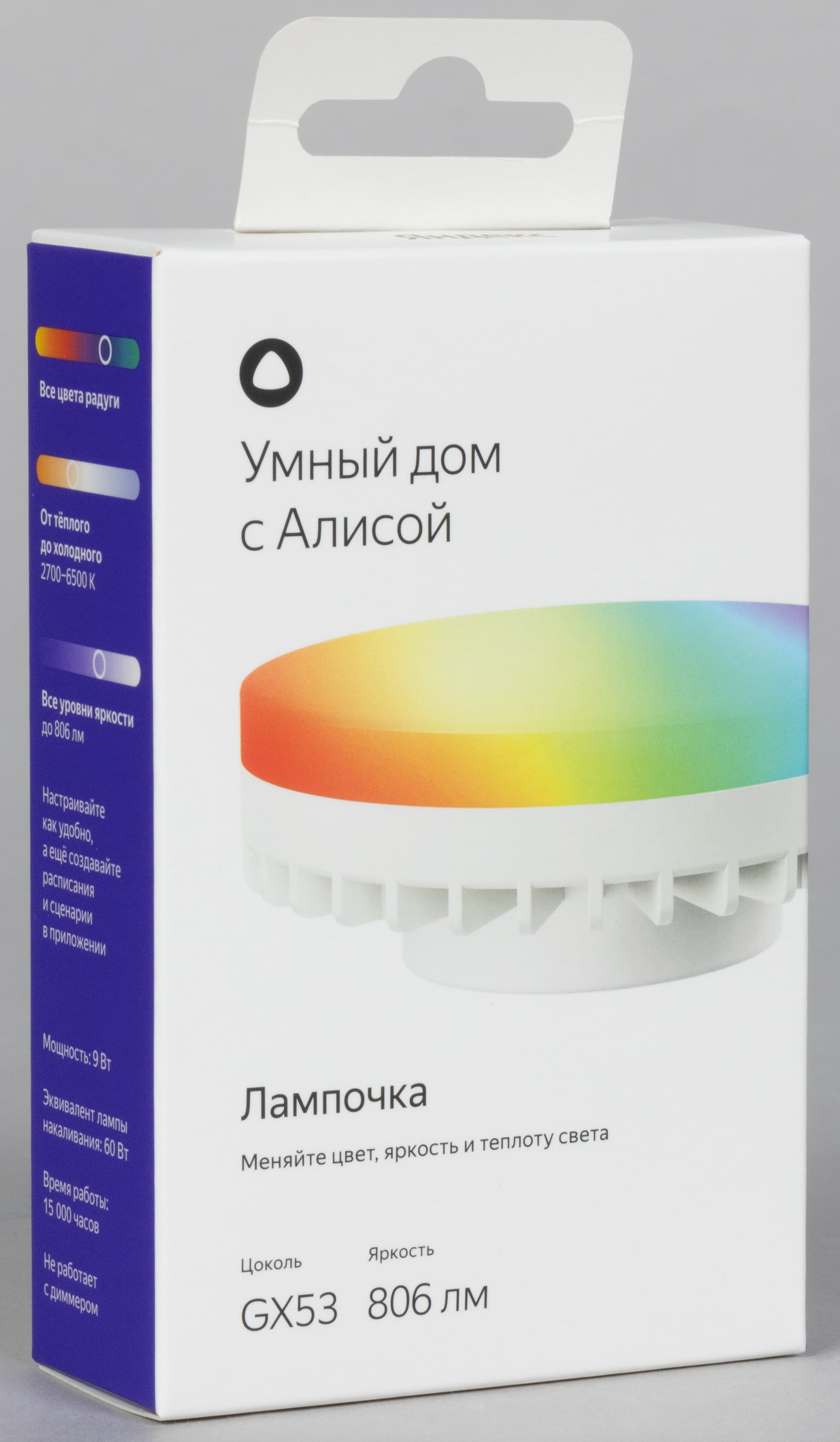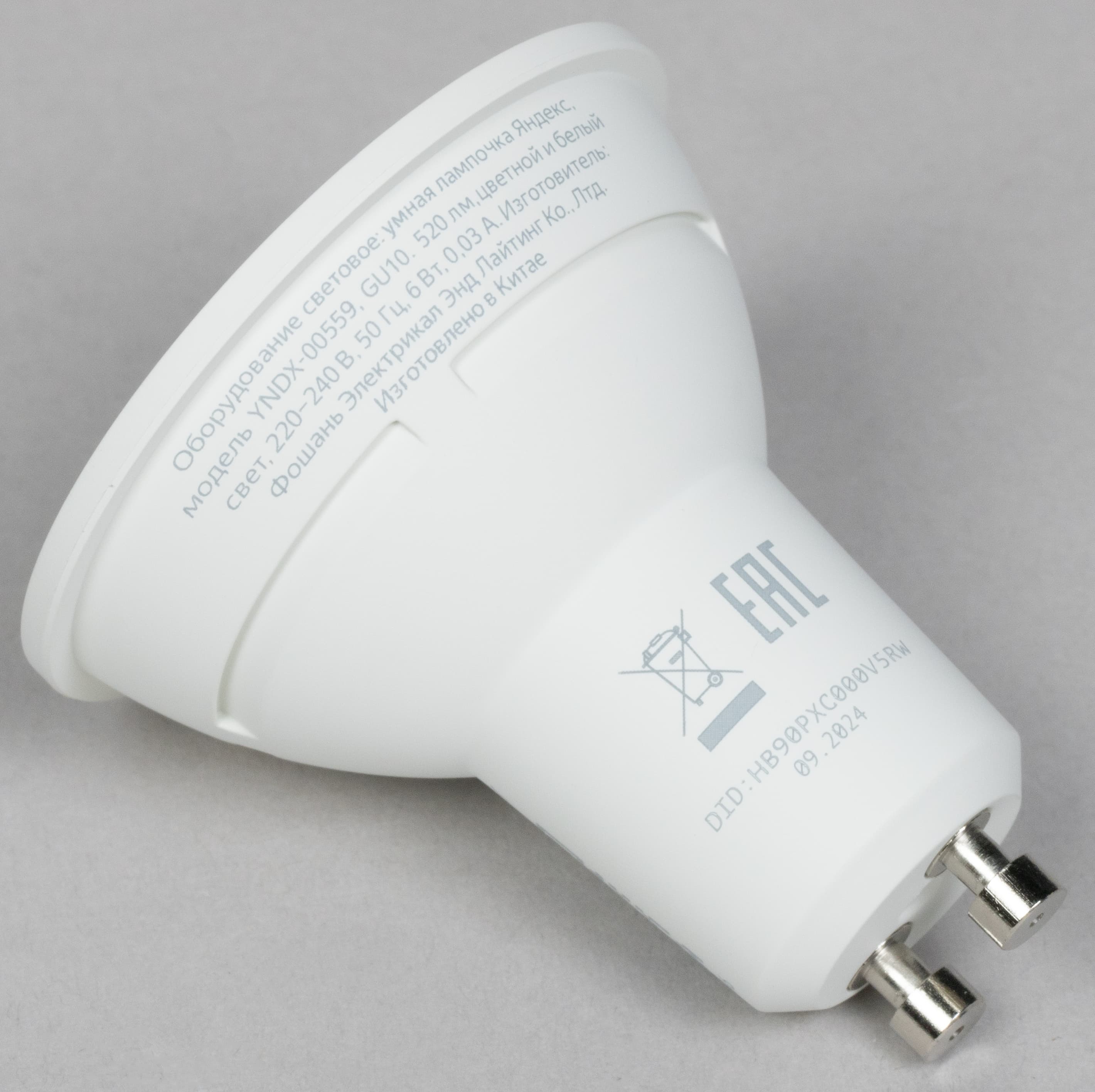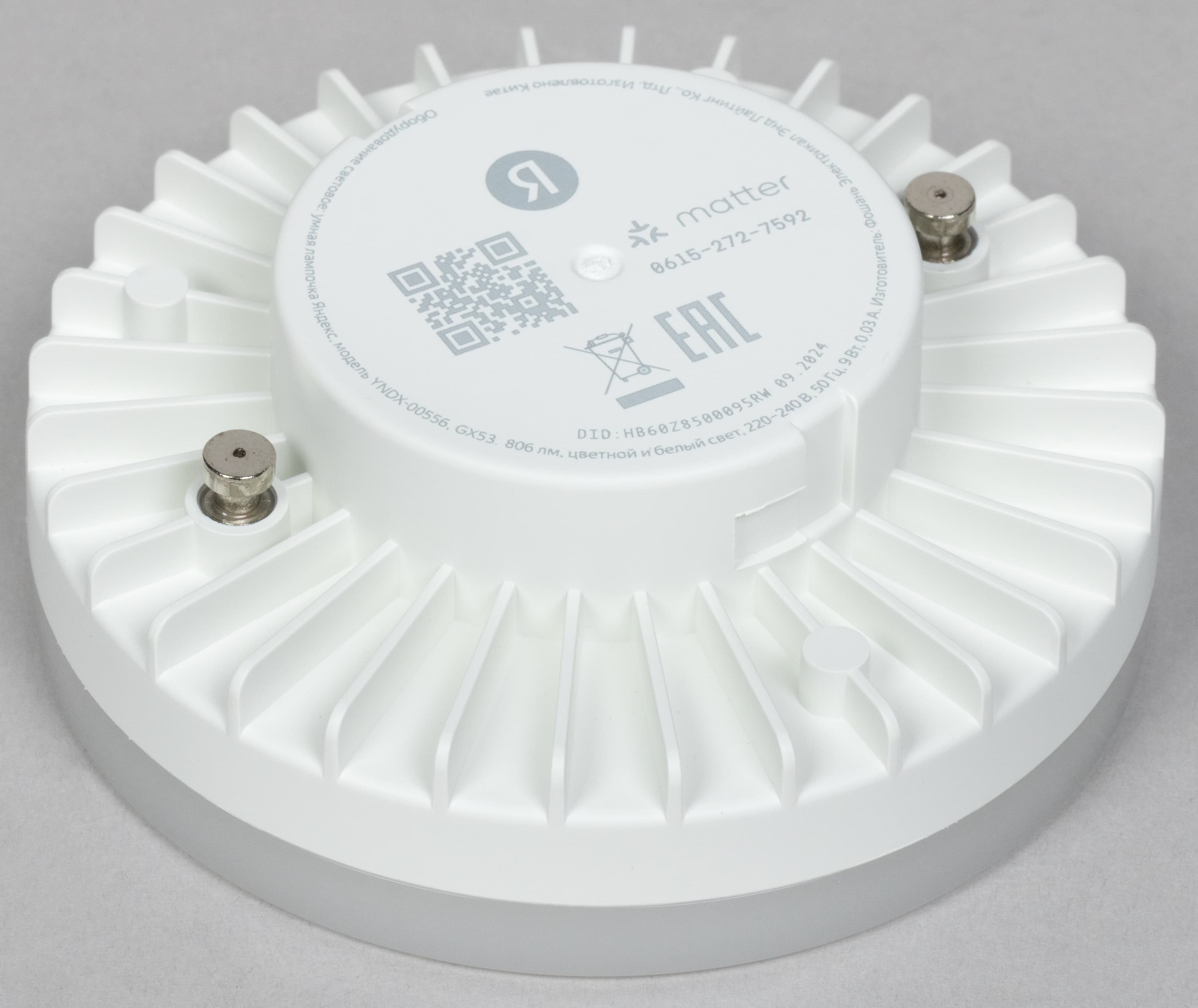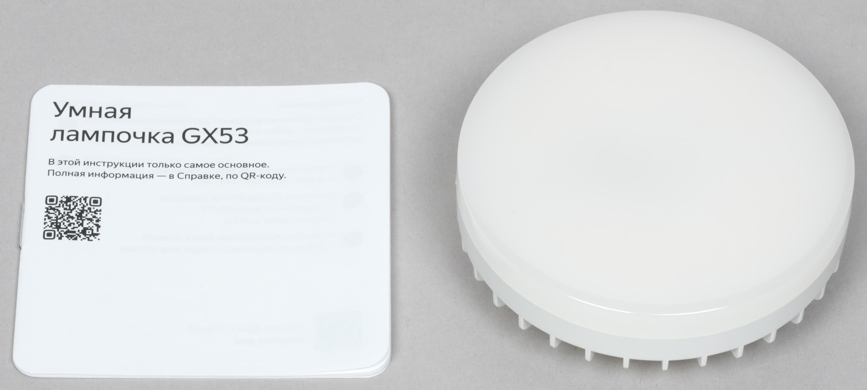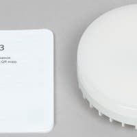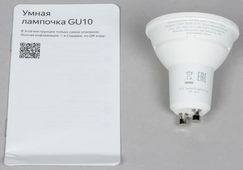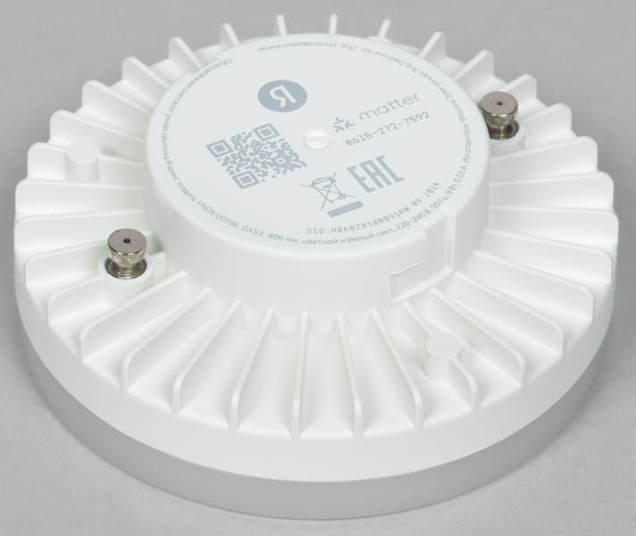 YNDX-00556 с цоколем GX53 имеет стандартную форму и размеры, максимальный световой поток — 806 лм. QR-код для подключения нанесен на заднюю часть корпуса рядом со служебной информацией.
