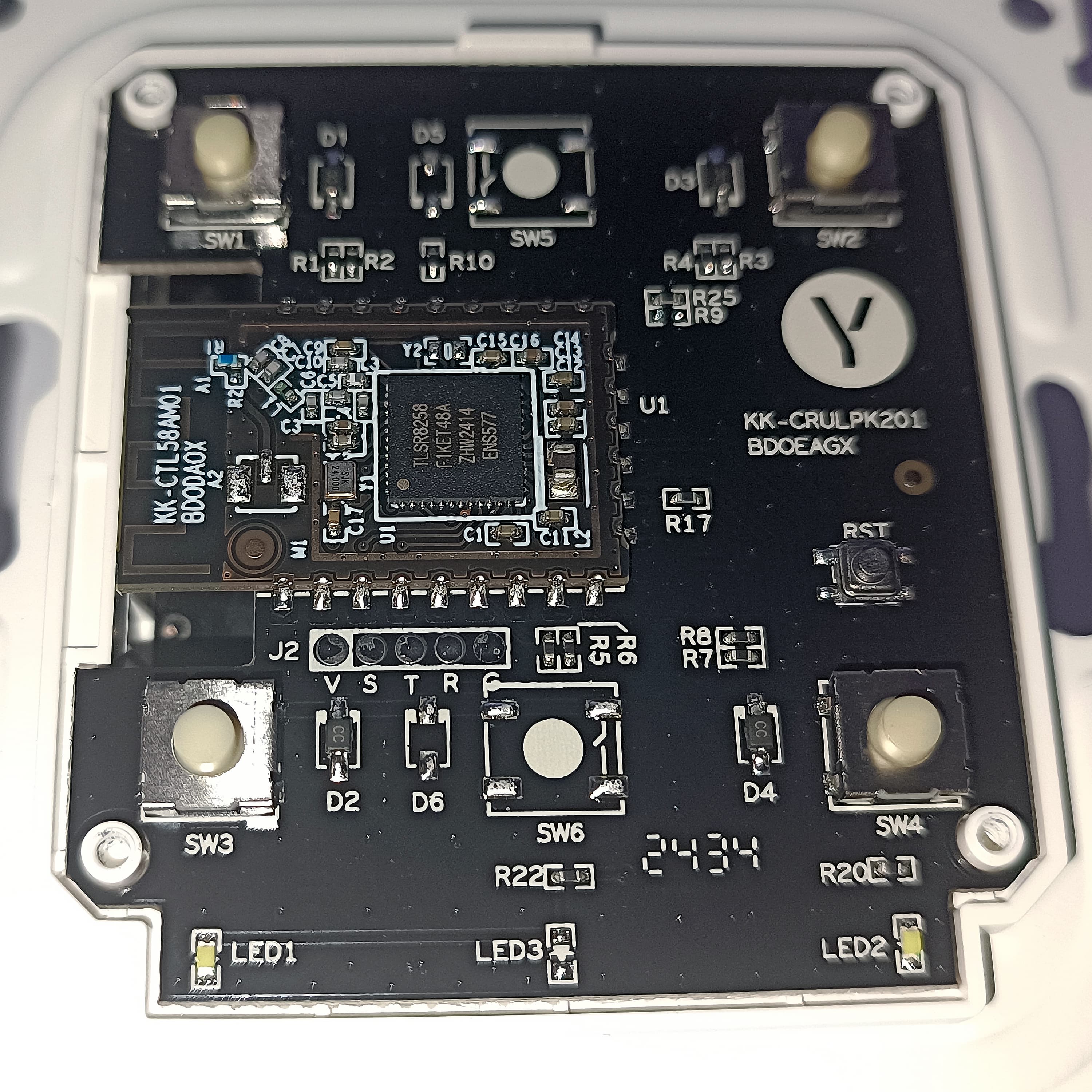 Базируются выключатели на уже знакомой нам SoC Telink TLSR8258, для примера покажем двухклавишный — оснащенный четырьмя кнопками.