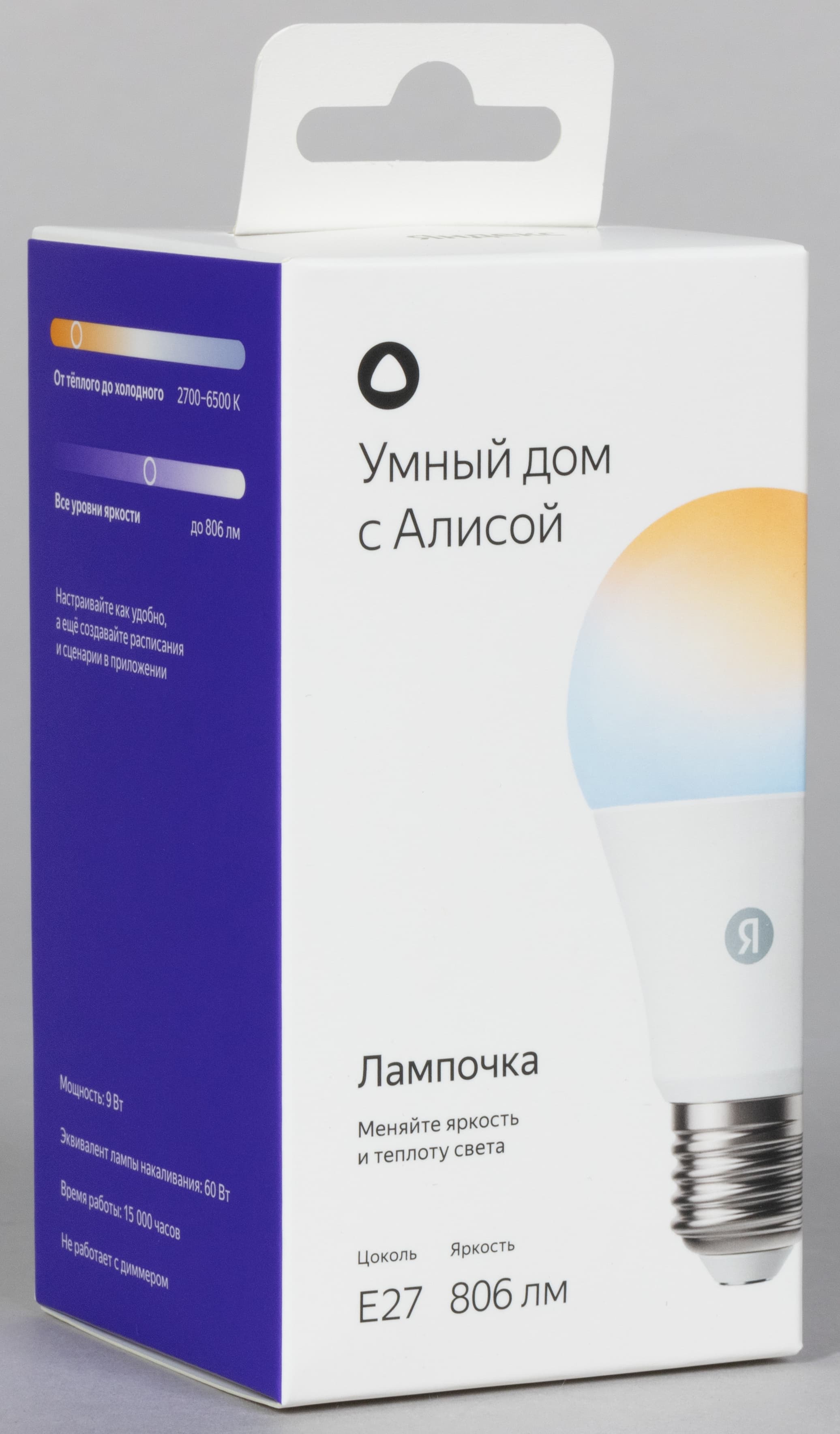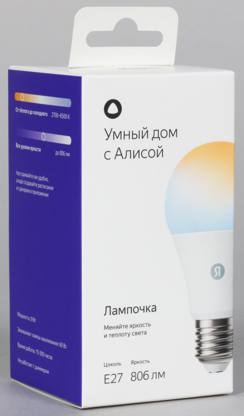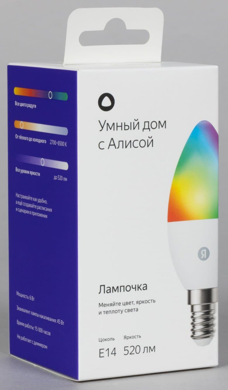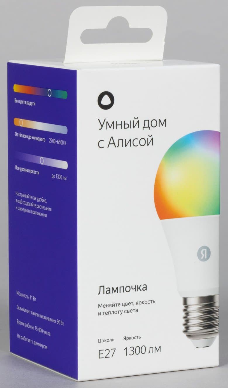 Две RGB-лампочки с цоколем E27 будем рассматривать совместно. Они не одинаковы внешне, обладают одними и теми же настройками в приложении, а отличаются только уровнем максимальной яркости. У YNDX-00553 она повышенная — до 1300 лм, у YNDX-00558 — стандартная, до 806 лм. Производитель приводит следующий ориентир: первая — эквивалент по яркости лампы накаливания мощностью 90 Вт, вторая — 60 Вт.