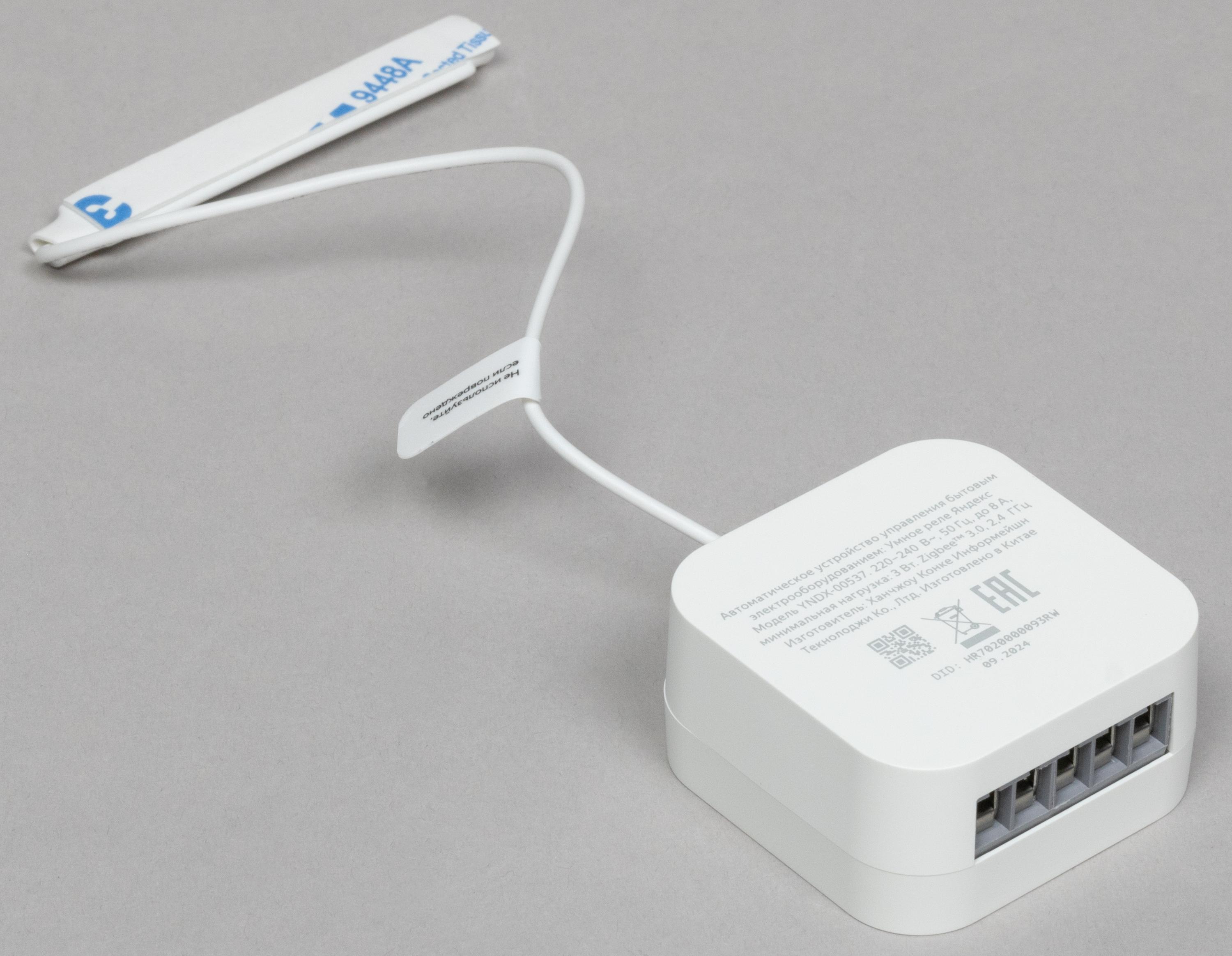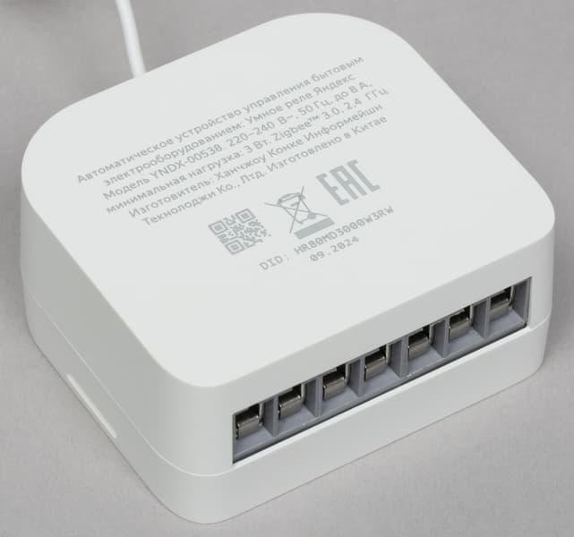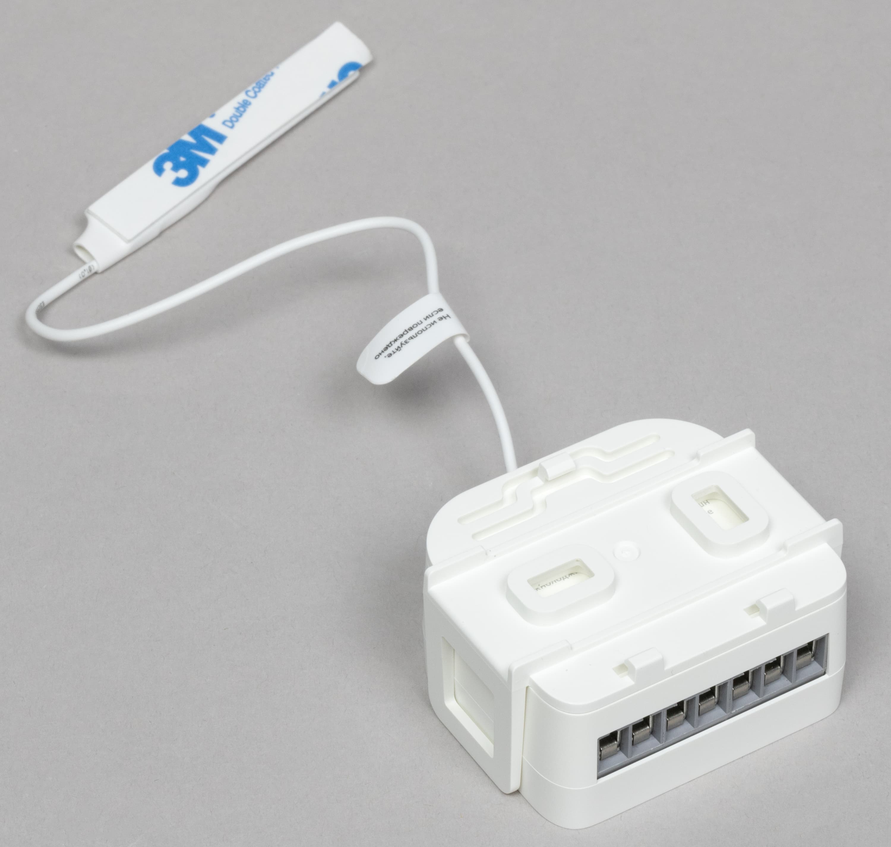 На верхней панели размещены винты крепления проводов в клеммах, а также кнопки запуска сопряжения с хабом, оснащенные светодиодным индикатором. Сами клеммы расположены сбоку.
