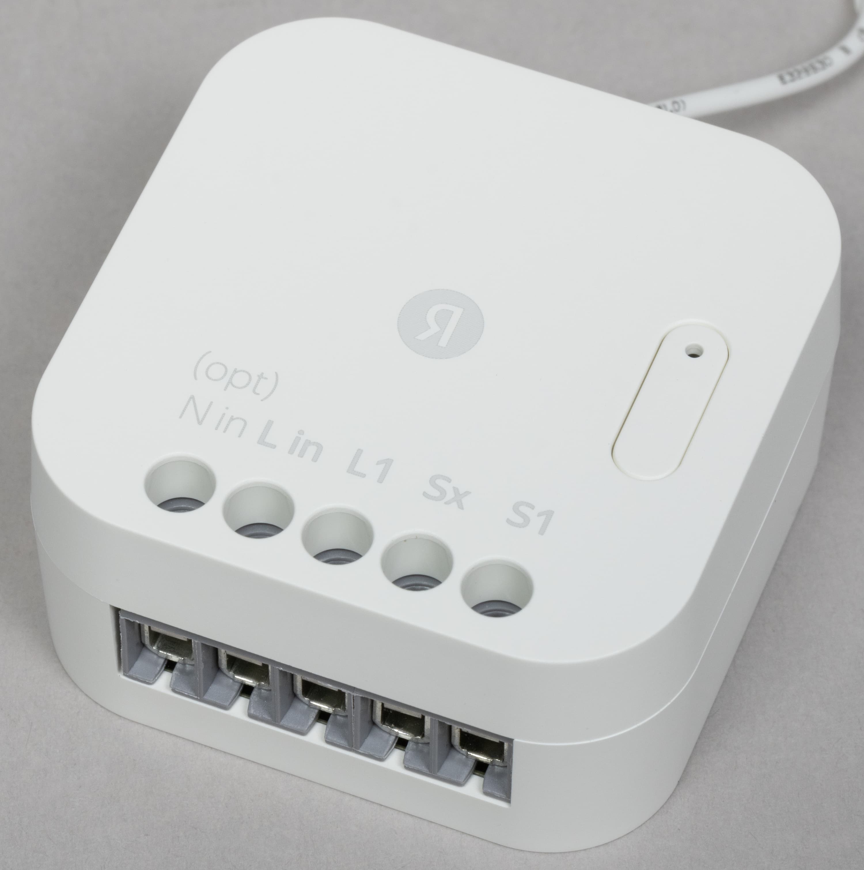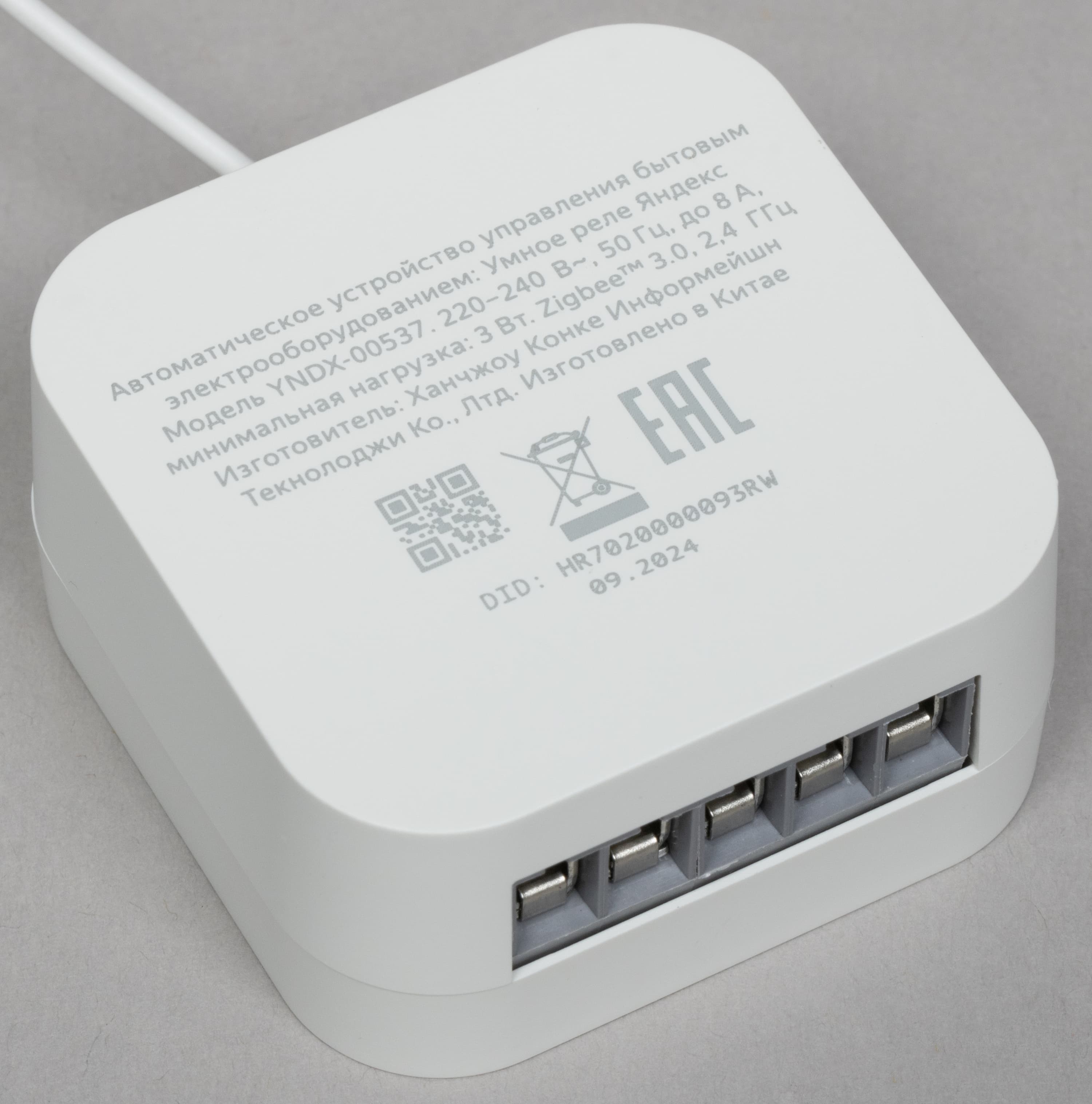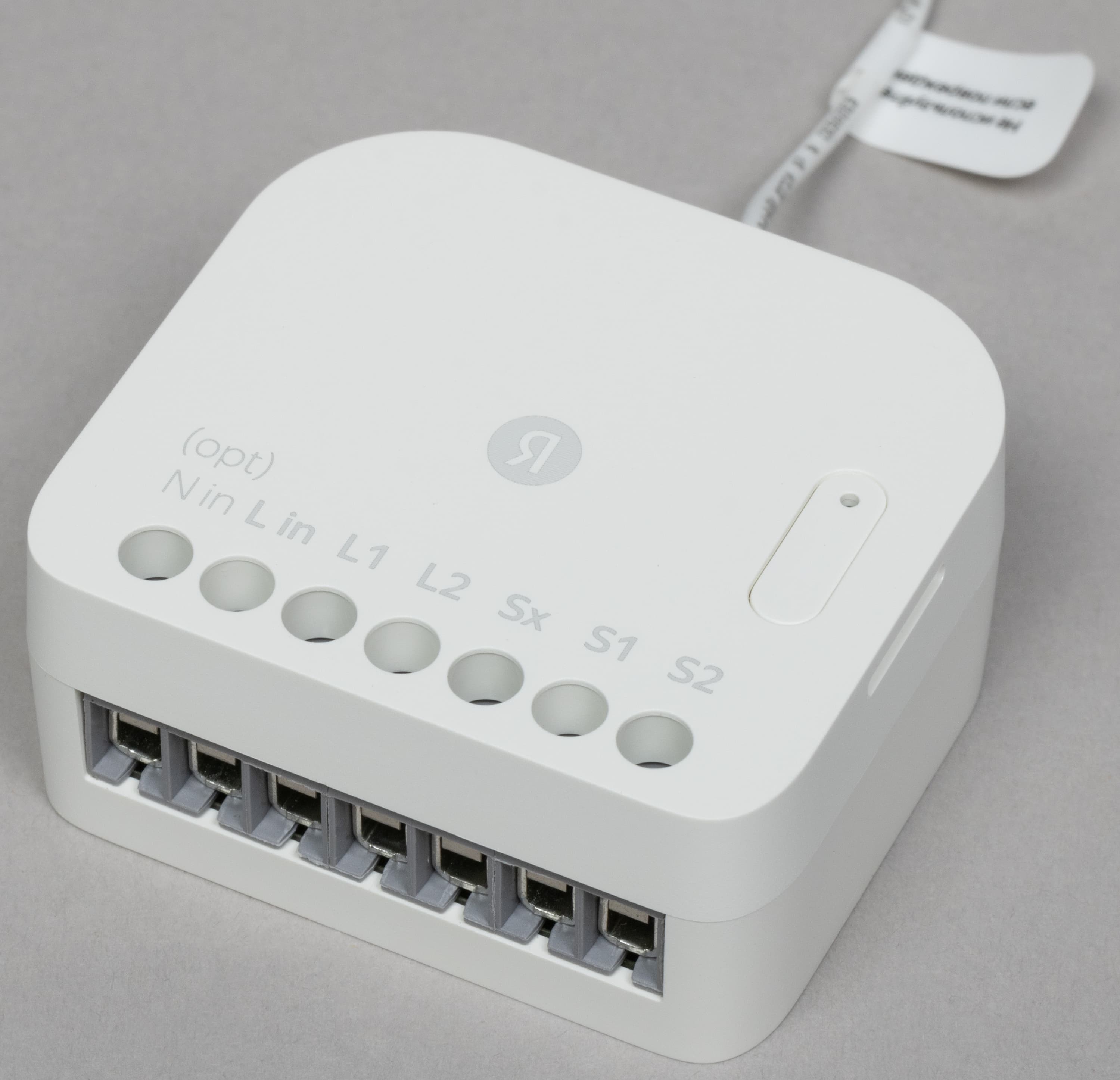 На верхней панели размещены винты крепления проводов в клеммах, а также кнопки запуска сопряжения с хабом, оснащенные светодиодным индикатором. Сами клеммы расположены сбоку.