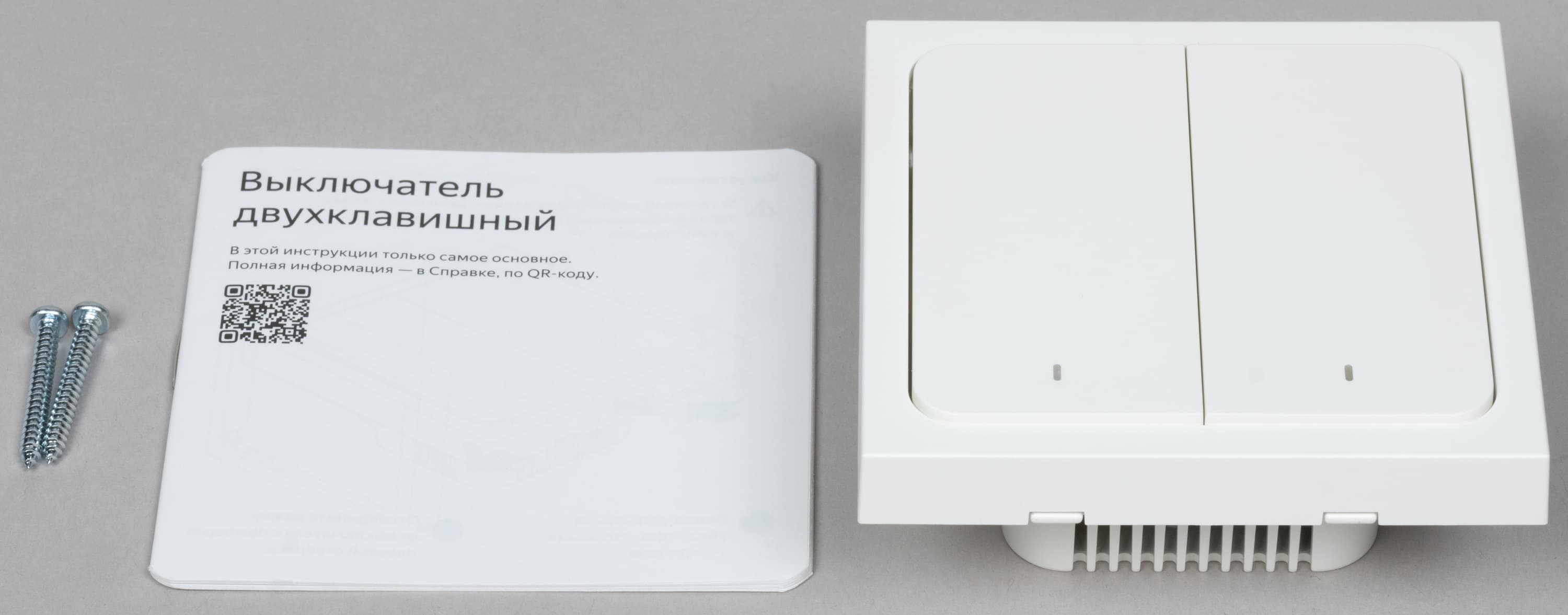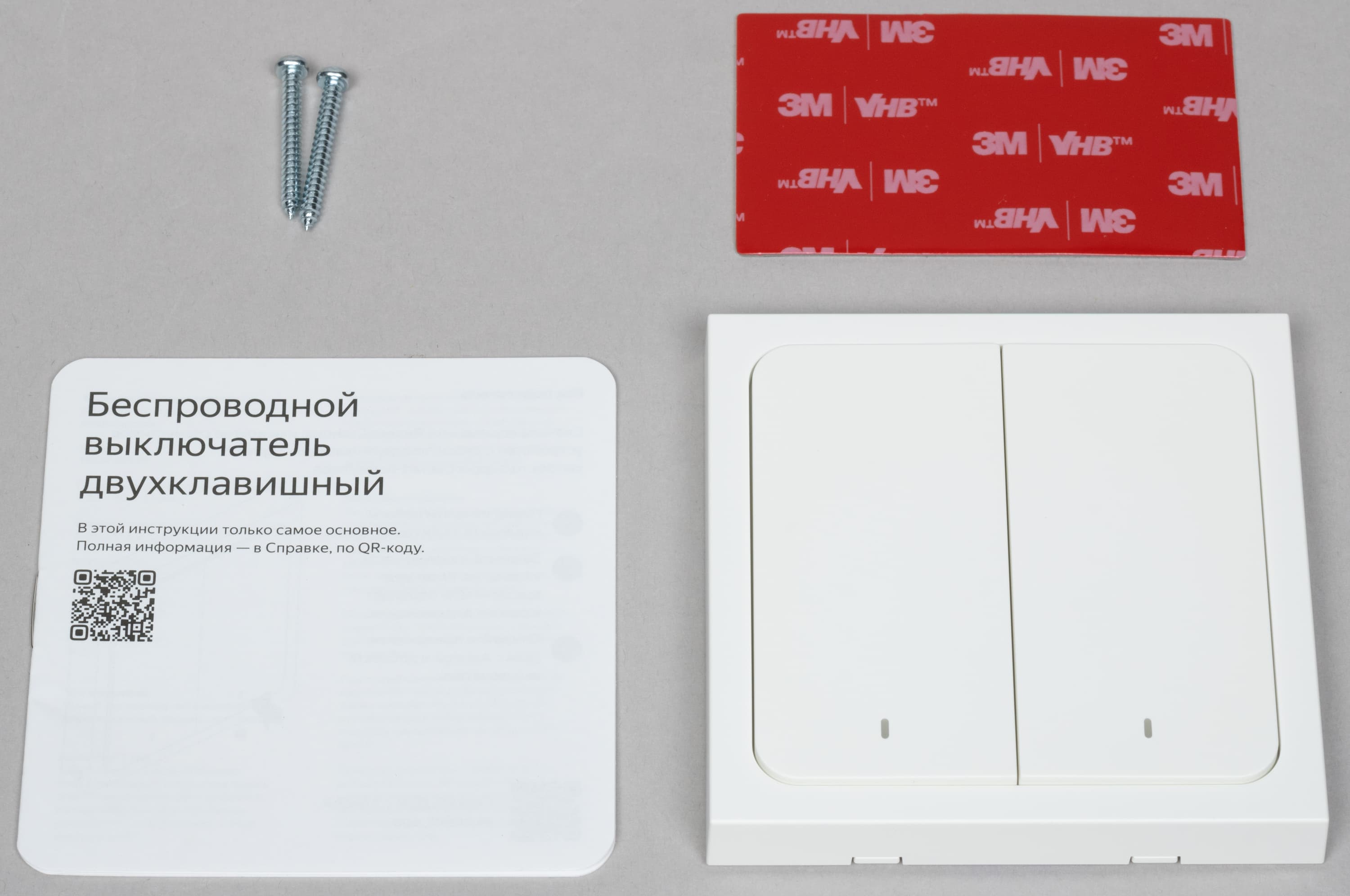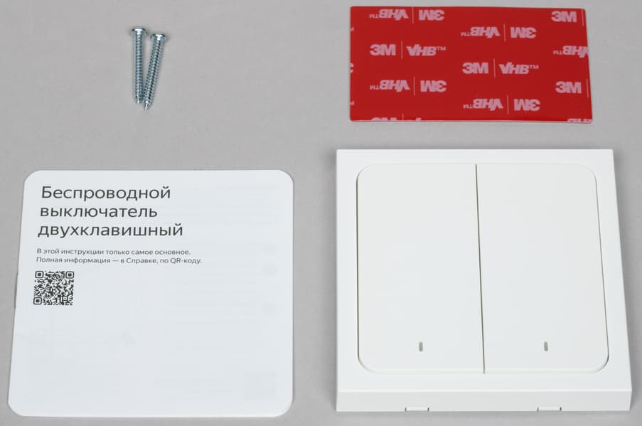 В комплект поставки входят сами выключатели, краткая инструкция, пара саморезов и двусторонний скотч для крепления.