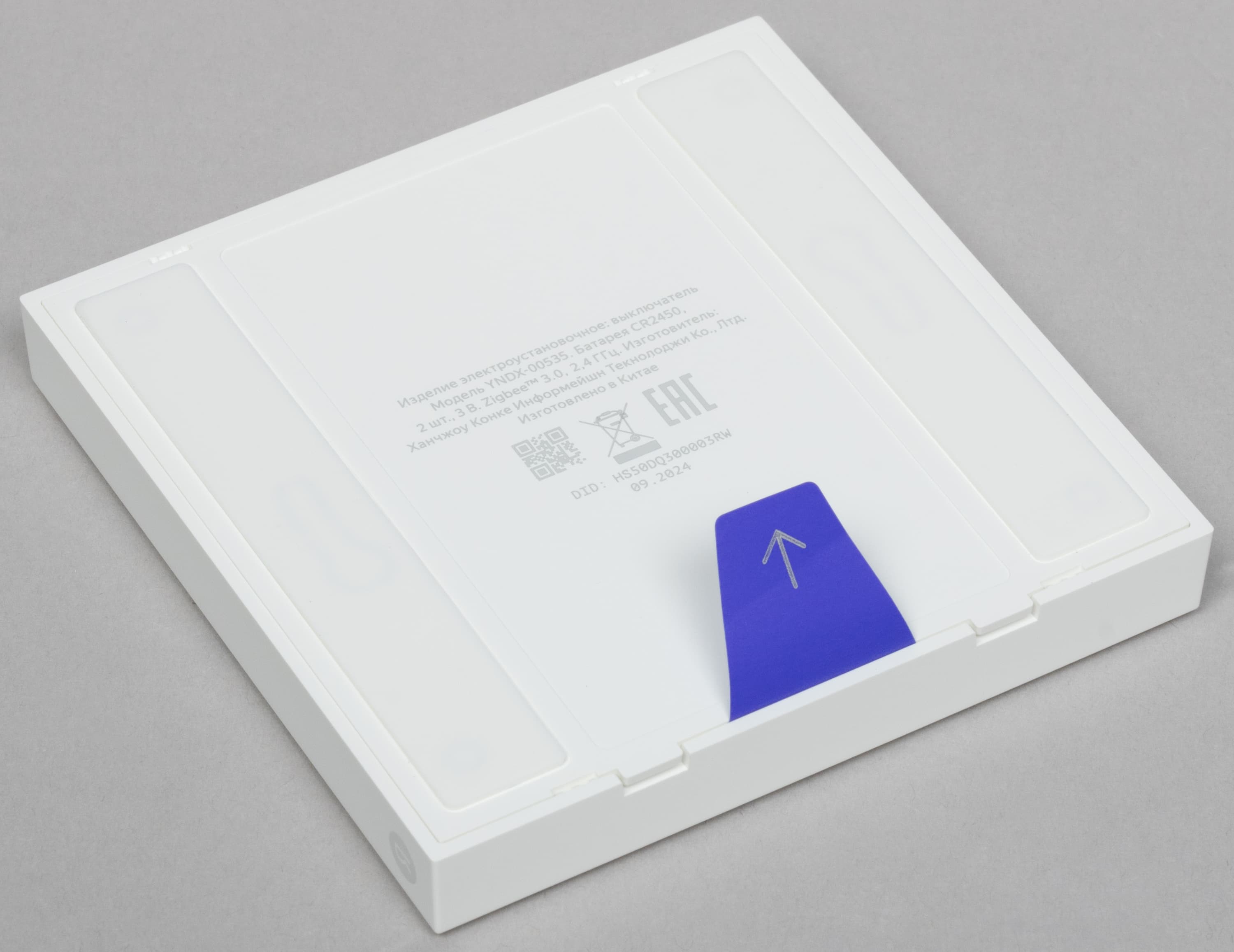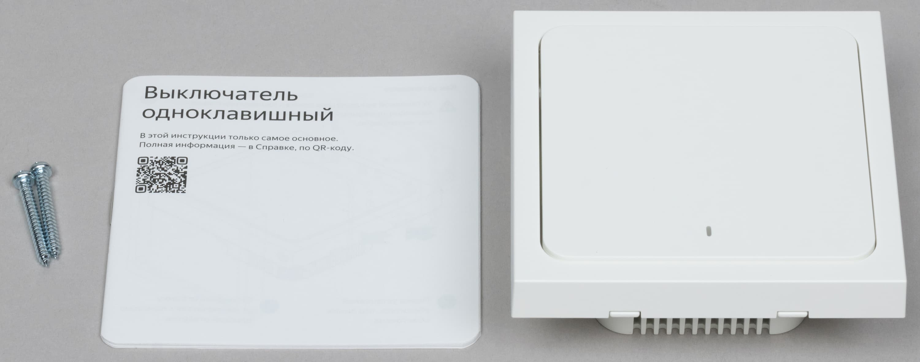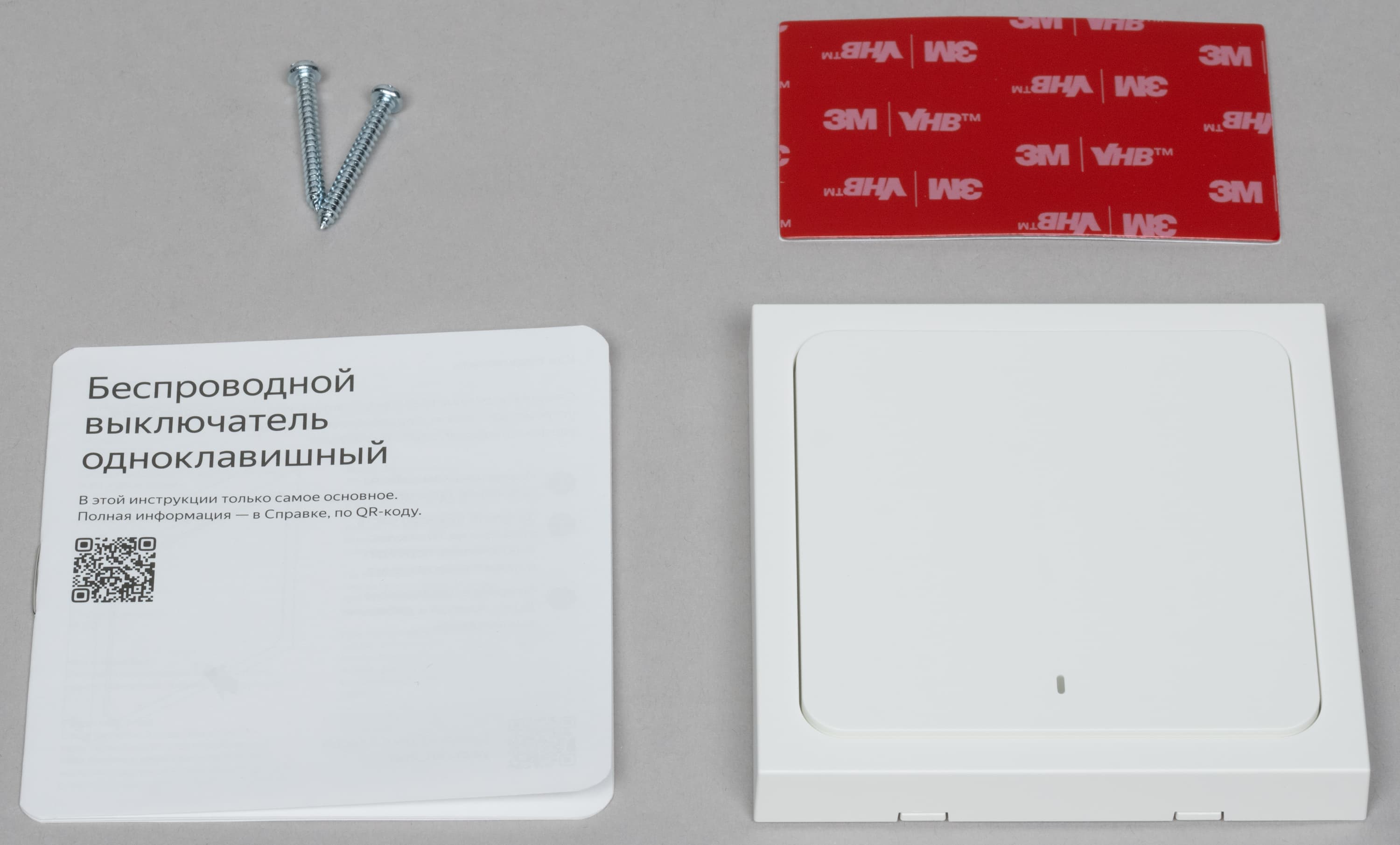 В комплект поставки входят сами выключатели, краткая инструкция, пара саморезов и двусторонний скотч для крепления.
