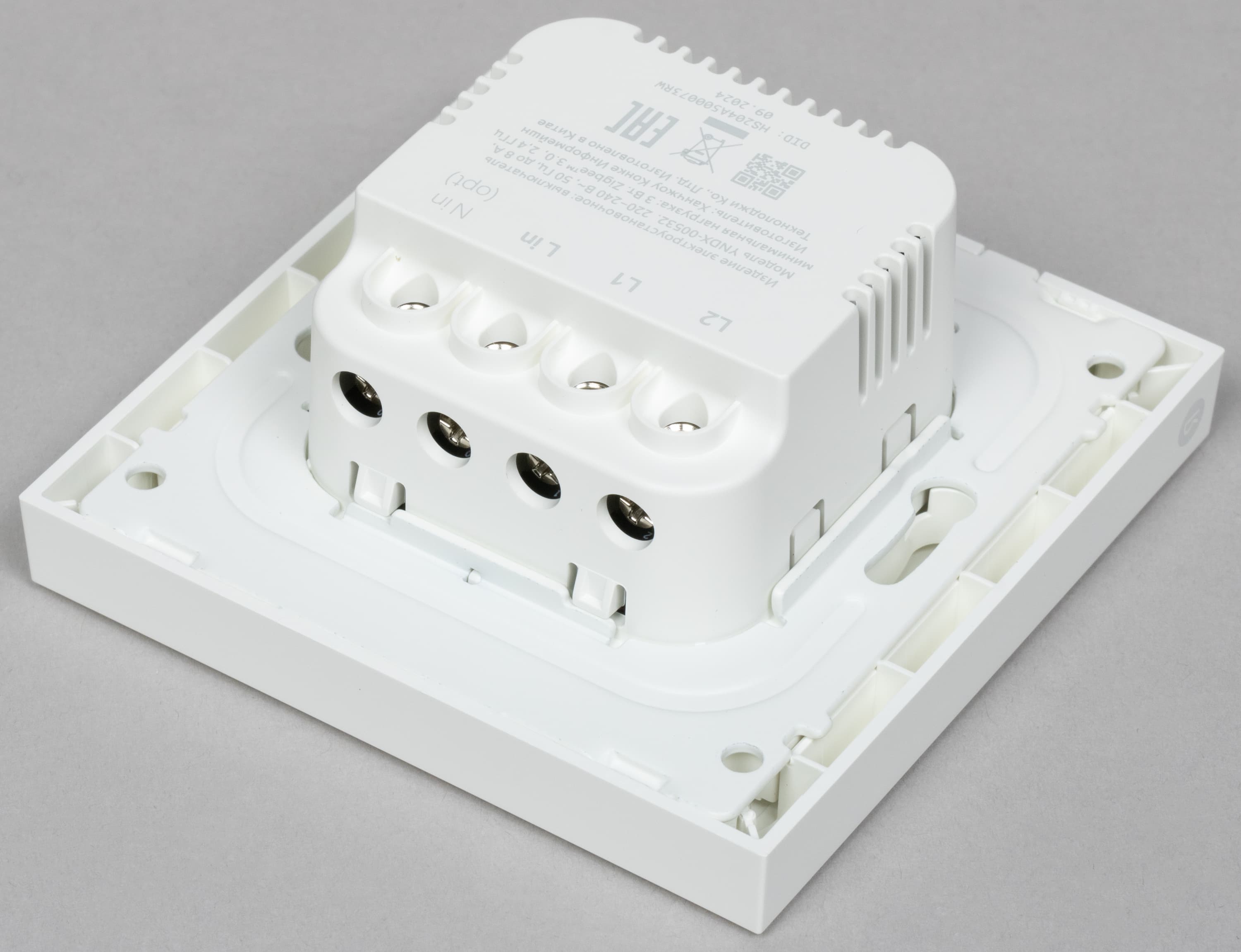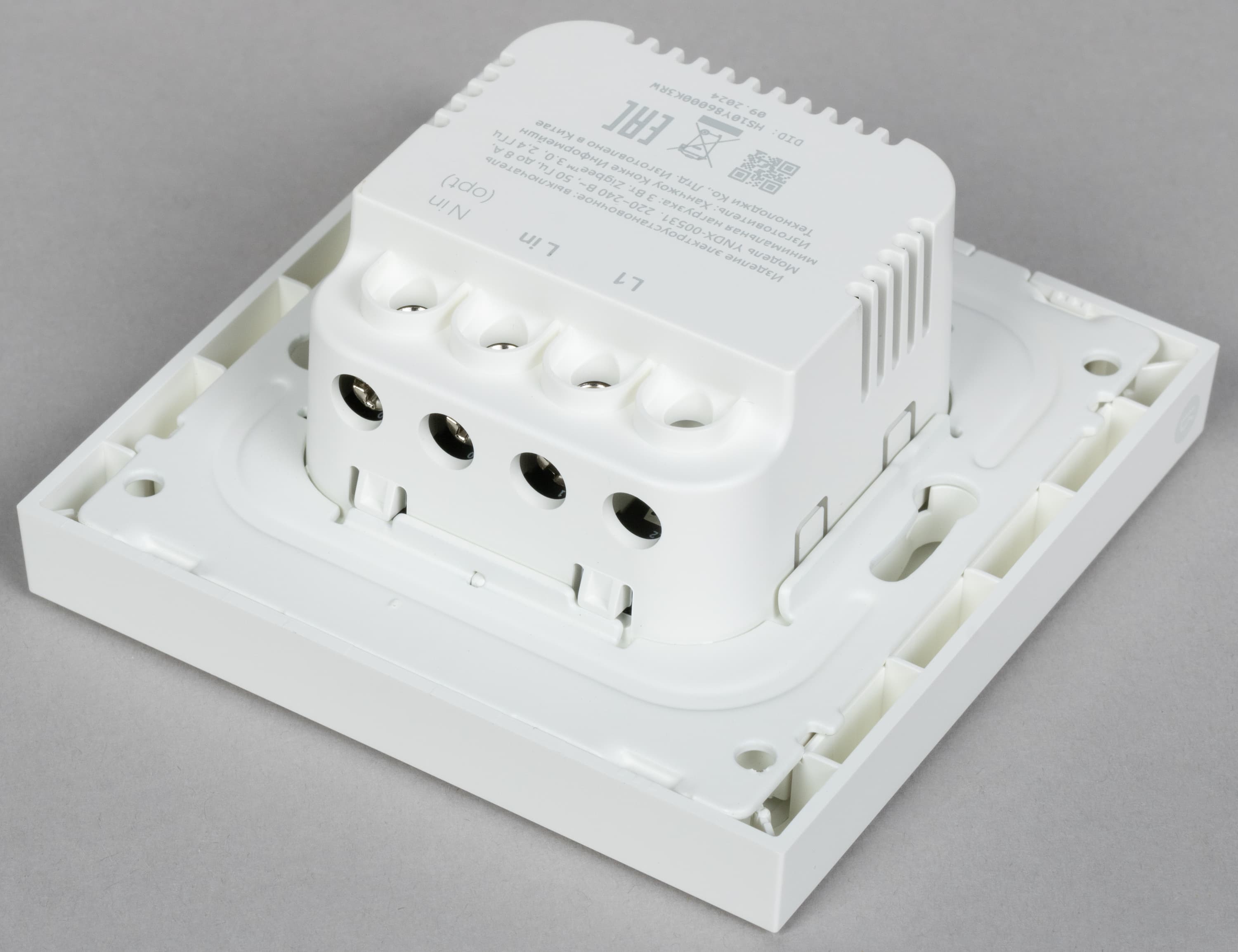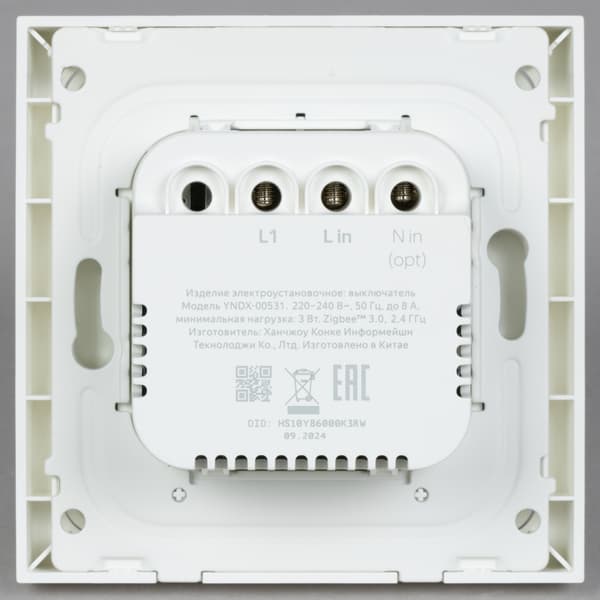 Сзади находится блок с электронной «начинкой» и клеммами для подключения. Для фиксации в подрозетнике предусмотрены «ушки» с отверстиями для саморезов.