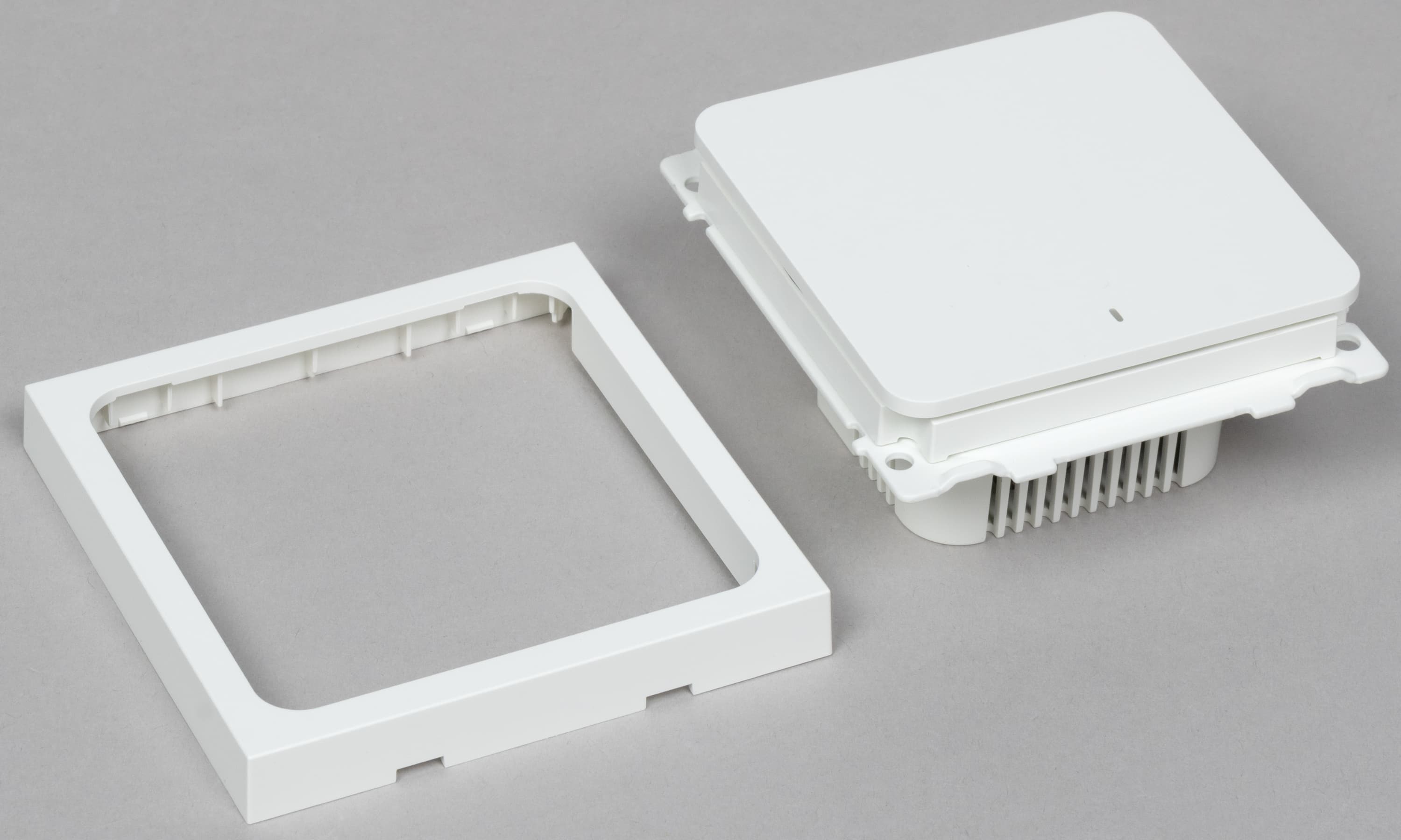 Конструкция разборная, рамка отделяется от корпуса при установке — всё как в «классических» выключателях.