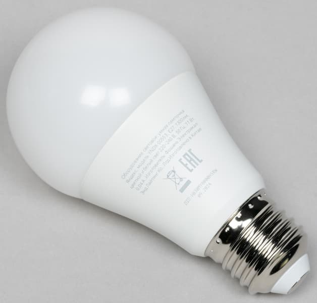 Внешне лампочки выглядят совершенно стандартно, размеры — ∅60×113 мм. Колба матовая, молочно-белого цвета. Качество сборки хорошее — швы аккуратные, сделано всё очень добротно. С одной стороны корпуса размещена техническая информация.