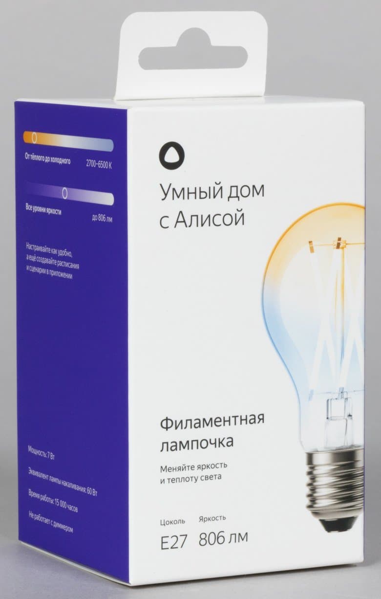 Наконец-то, появились в ассортименте «Яндекса» и филаментные смарт-лампы. Это хорошо по двум причинам. Во-первых, они красивые и могут выполнять декоративную функцию. А во-вторых, светят во все стороны. В традиционных светодиодных лампах используется один большой светодиод или несколько, прикрепленных к общему радиатору. Из-за этого они дают узконаправленный световой поток. Частично свет рассеивается за счет матового покрытия колбы, но полностью проблему это не решает — если повесить такую лампочку без дополнительных отражателей, часть комнаты может оказаться затемненной. У филаментных ламп этой проблемы нет, они излучают свет во всех направлениях, подобно лампам накаливания.