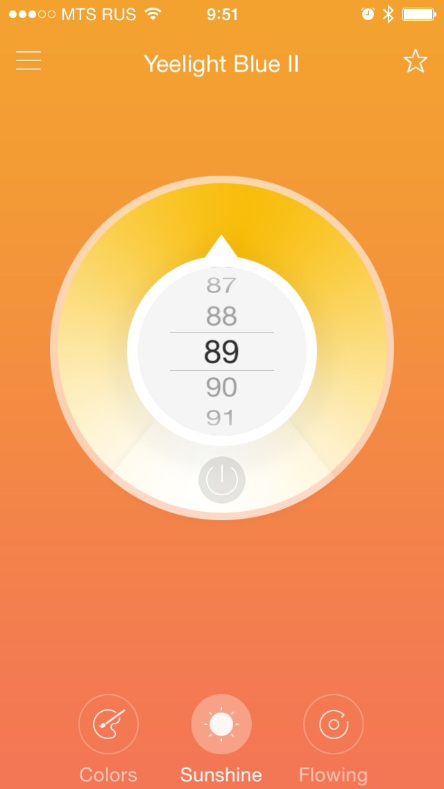 Второй экран, подписанный Sunshine, используется для работы с освещением белым цветом. Дизайн органа управления аналогичен первому экрану — в центре круга находится общий регулятор яркости, а цветовая температура выбирается по круговой шкале. Здесь тоже можно вывать пункт настройки включения или выключения с задержкой. Странно, но из состояния «выключено» запустить программу нельзя. В нем на экране присутствует только одна кнопка. Заметим, что выключение из программы запоминает последнее состояние лампы и при повторном включении выставляет именно его.
