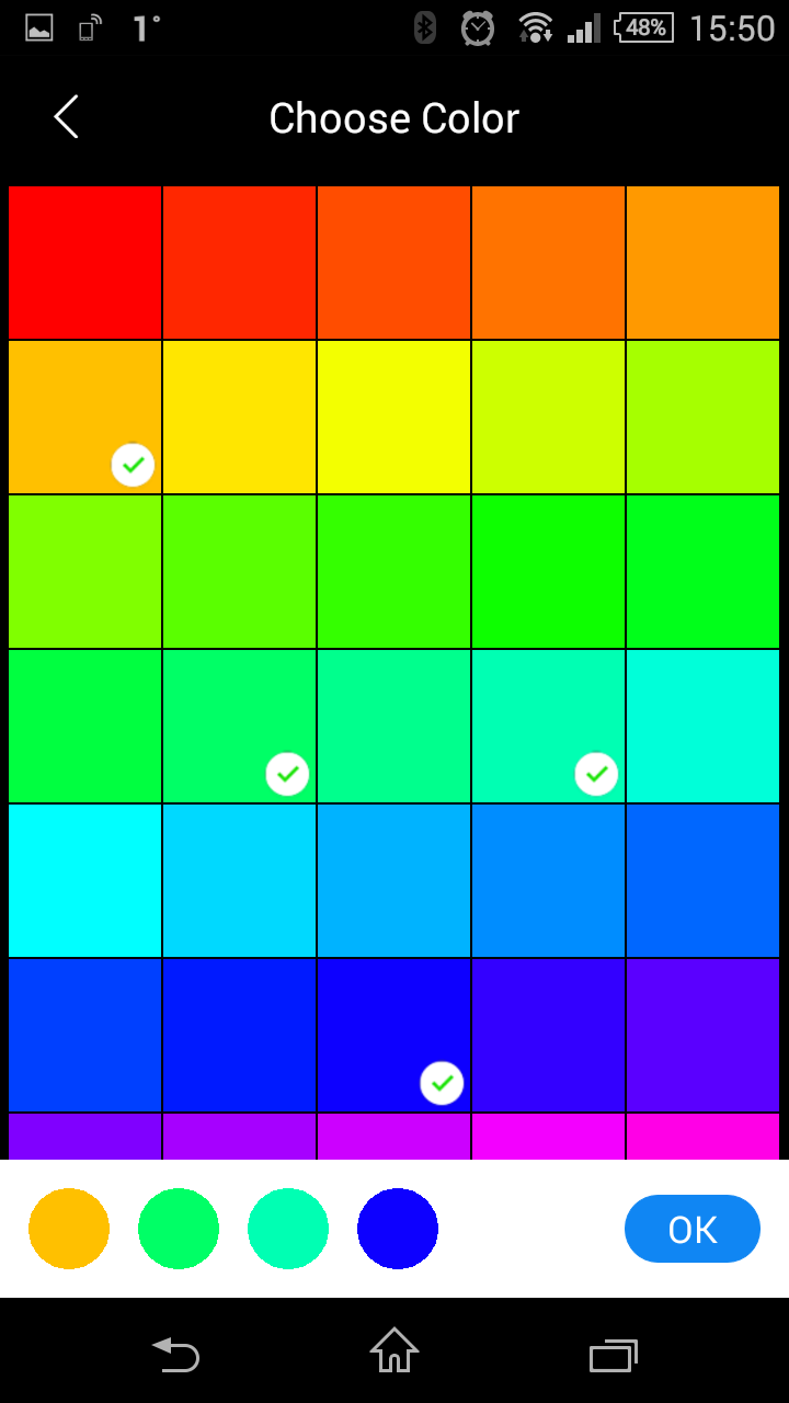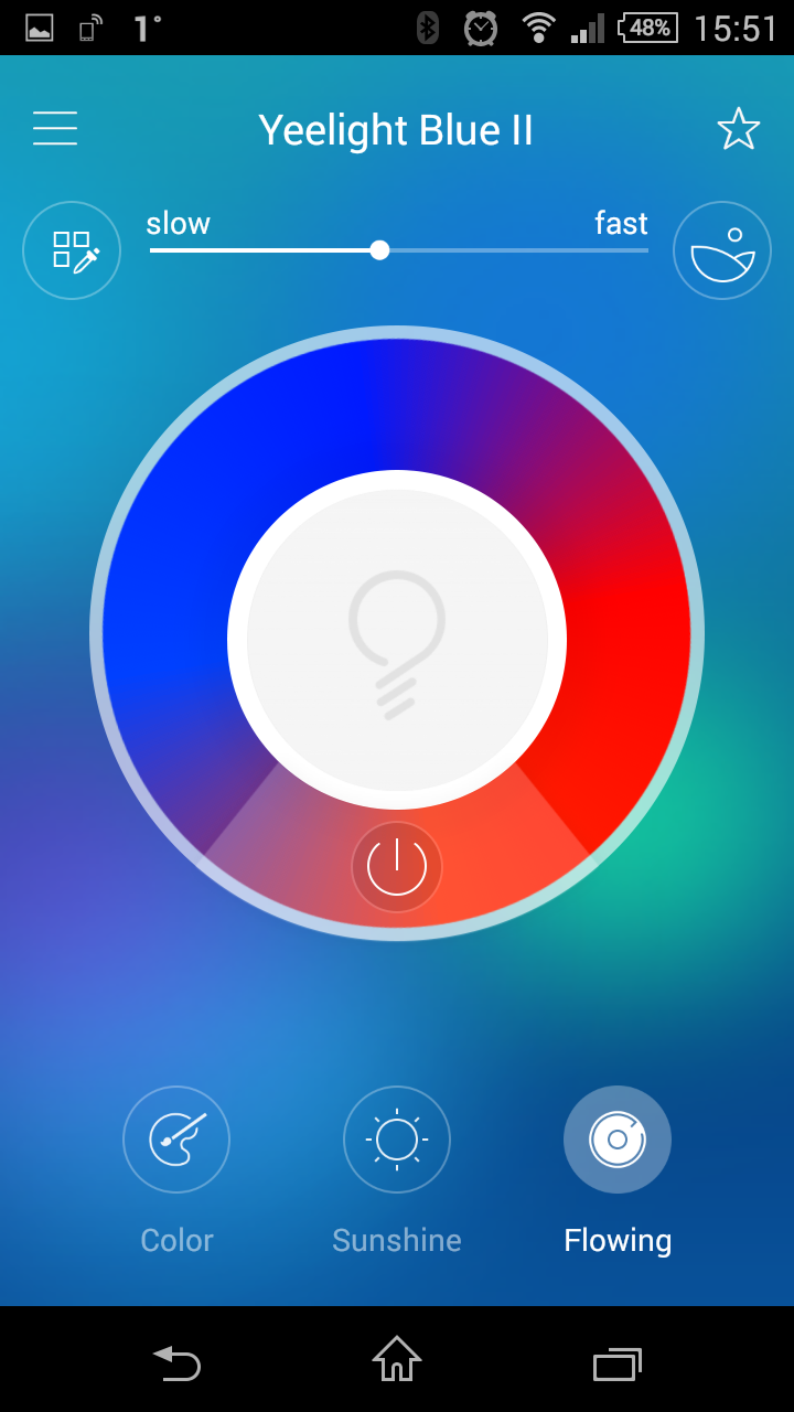 Третий режим работы лампы обеспечивает изменение цветов по программе. В верхней части находится слайдер установки скорости. Кнопка слева от него позволяет выбрать из палитры до четырех цветов, которые будут использоваться в данном режиме. Кнопка справа открывает галерею фотографий смартфона для подбора цветов анимации на основании анализа вашего изображения. Яркость в этом режиме не регулируется. Отметим, что заданная программа продолжает работу и после выключения приложения или удаления смартфона.