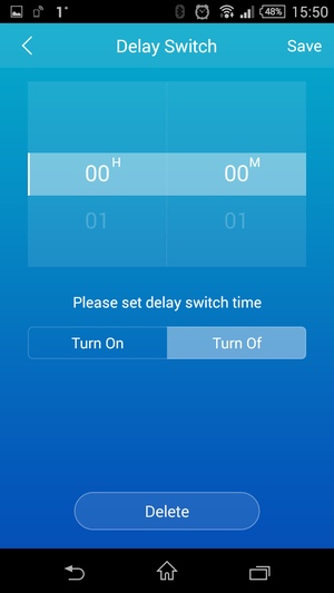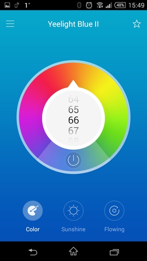 Первый экран, как и ожидается по его названию — Colors, предназначен для работы с цветом. Предусмотрен выбор яркости шкале от 1 до 100 в центральном поле и выбор цвета по круговой шкале. С одной стороны это просто и удобно, но с другой — может не обеспечить требуемую точность. В нижней части круга предусмотрена кнопка выключения. Длительное нажатие на нее открывает меню с установкой времени включения или выключения лампы. Это практически единственная автономная функция лампы, работающая со встроенным в нее таймером, если судить по наличию в протоколе команд с указанием задержки. Правда не удалось добиться включения лампы по расписанию в нужный режим или цвет. Вероятно, это является недоработкой в программе. В протоколе предусмотрена установка цвета включения, однако прямой его настройки в программе нет.