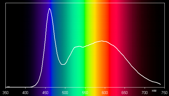 Эффективность лампы как источника света (световая отдача) заметно ниже лучших представителей среди светодиодных ламп двухлетней давности. Колориметрические характеристики хорошие, свет умеренно теплый и достаточно белый, спектр заполнен равномерно, то есть цветные предметы под светом этой лампы будут выглядеть более-менее в соответствии с их истинным цветом. Все это в варианте режима белого цвета с максимальной яркостью. Так выглядит спектр белого света: