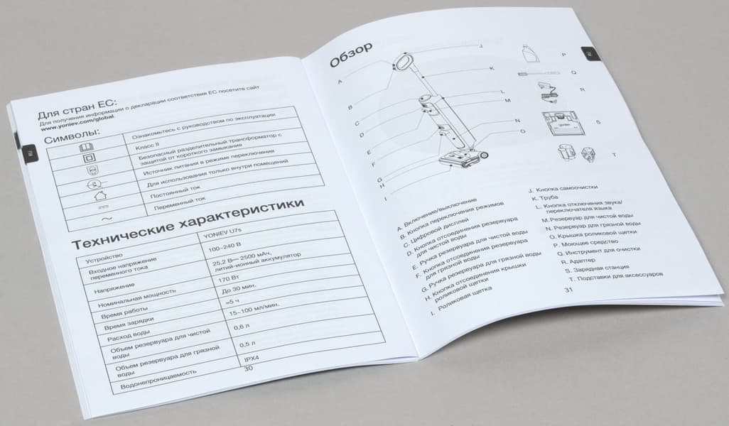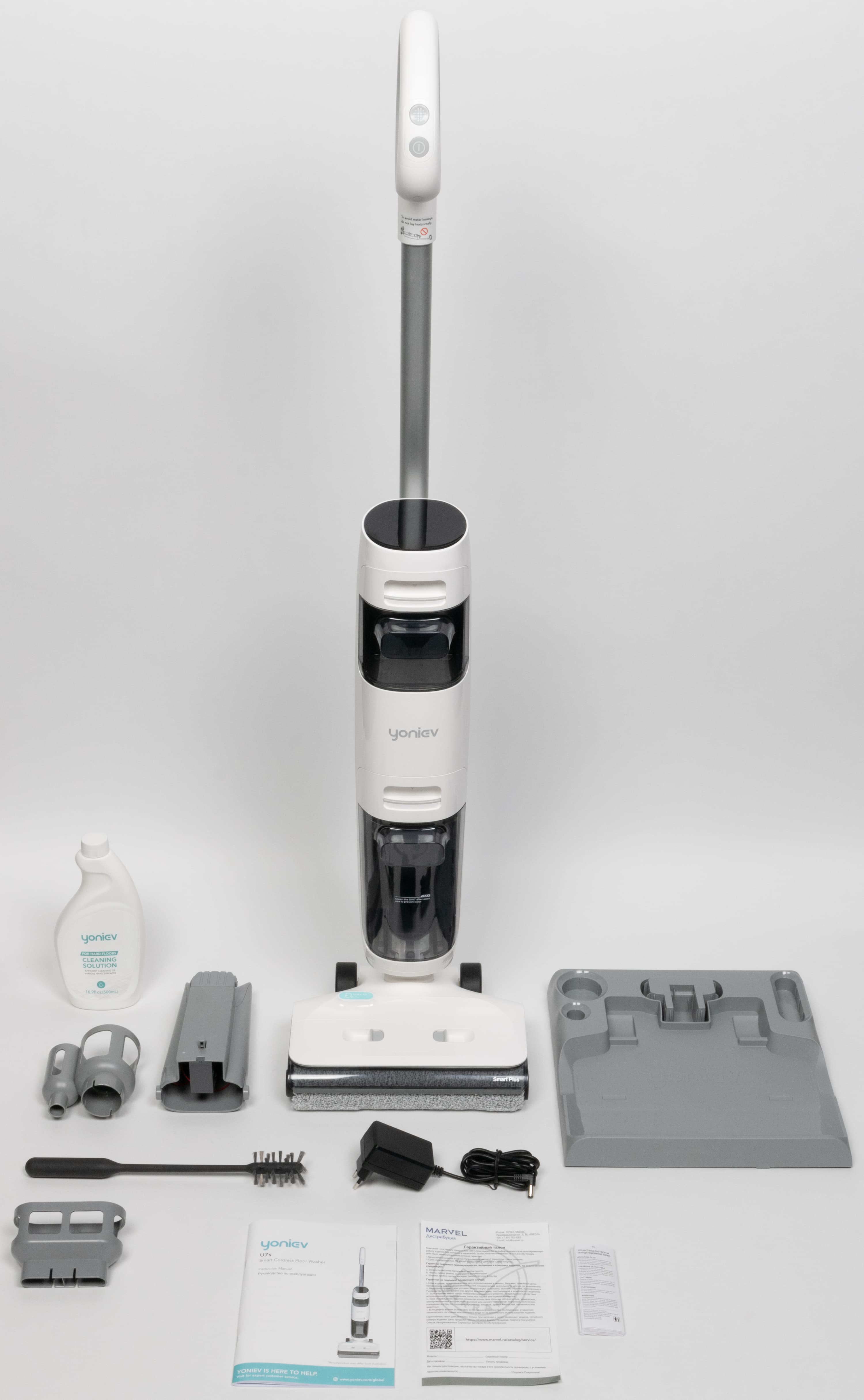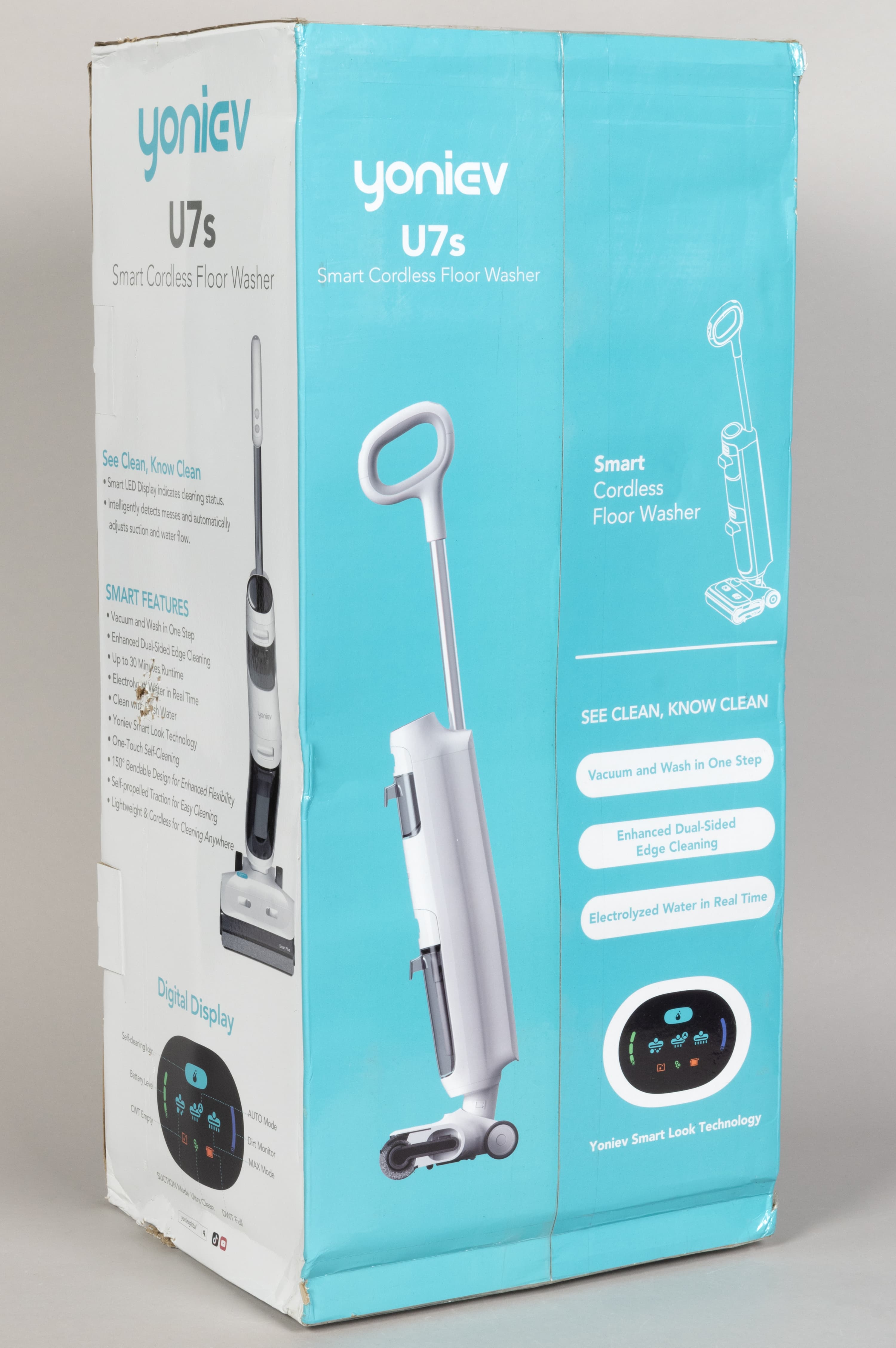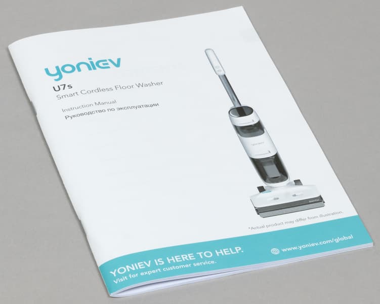 Yoniev U7s позволяет качественно, без разводов и подтеков, производить влажную уборку твердых напольных покрытий любого типа. Он удобно лежит в руке, а весь вес конструкции приходится на массивные обрезиненные колеса в задней части электрощетки.