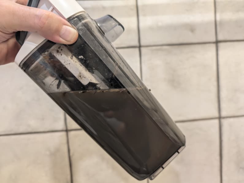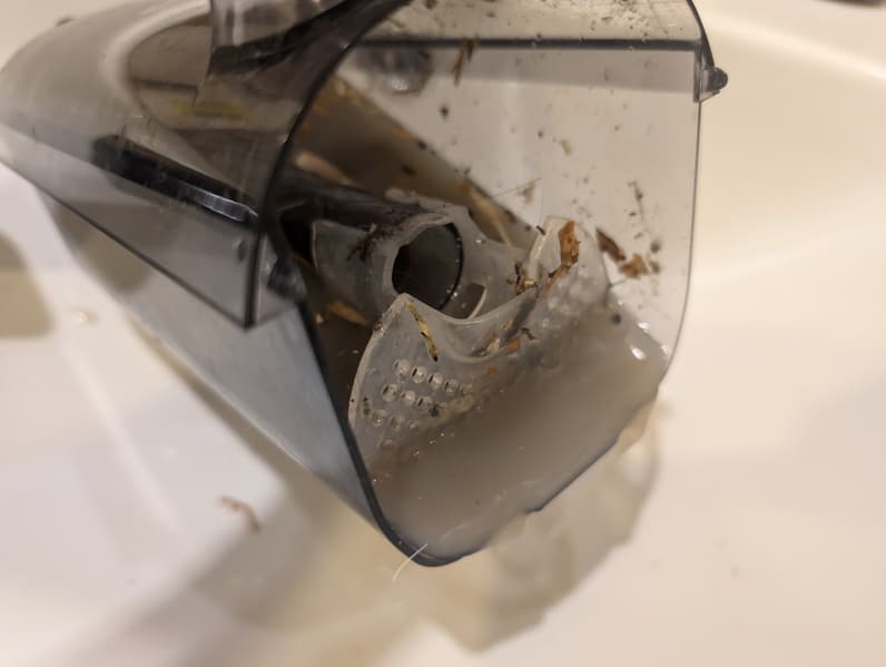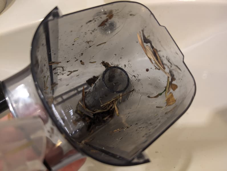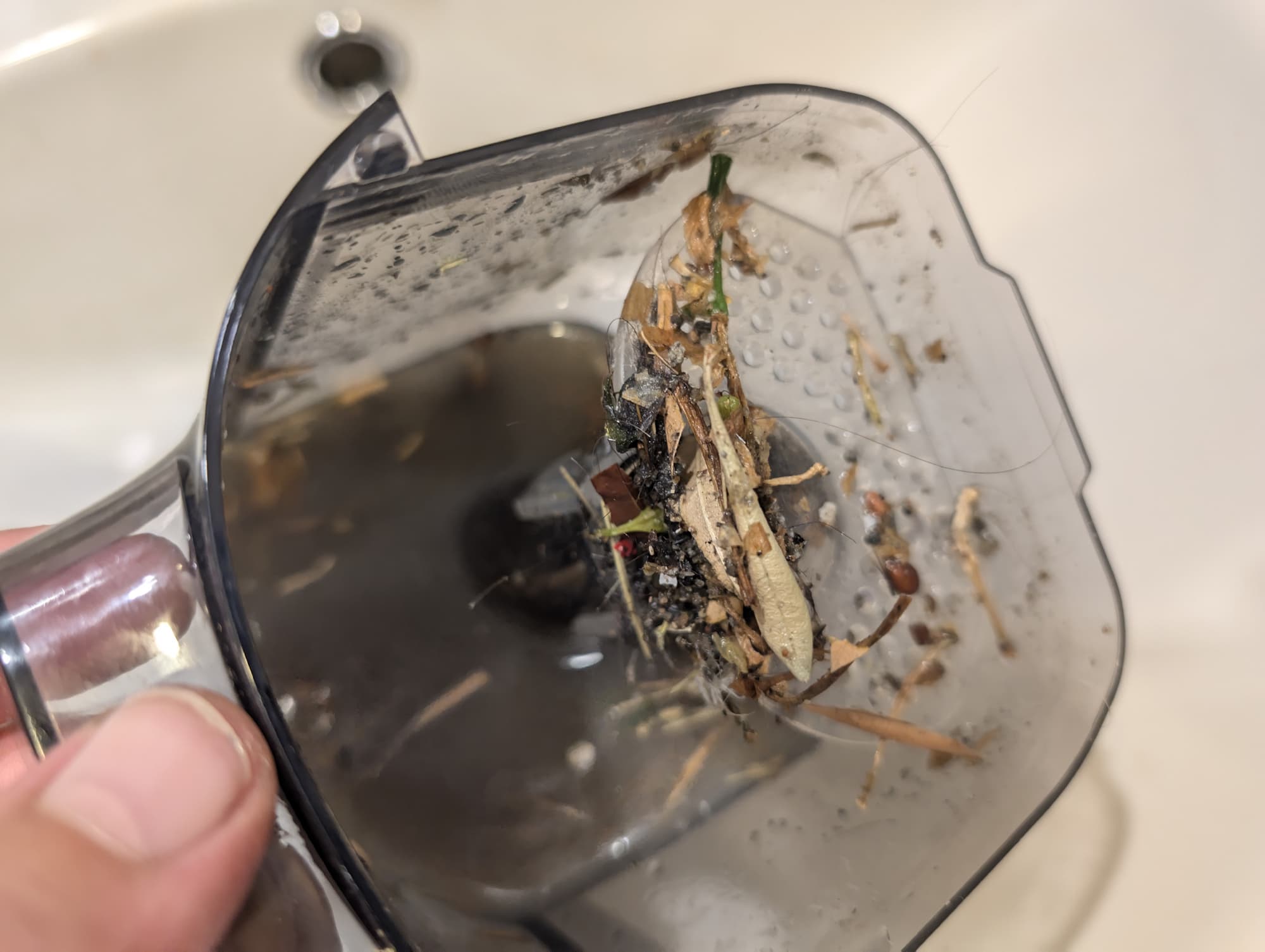 К недостаткам устройства мы относим не слишком эффективную систему фильтрации от крупного мусора: полностью очистить резервуар, не пачкая рук и не надевая перчаток, будет сложно.