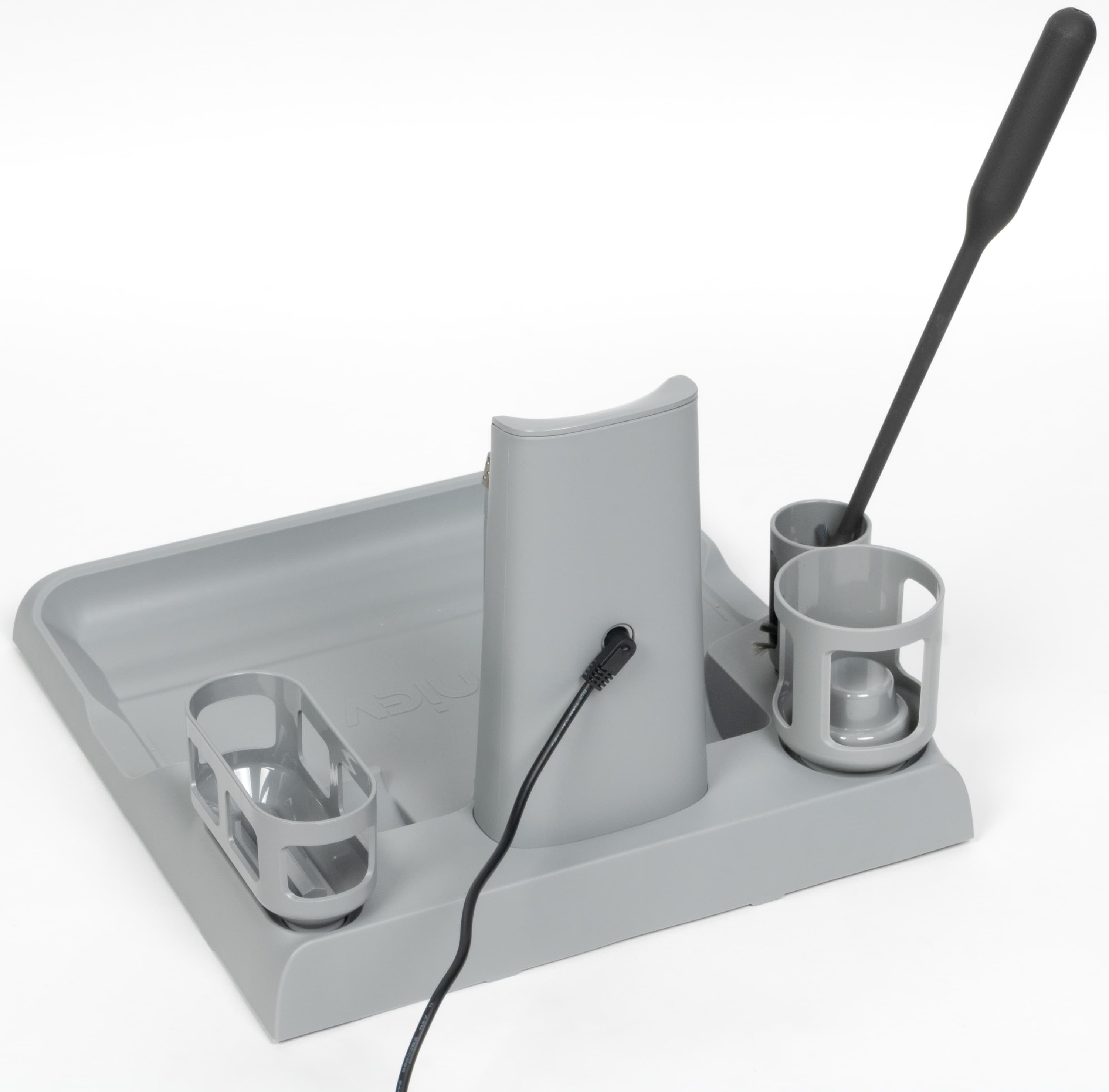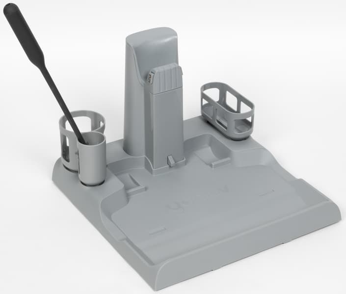 Базовая станция поставляется в разобранном виде. Она предназначена для самоочистки устройства, зарядки и хранения аксессуаров: круглые корзины слева используются для сушки ротора и хранения ершика, а в прямоугольном отсеке справа удобно разместить флакон с моющим средством.