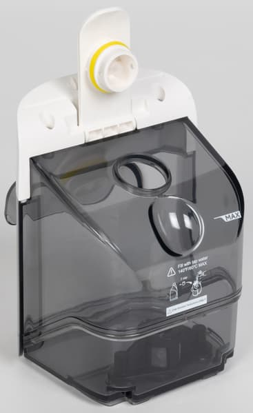 В верхней части корпуса находится емкость для чистой воды. При работе жидкость поступает на вращающуюся электрощетку, после чего вместе с потоком воздуха, мусором и пылью попадает в «грязный» резервуар.