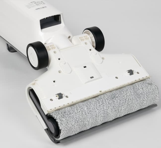 Основной вес пылесоса при уборке приходится на пару массивных обрезиненных колес в нижней части насадки. Шарнир электрощетки обеспечивает наклон до 150° — в таком положении удобно подметать и мыть под столами, стульями и прочими предметами обстановки.