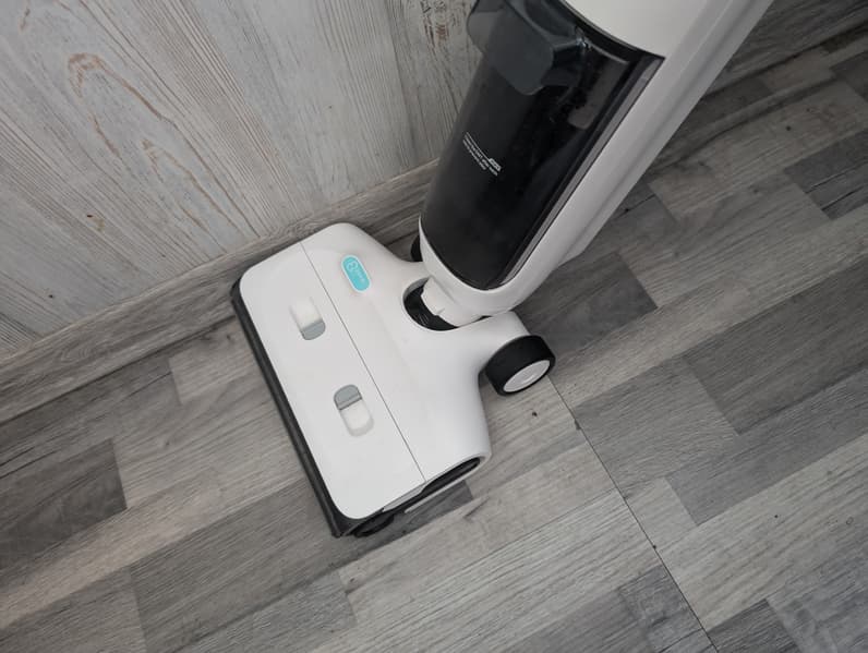 Как уже отмечалось, конструкция привода электрощетки обеспечивает почти полное отсутствие мертвых зон справа и слева: расстояние от края моющего ротора до торцевой стенки насадки составляет не более сантиметра. Это обеспечивает тщательную уборку вдоль стен и плинтусов.